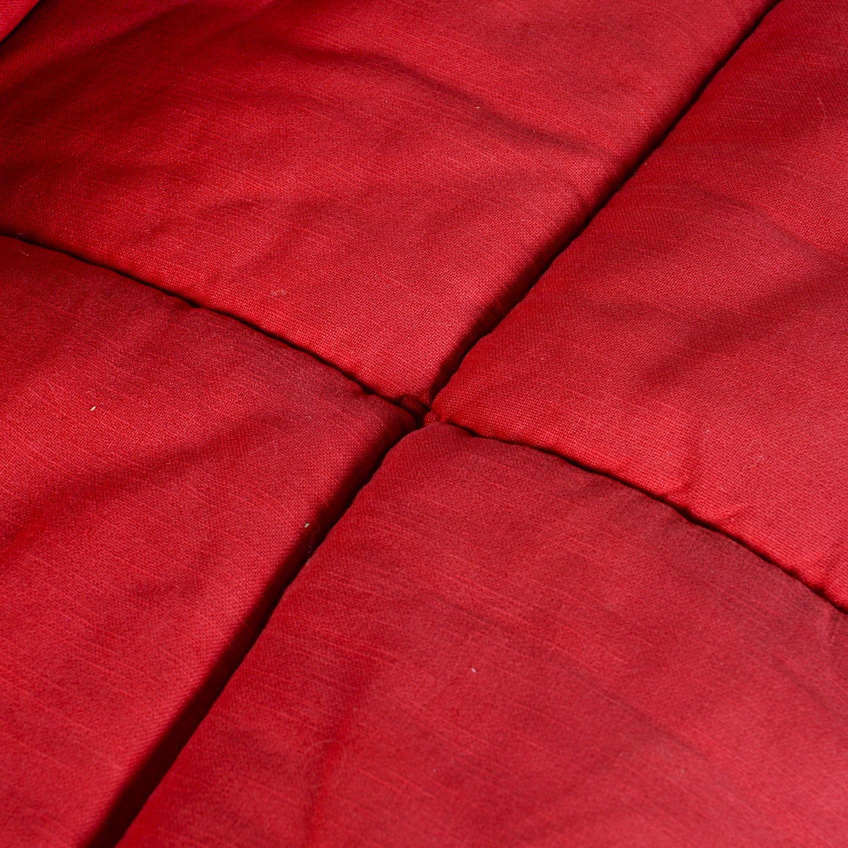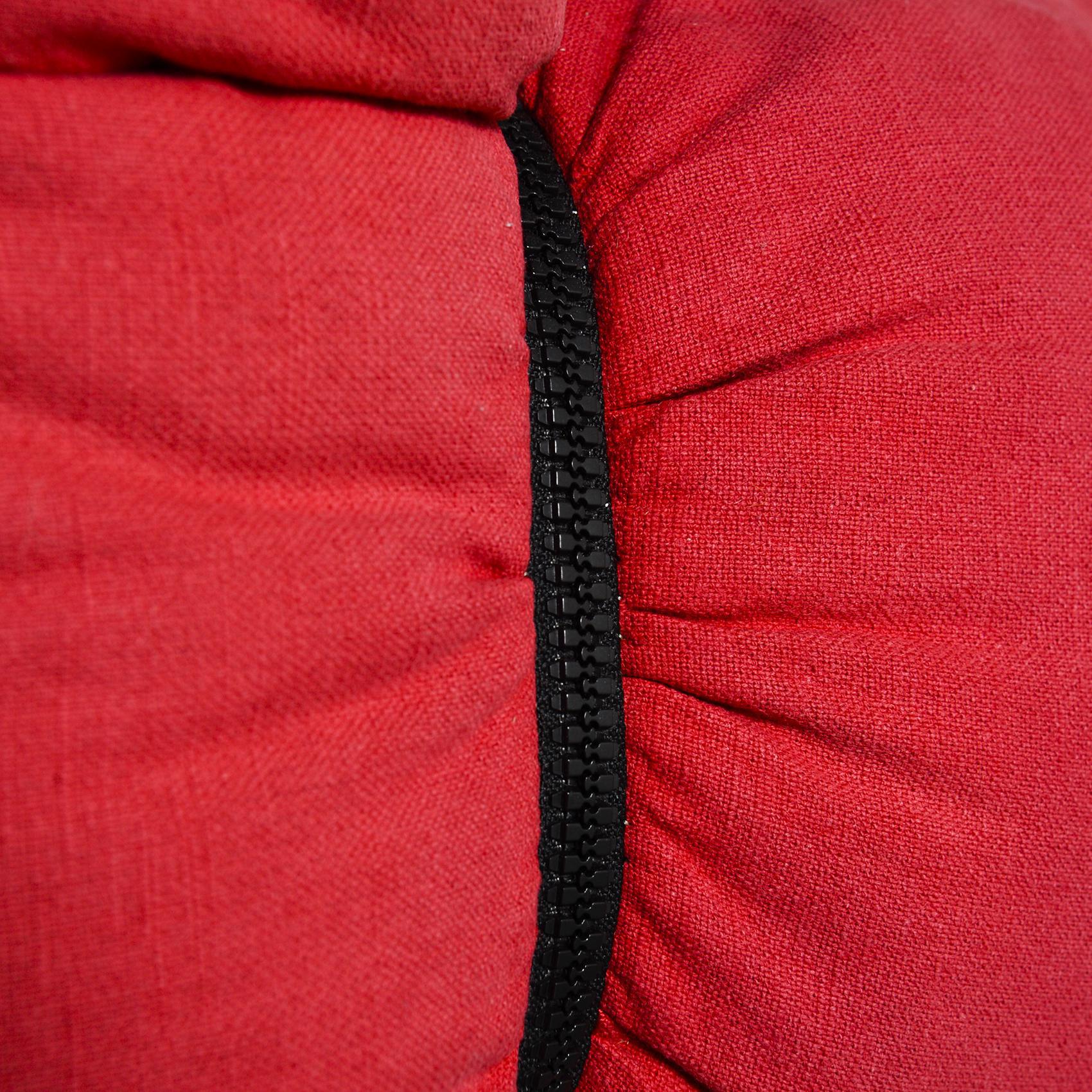 This is a first edition, preserved in its original state and in good original condition. The structure is made of metal covered with foam and wadding and upholstered in red textile with zips and beech wood legs.