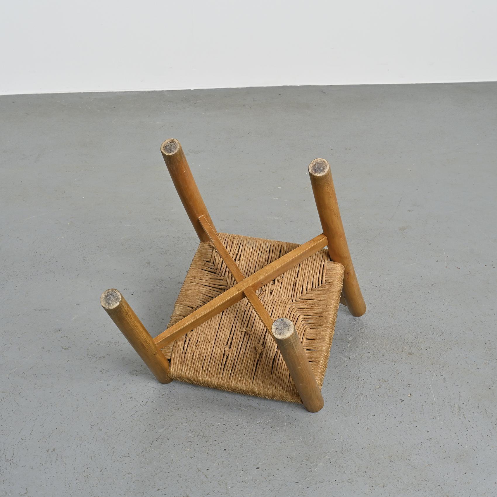 Its beechwood frame is entirely handcrafted, it consists of four round legs connected by an X-shaped brace, a curved backrest, and the original straw seat in excellent condition.
