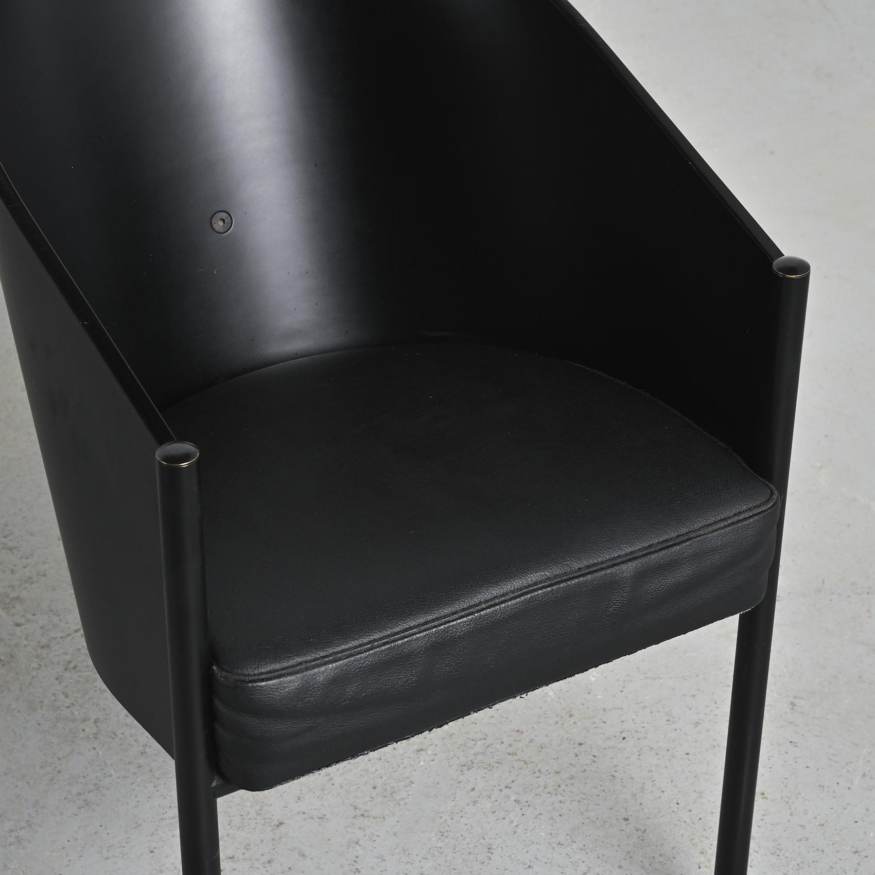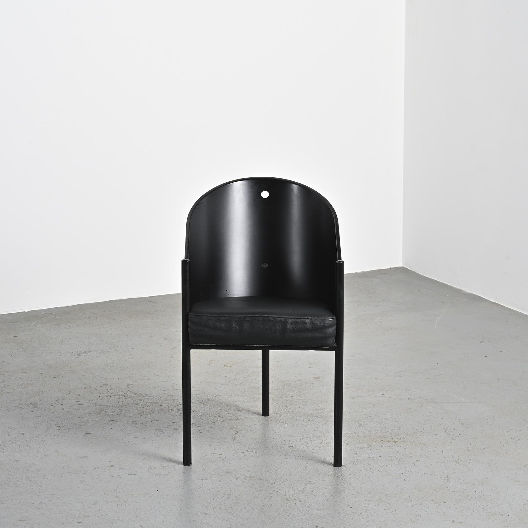 Tubular black lacquered steel frame, curved plywood shell with black finish, fixed cushions upholstered in black leather. Originally designed for Café Costes in Paris, the chair embodies Starck's pursuit of both function and elegance - only three legs to make cleaning and circulation easier, a carefully studied ergonomics, and a timeless, instantly recognizable form. Later editions added a hole in the backrest for easy handling.
