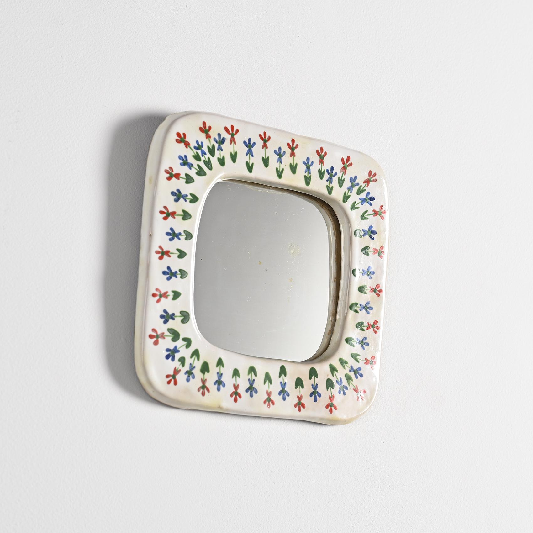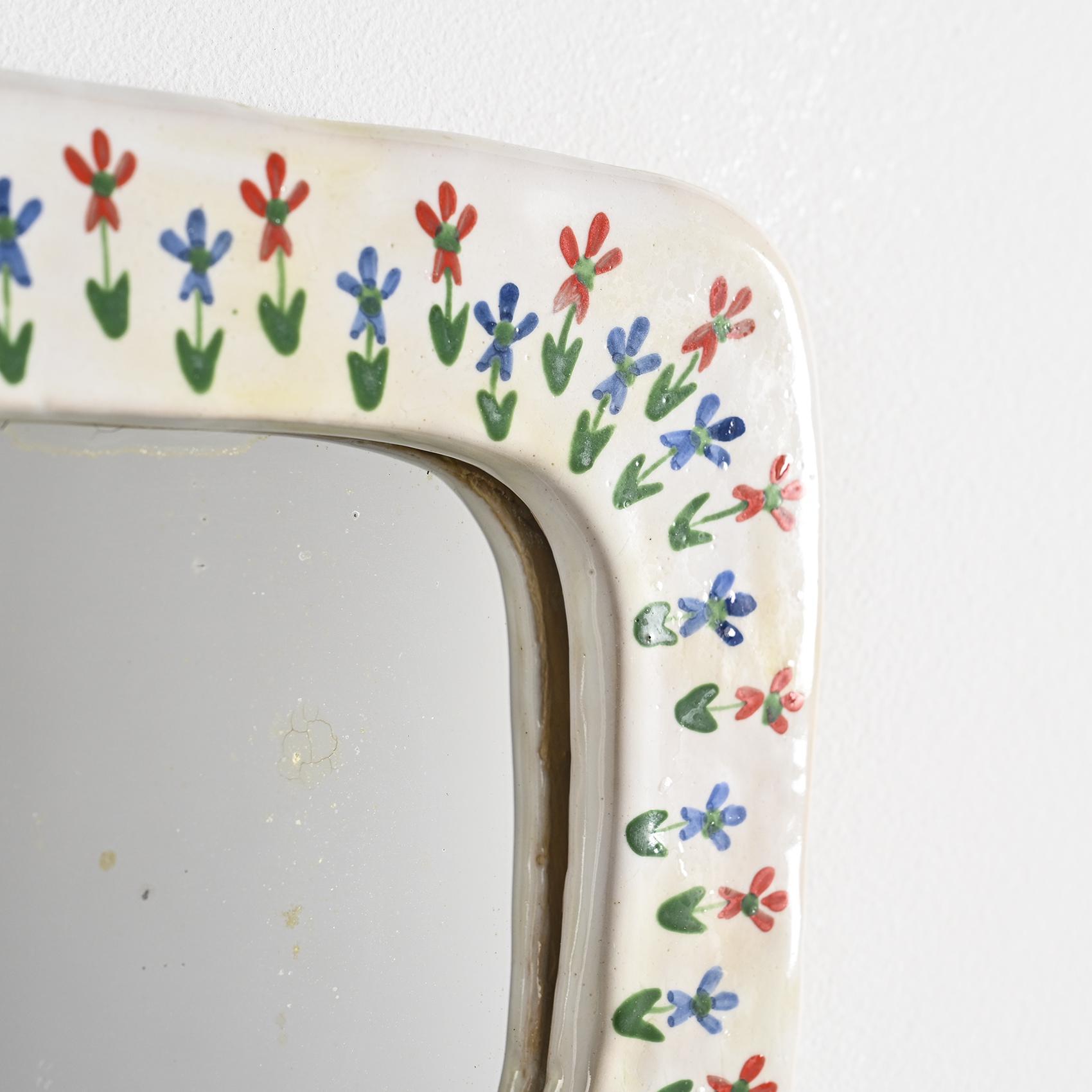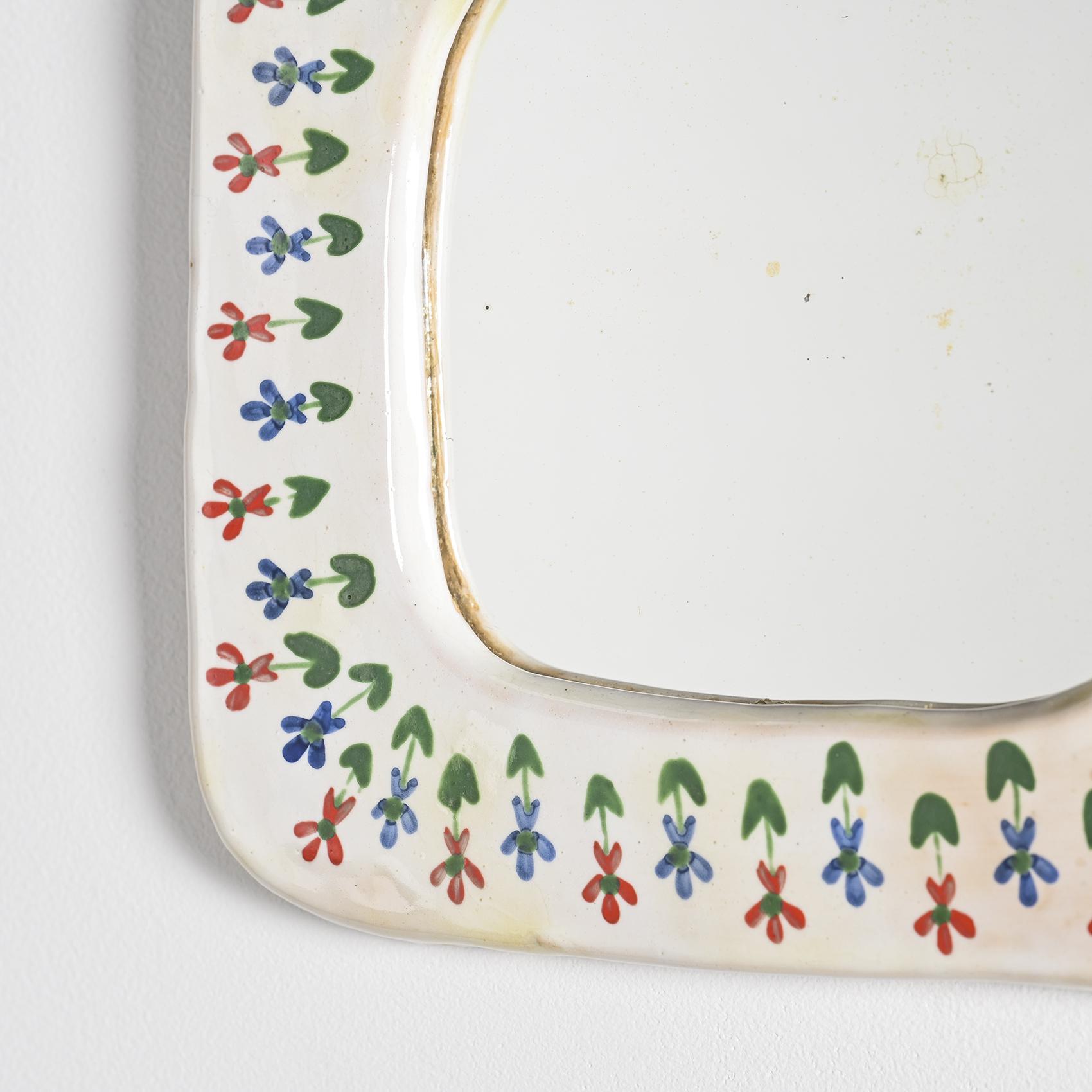 Wall mirror in glazed earthenware made by Les Quatre Potiers in their Saint-Amand-en-Puisaye workshop around 1965. The square frame with rounded corners features a thick border hand-painted with small stylized red, blue and green flowers on a creamy white glaze.