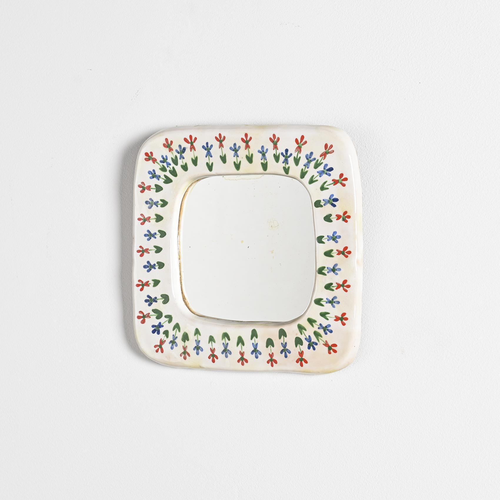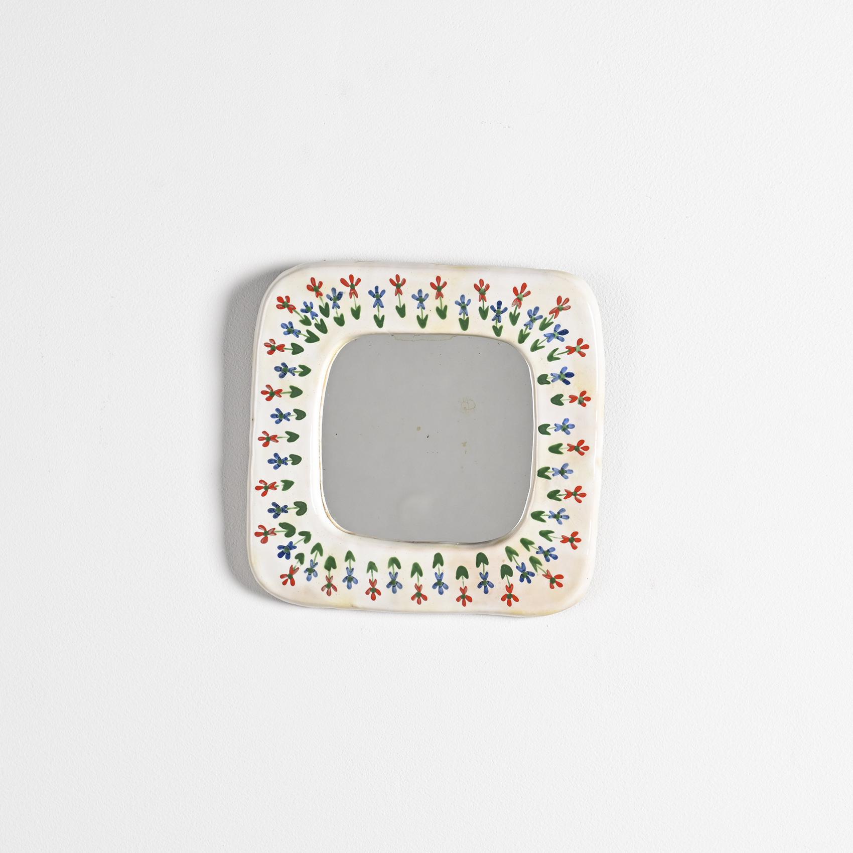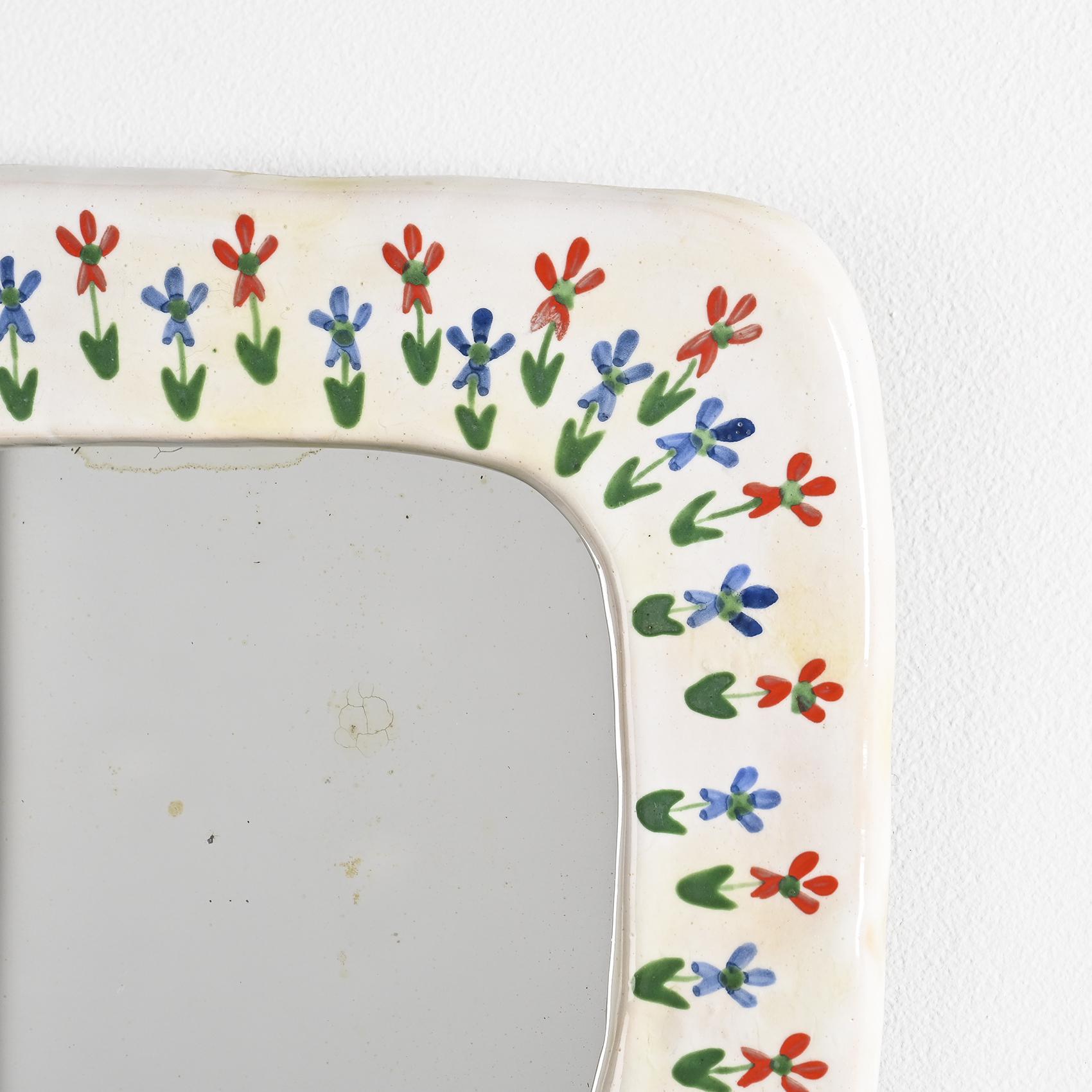 Wall mirror in glazed earthenware made by Les Quatre Potiers in their Saint-Amand-en-Puisaye workshop around 1965. The square frame with rounded corners features a thick border hand-painted with small stylized red, blue and green flowers on a creamy white glaze.