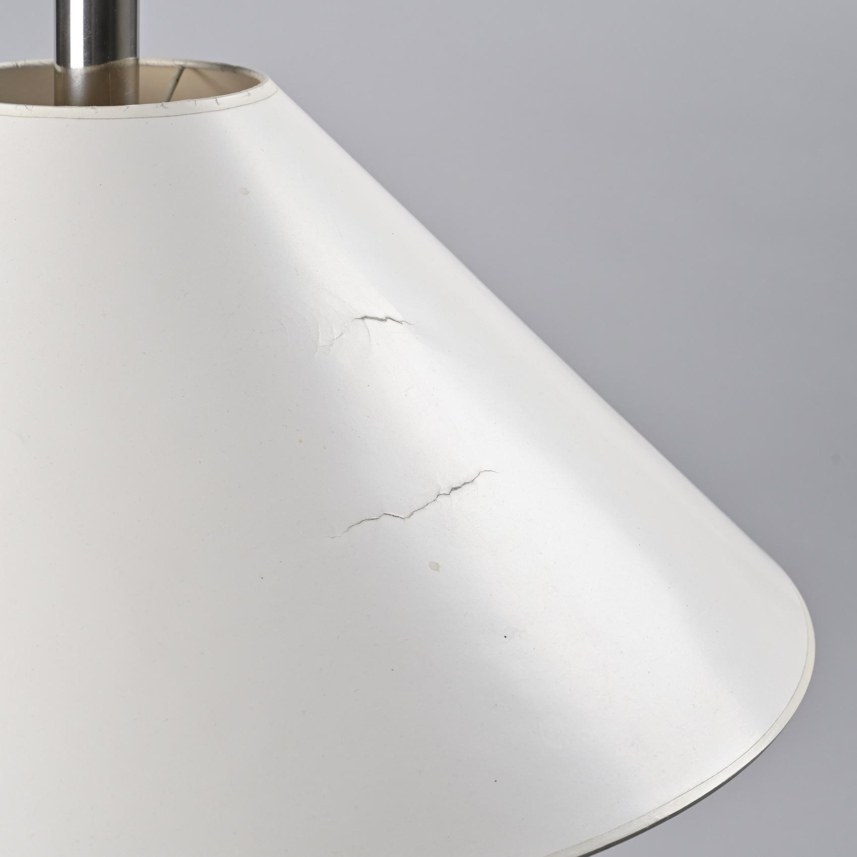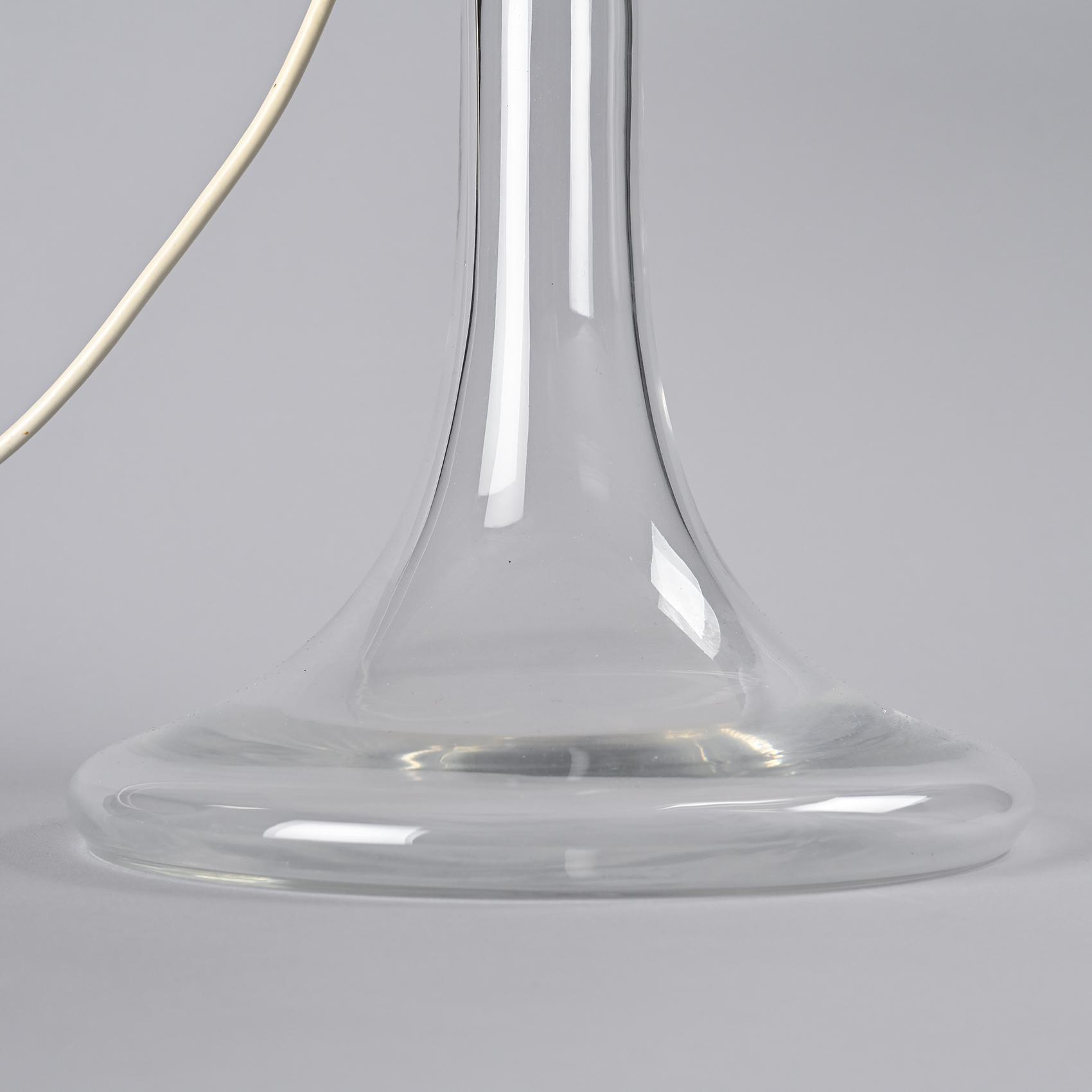 The blown glass base, slender and transparent, supports a chromed metal stem surmounted by a wide conical shade in white lacquered metal. The interplay between the lightness of the glass and the assertive presence of the shade gives the piece an elegant and balanced silhouette. This lamp belongs to Ingo Maurer's early designs, marking the beginning of a career where technical innovation and poetic form were inseparably linked.