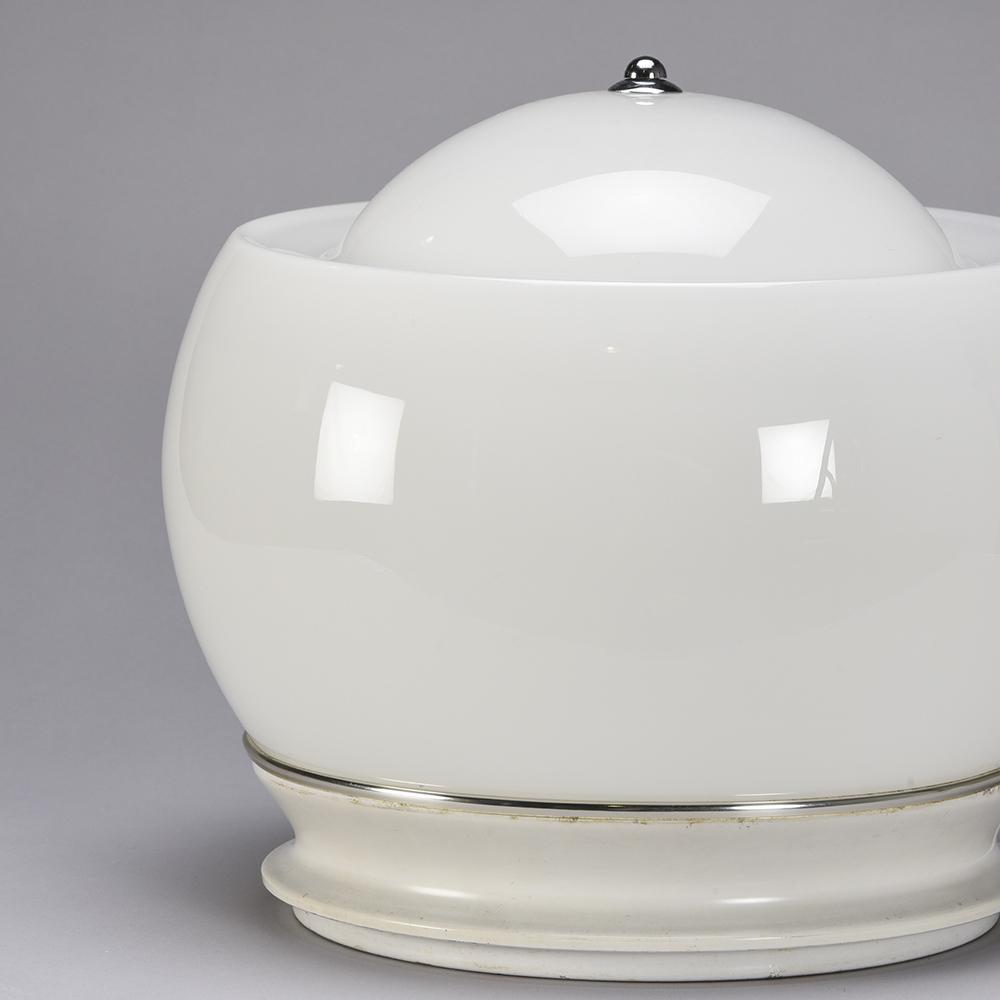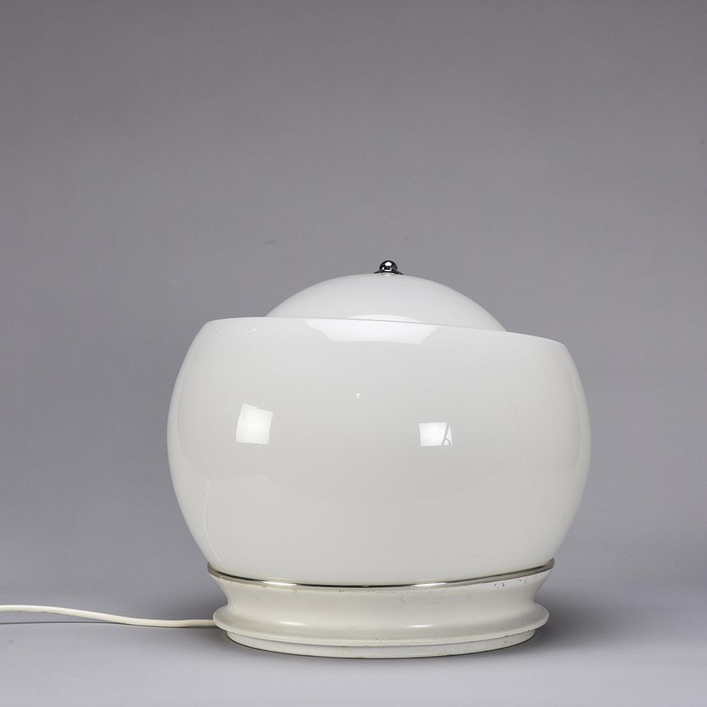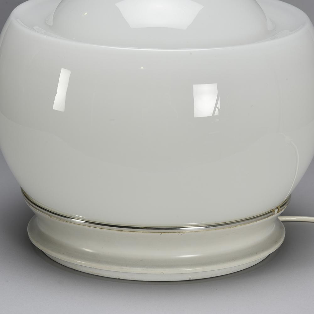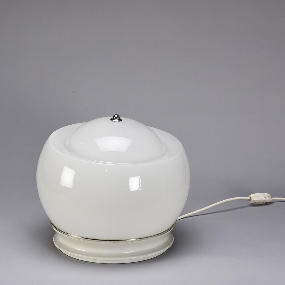 It is in opaline white hand blown glass resting on a white lacquered metal base.