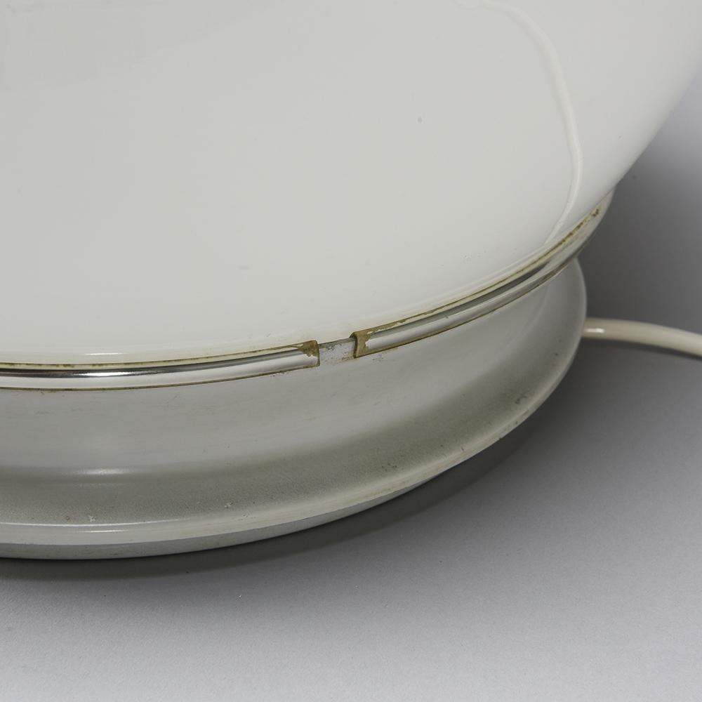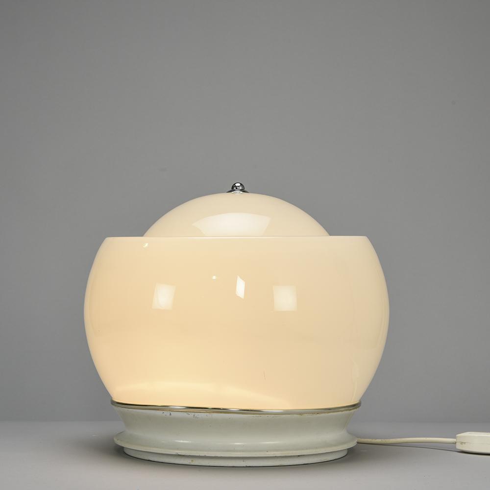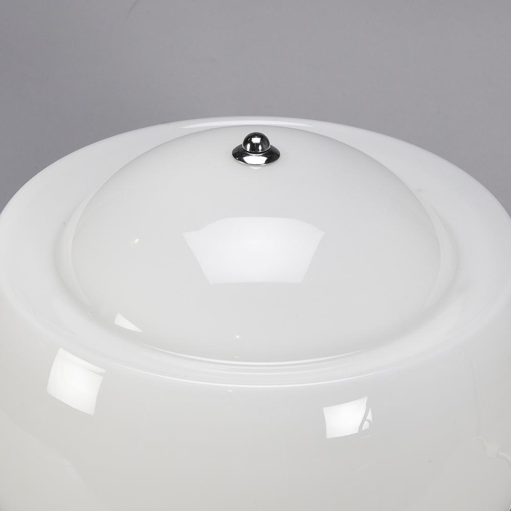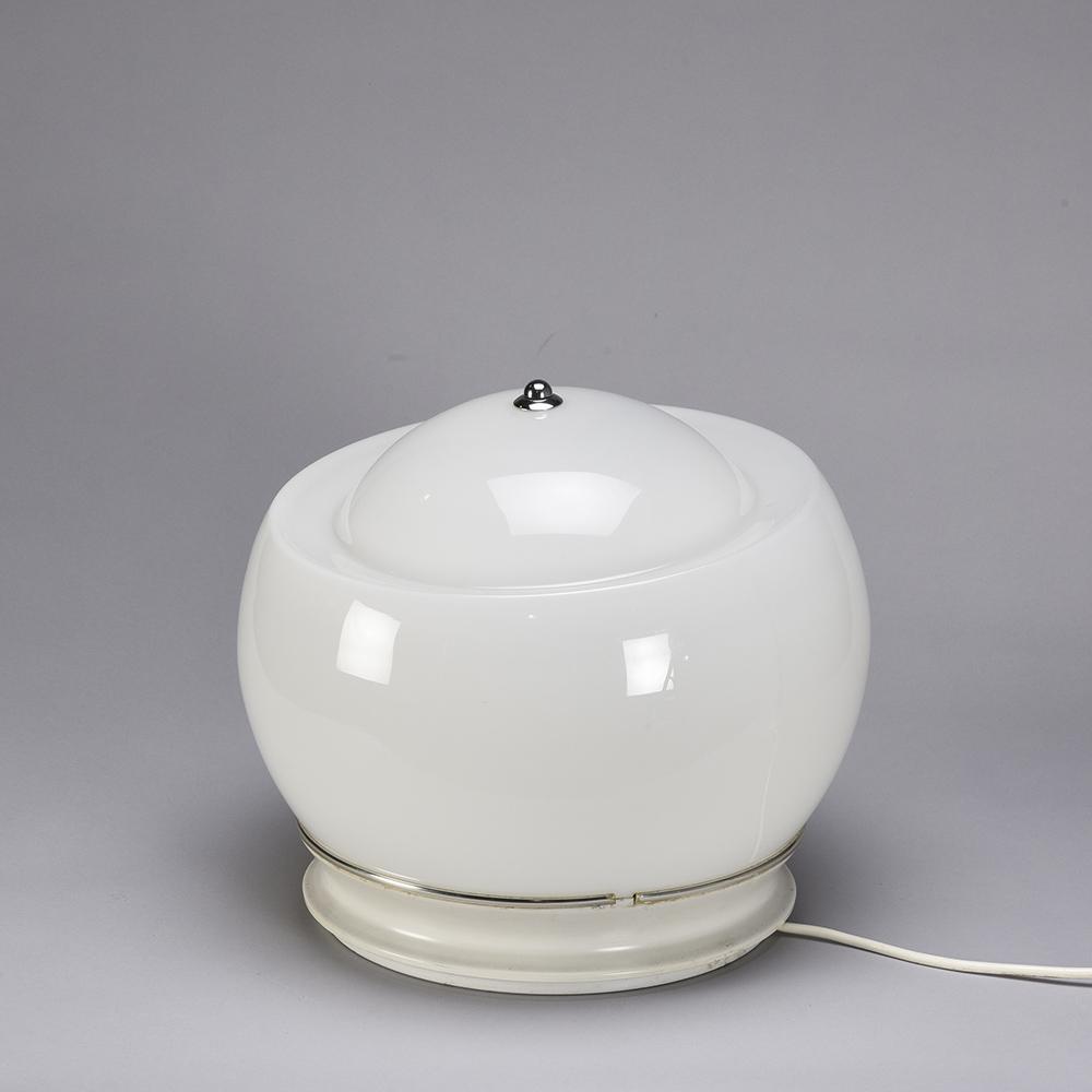 It is in opaline white hand blown glass resting on a white lacquered metal base.