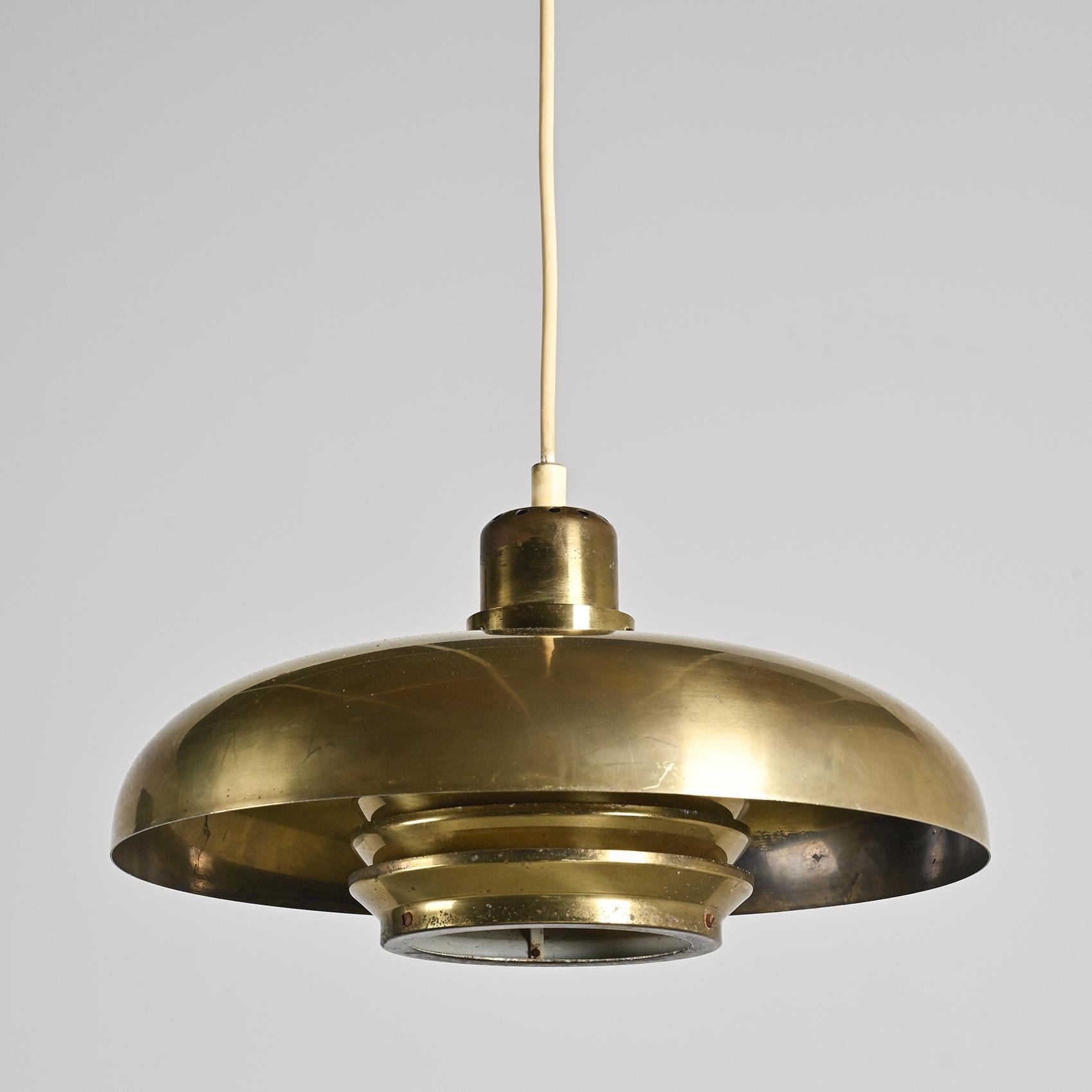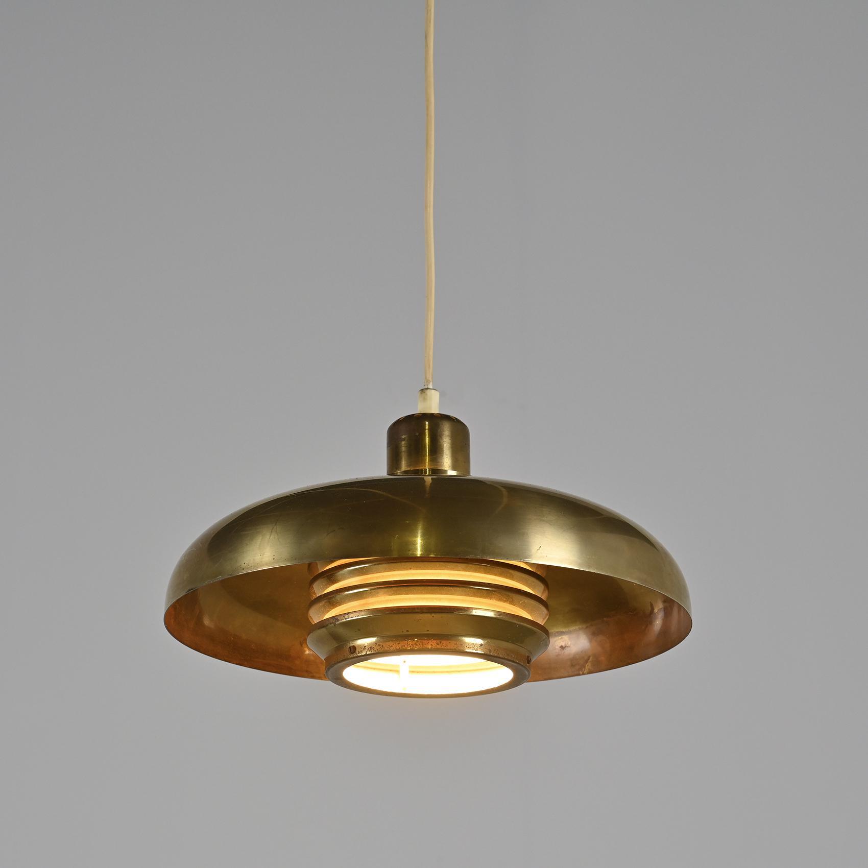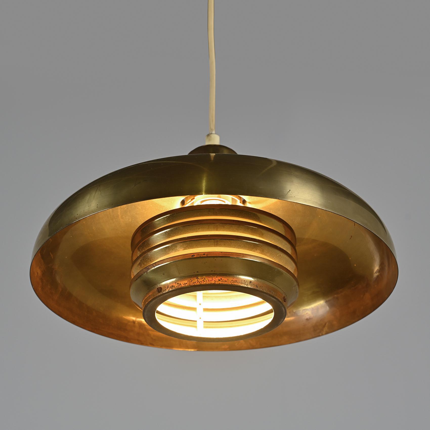 Vintage pendant lamp designed by Hans-Agne Jakobsson circa 1960 and produced in Sweden by AB Markaryd. Made of solid brass with a series of concentric rings, the lamp exemplifies Jakobsson's signature work on diffused light, producing a warm, atmospheric glow emblematic of Scandinavian mid-century design.