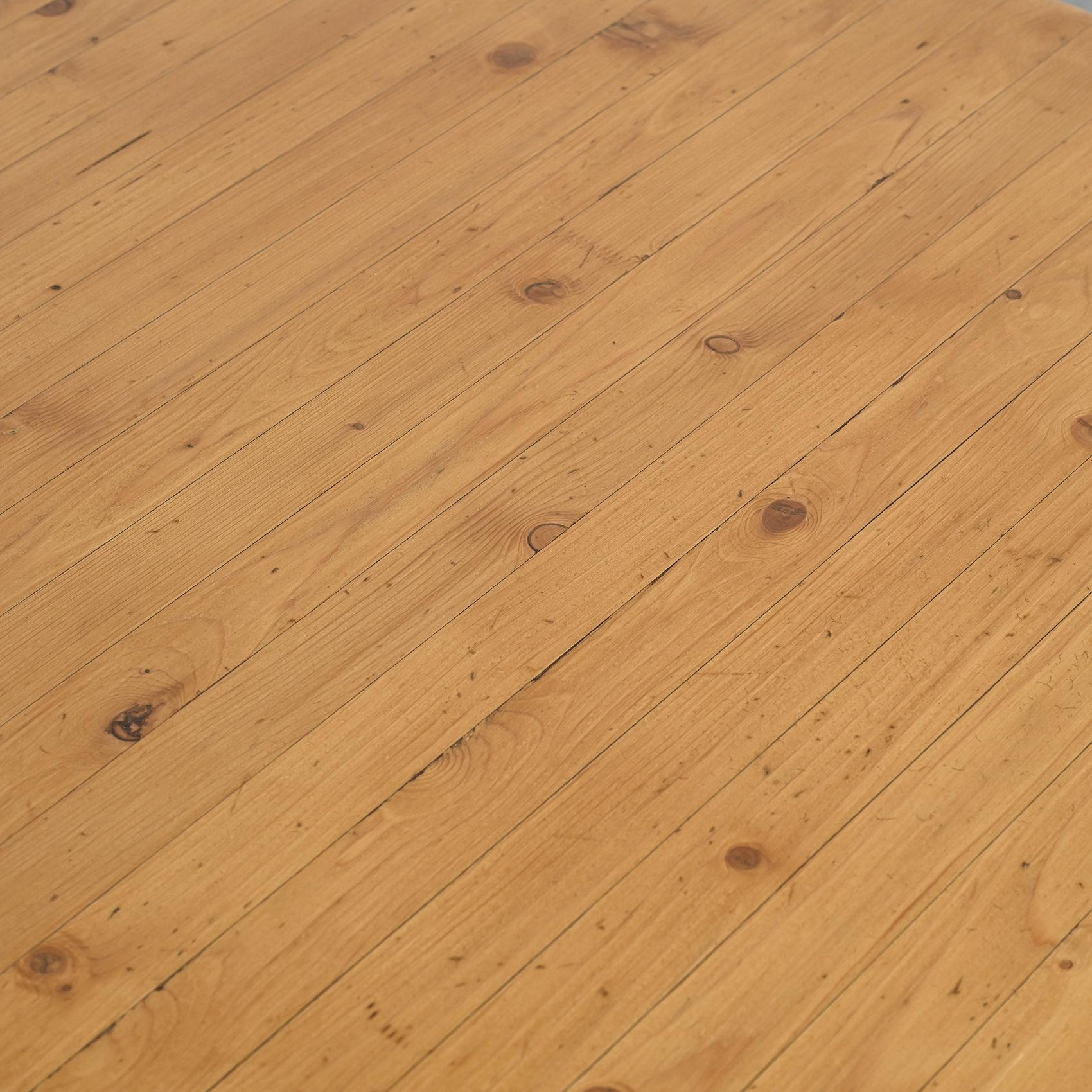It has a glued laminated pine top of rectangular shape with a beautiful patina, and rests on a black lacquered metal base.
