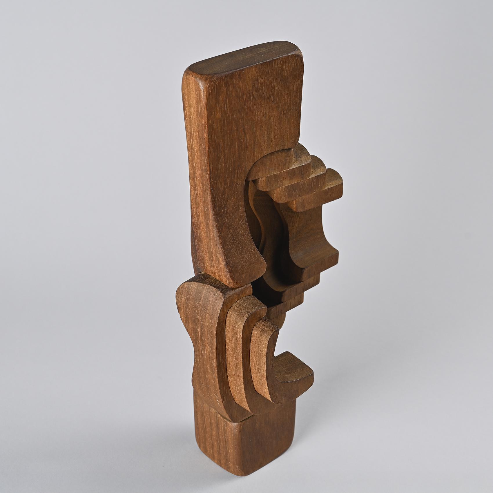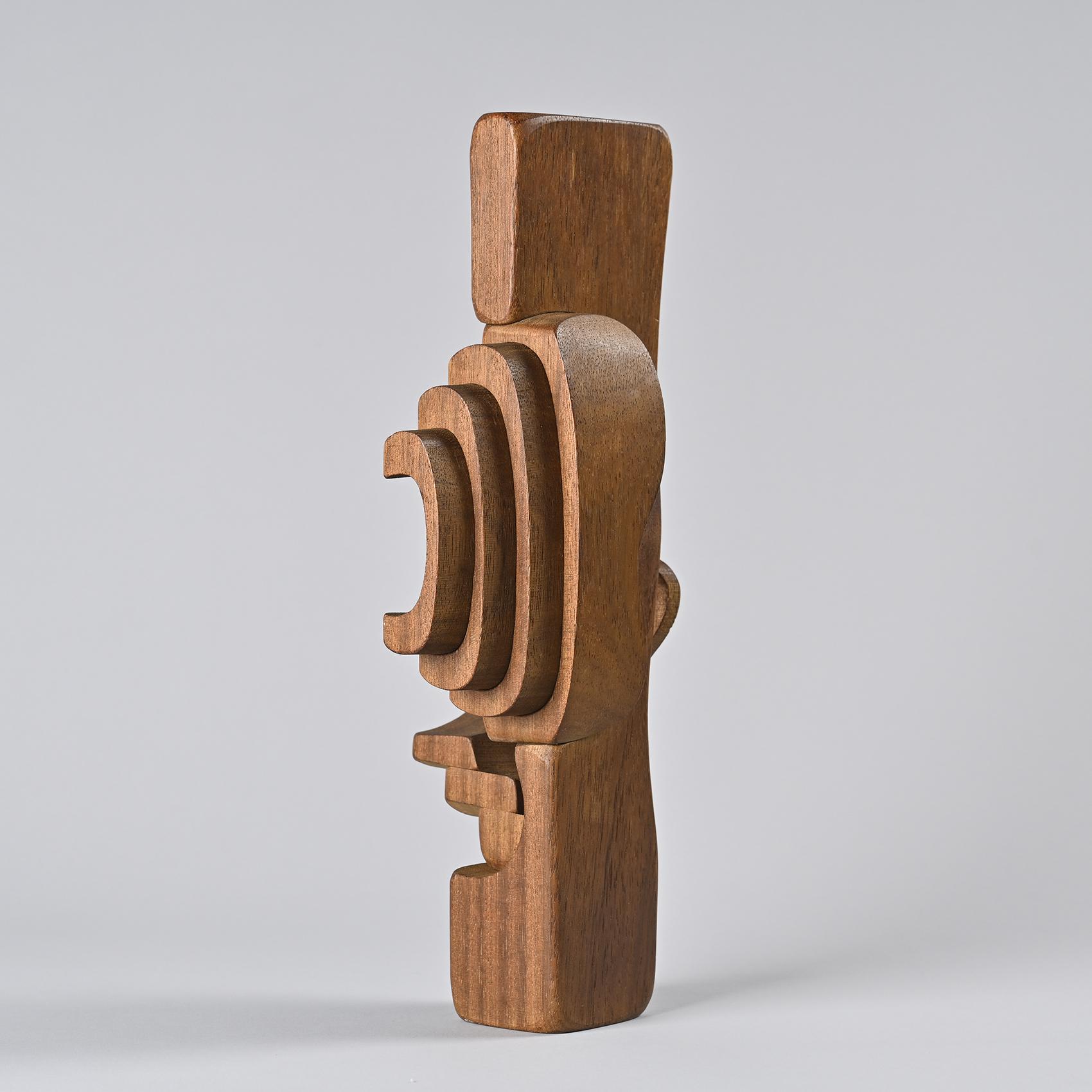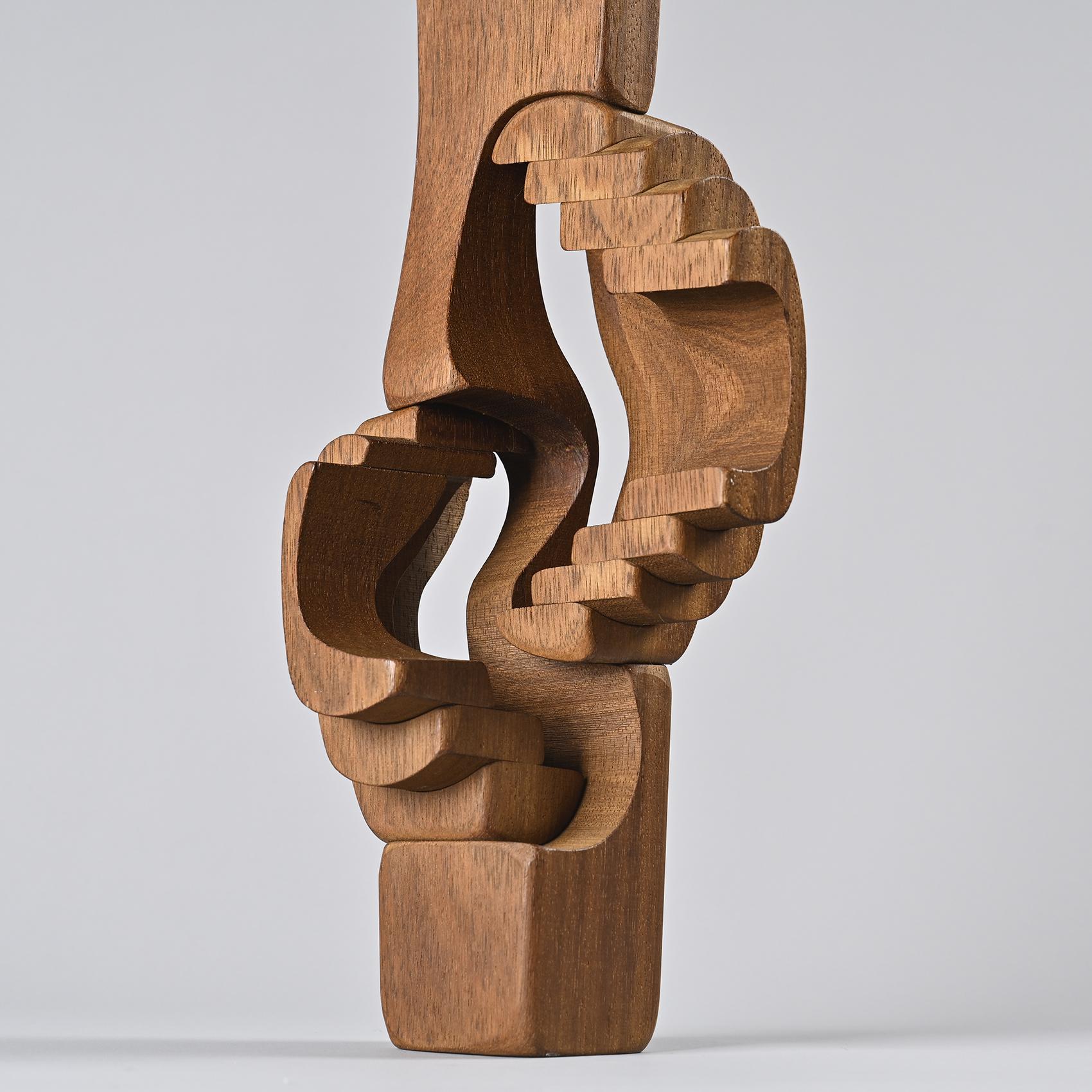 Sculpture abstraite en acajoui massif sculpté à la main, jouant sur des volumes imbriqués et une rythmique géométrique parfaitement maîtrisée. Les formes ondulantes se répondent avec équilibre, créant un dialogue entre plein et vide, ombre et lumière. Le veinage naturel du bois accentue cette sensation de mouvement et de profondeur.