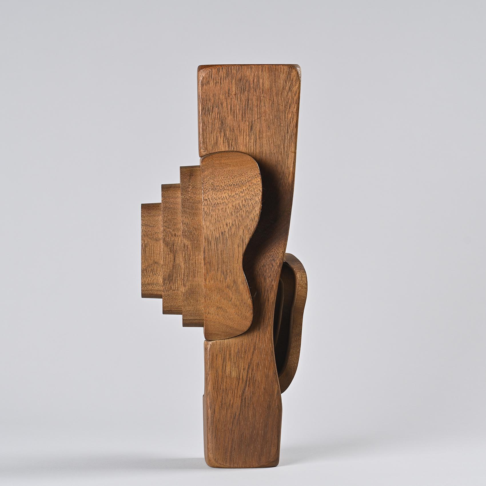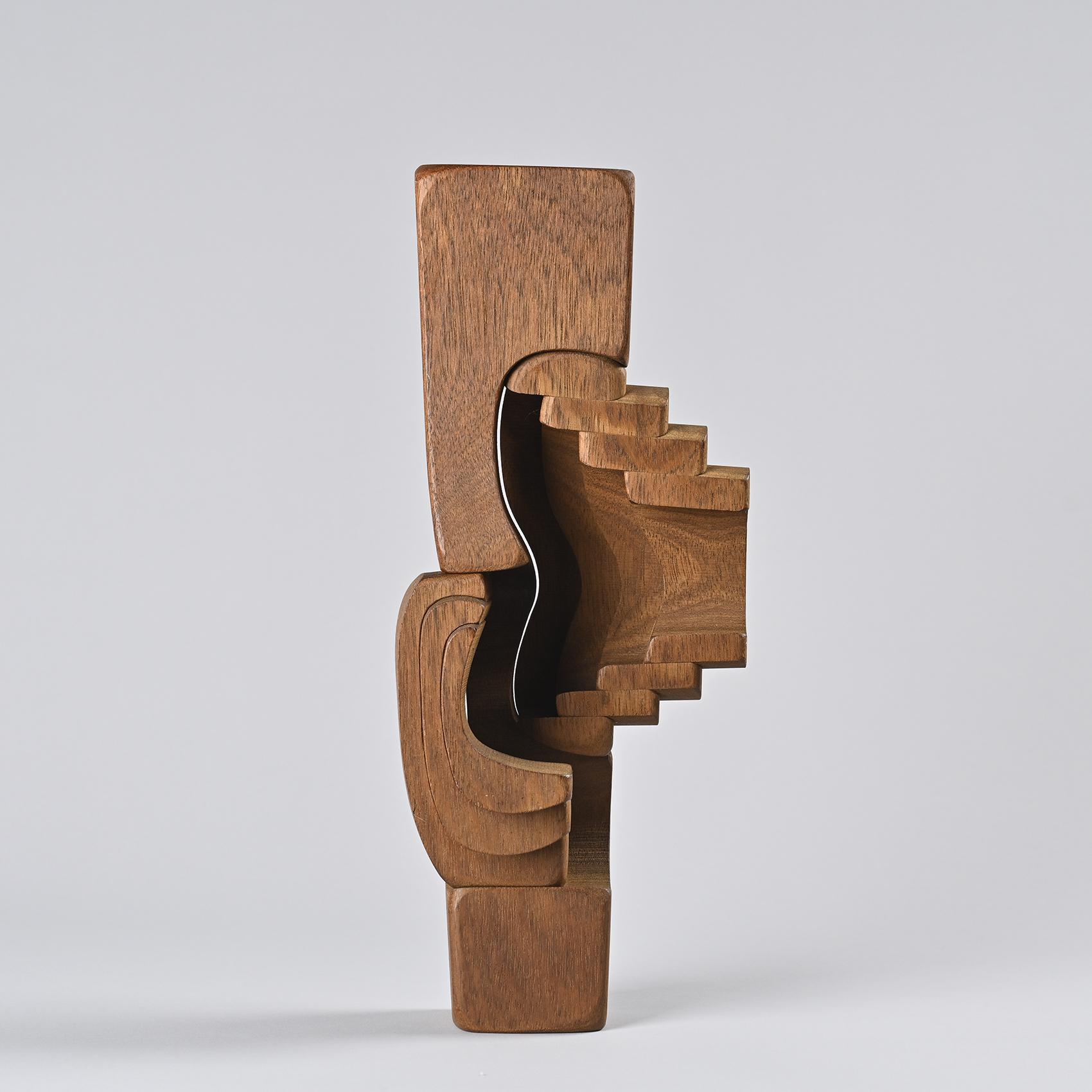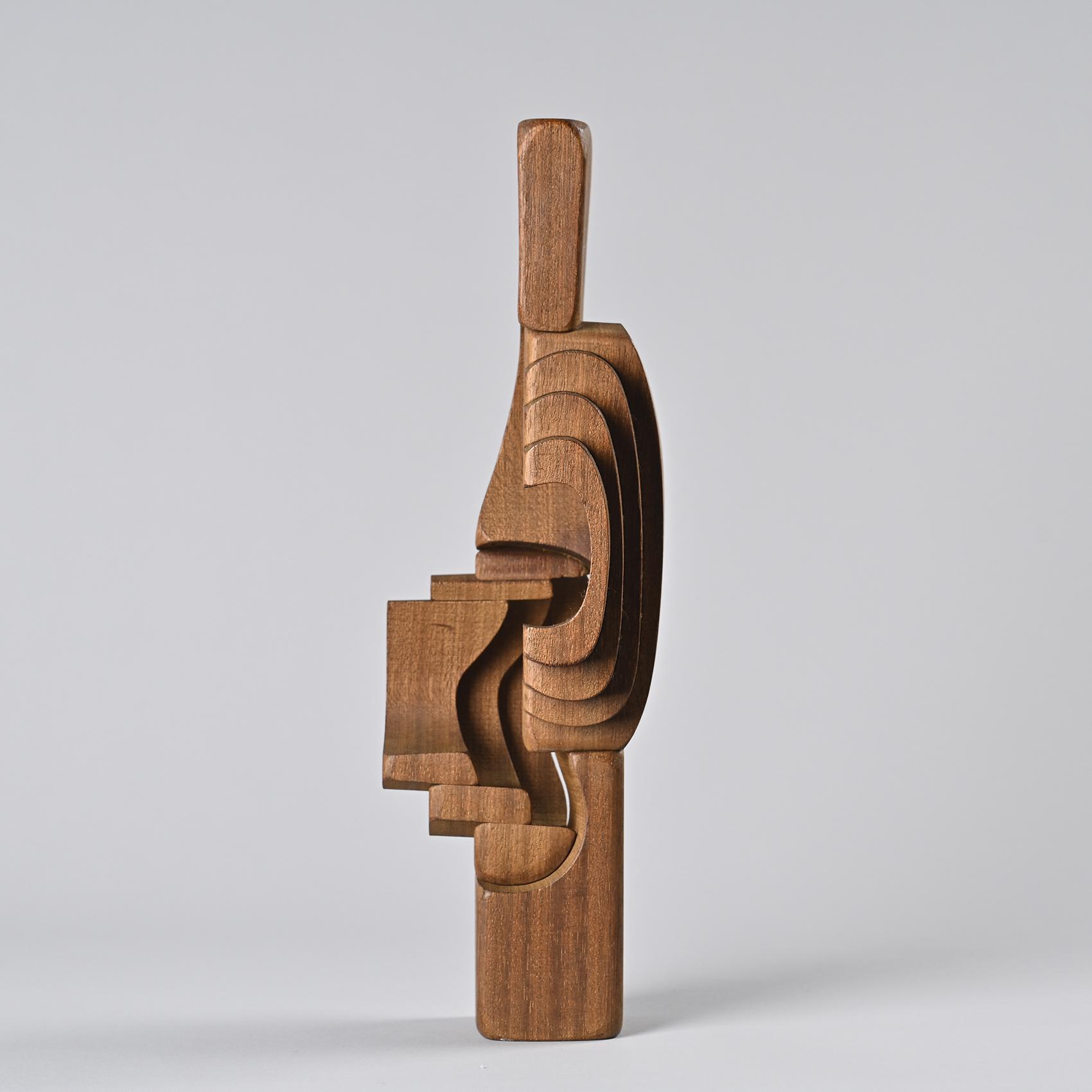Sculpture abstraite en acajoui massif sculpté à la main, jouant sur des volumes imbriqués et une rythmique géométrique parfaitement maîtrisée. Les formes ondulantes se répondent avec équilibre, créant un dialogue entre plein et vide, ombre et lumière. Le veinage naturel du bois accentue cette sensation de mouvement et de profondeur.