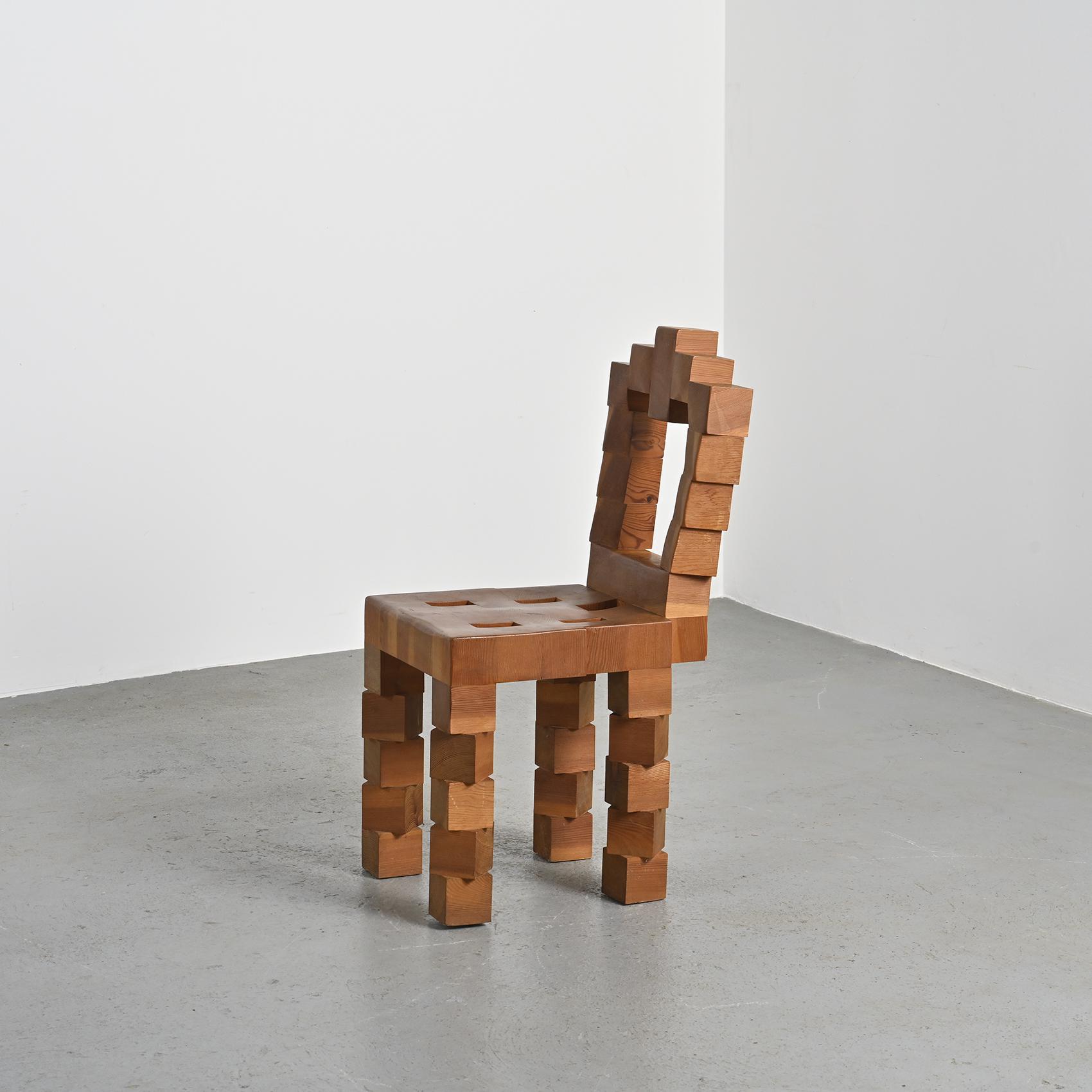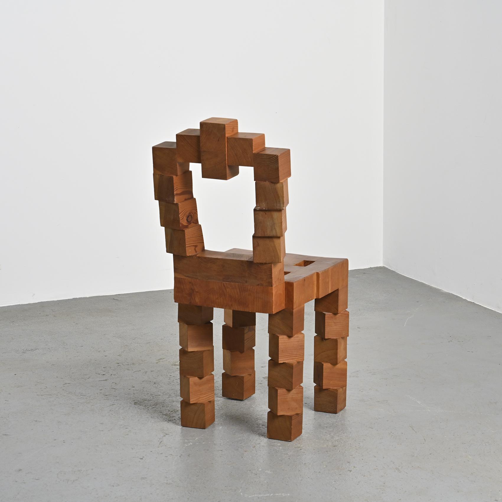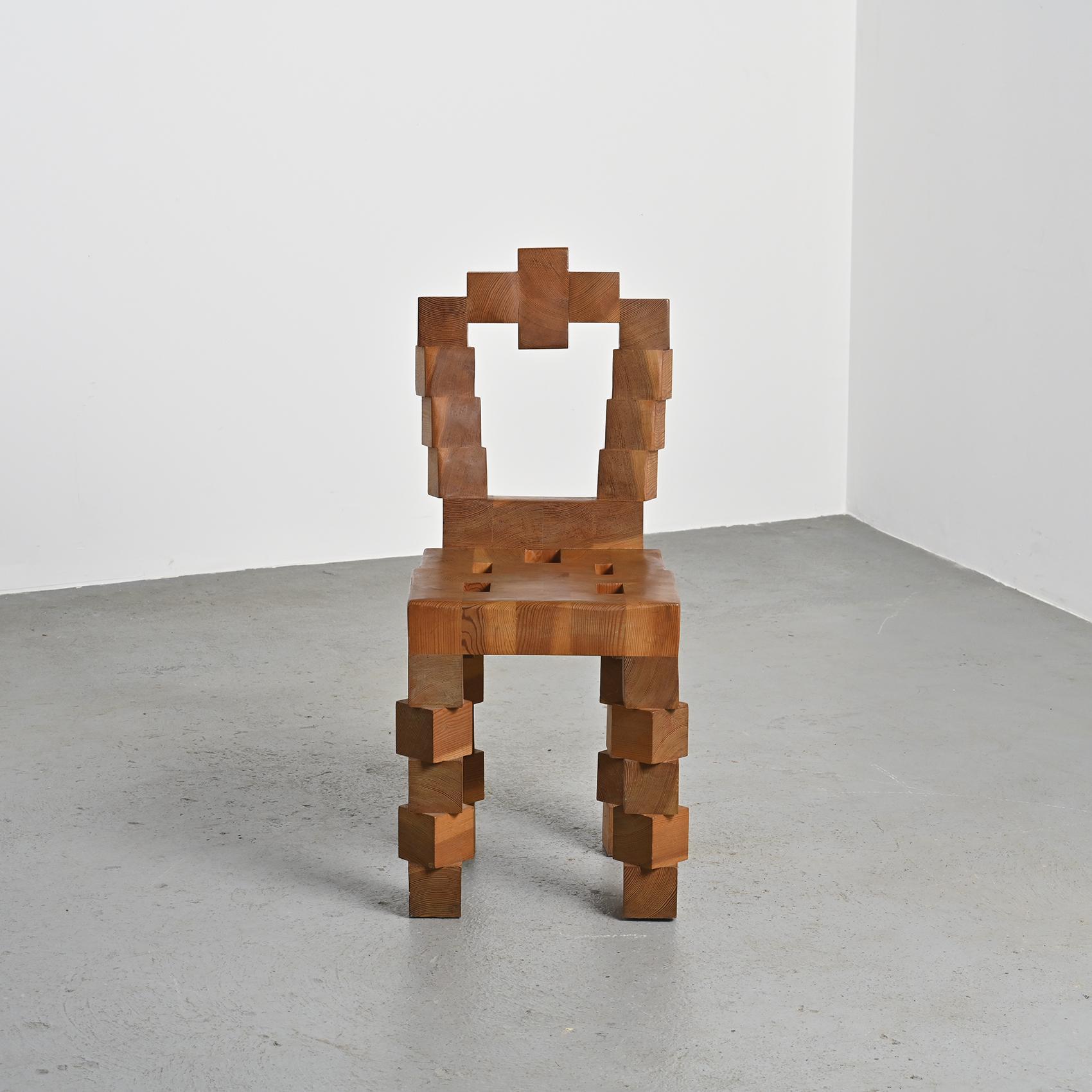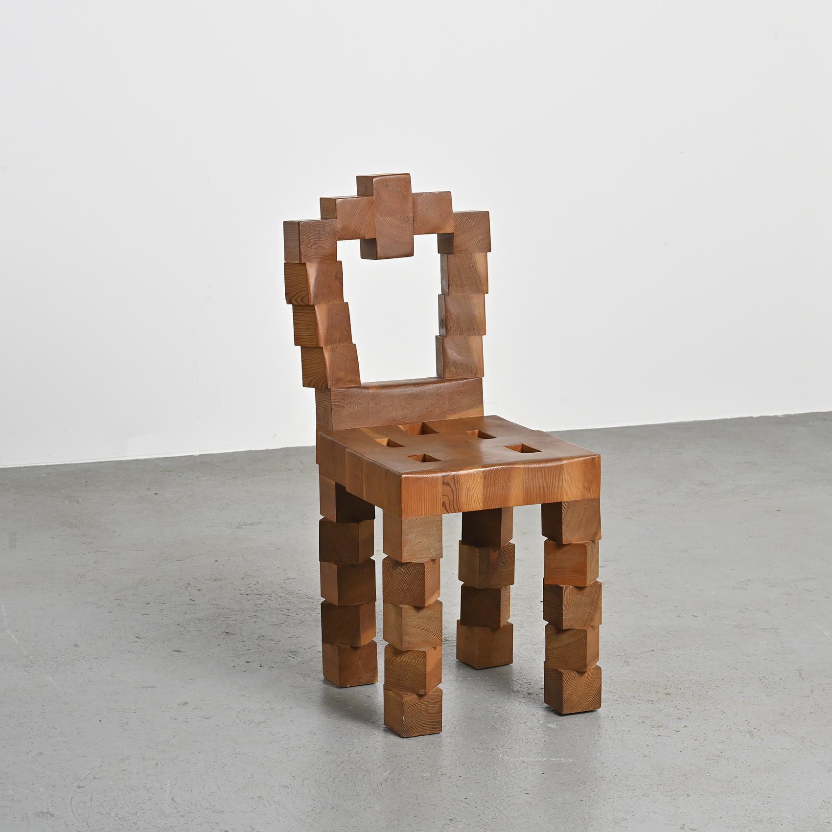 Chaise en bois massif à structure architecturée, composée d'éléments cubiques imbriqués formant l'assise, le dossier et les quatre pieds. Le dessin géométrique, rythmé par des creux et reliefs réguliers, confère à cette pièce une présence sculpturale et une force plastique singulière.