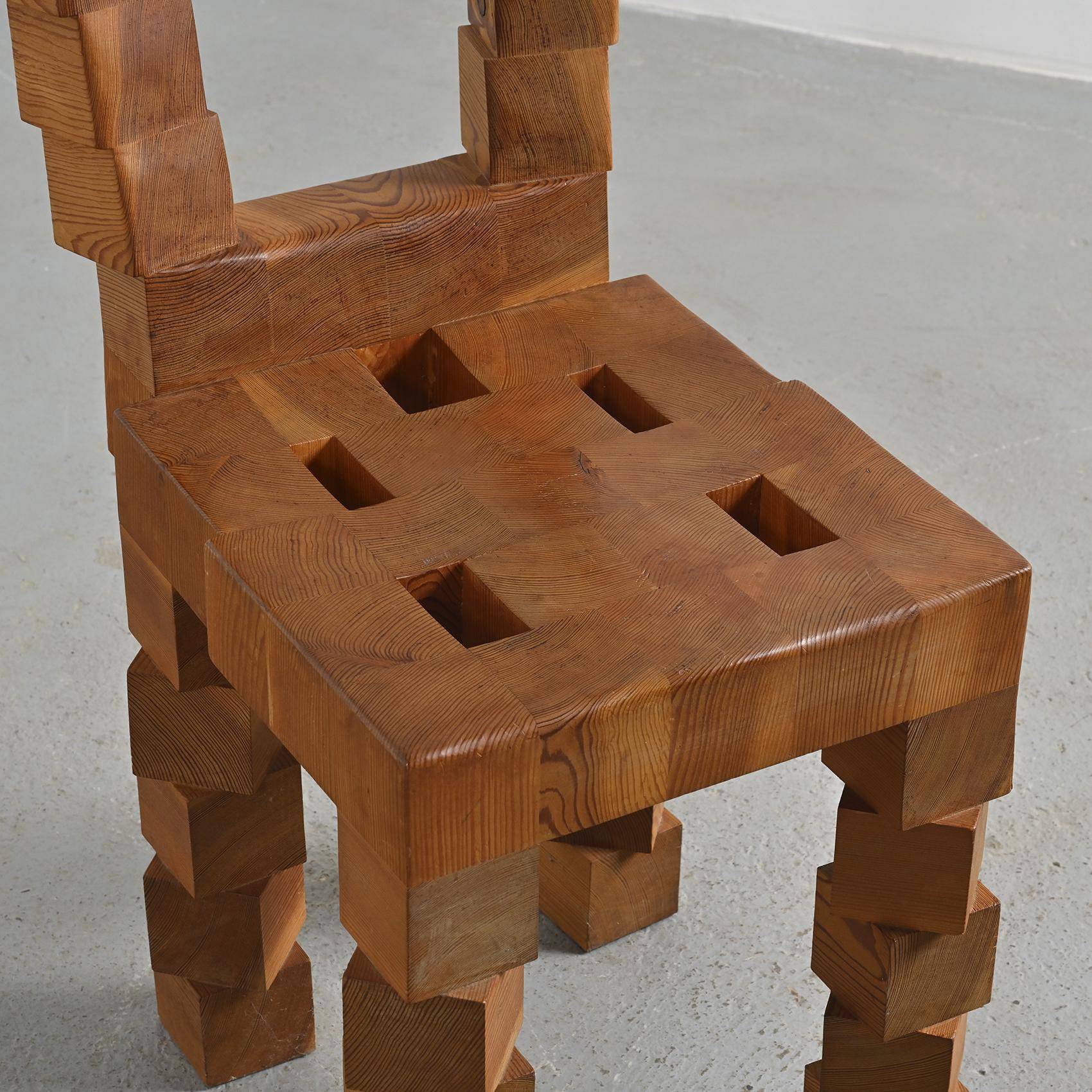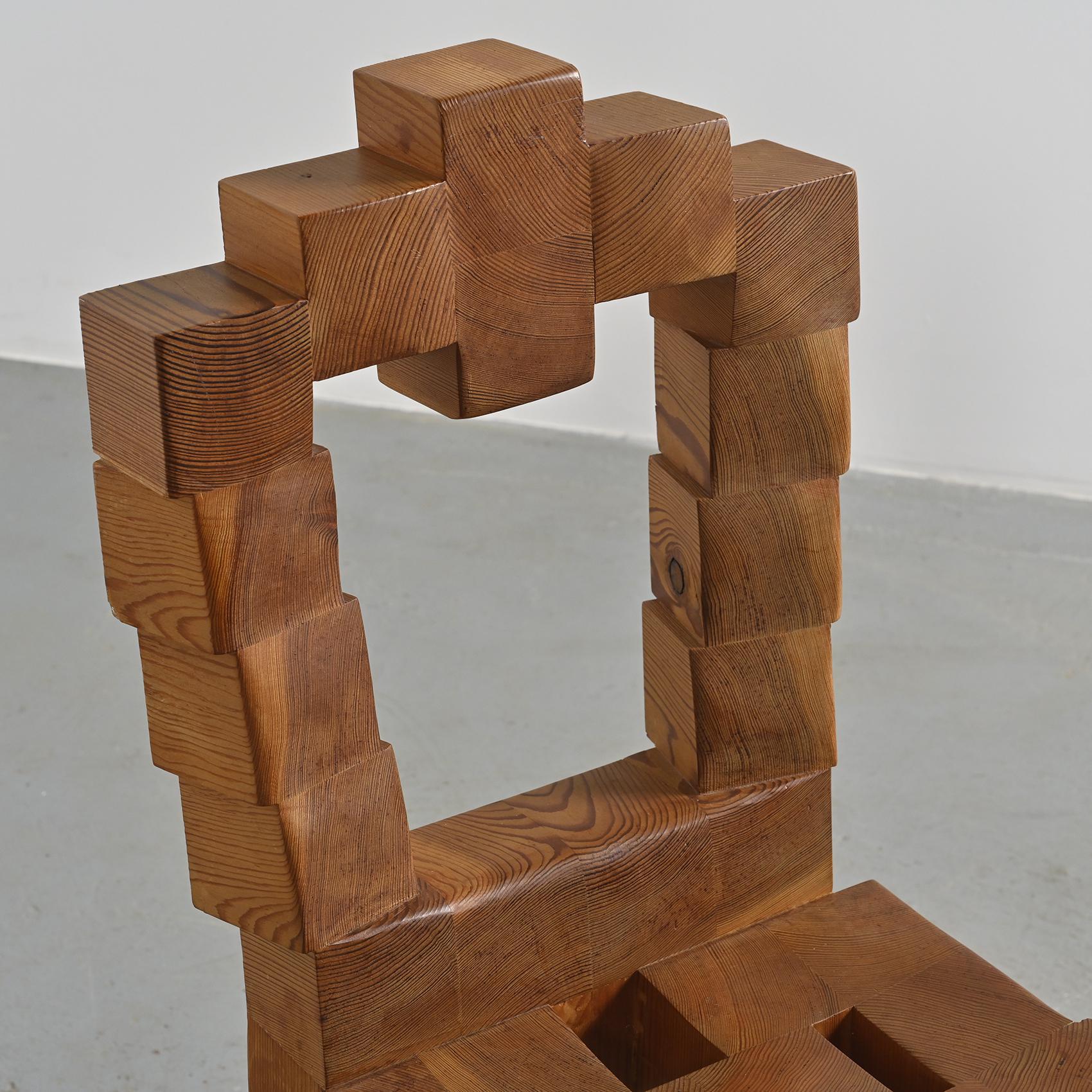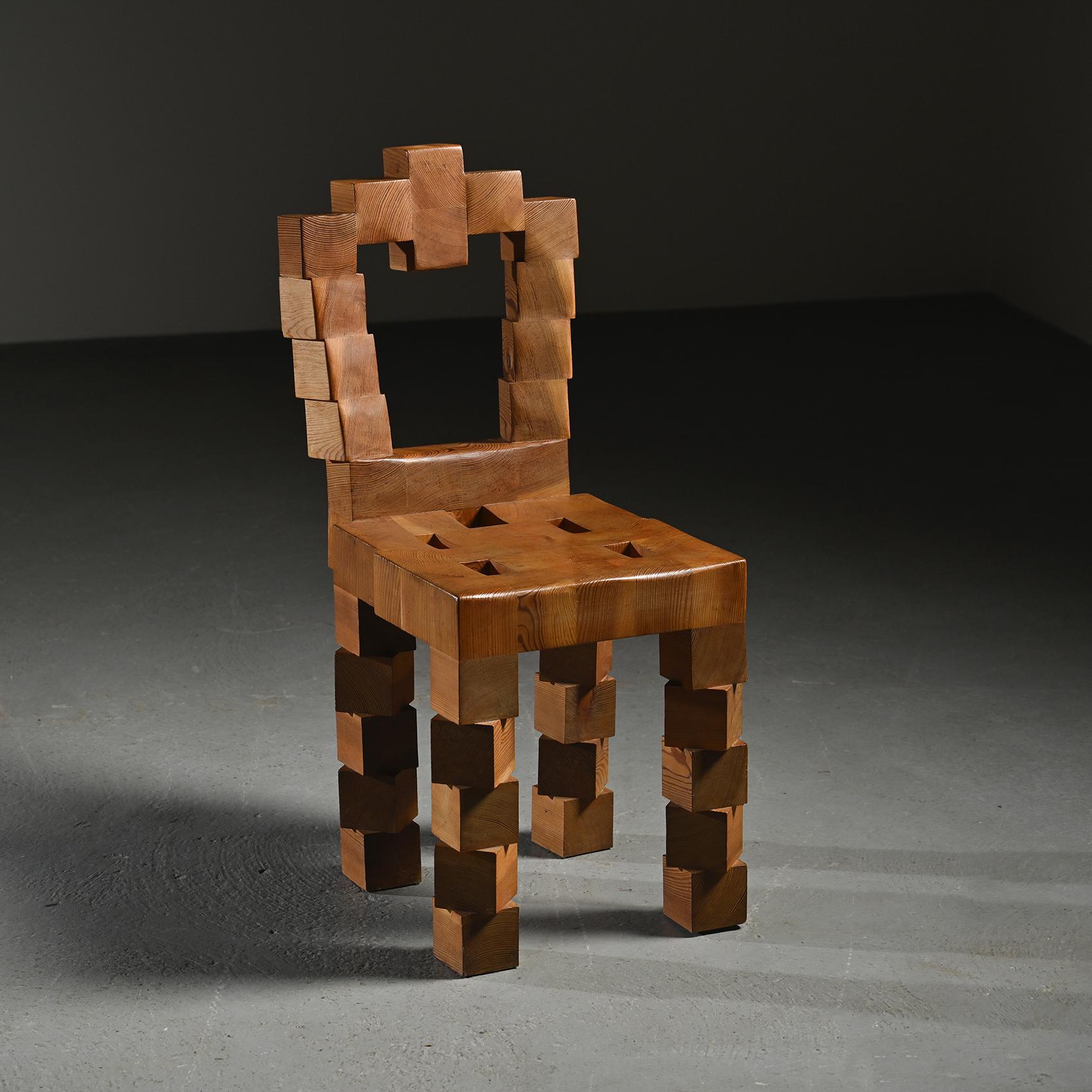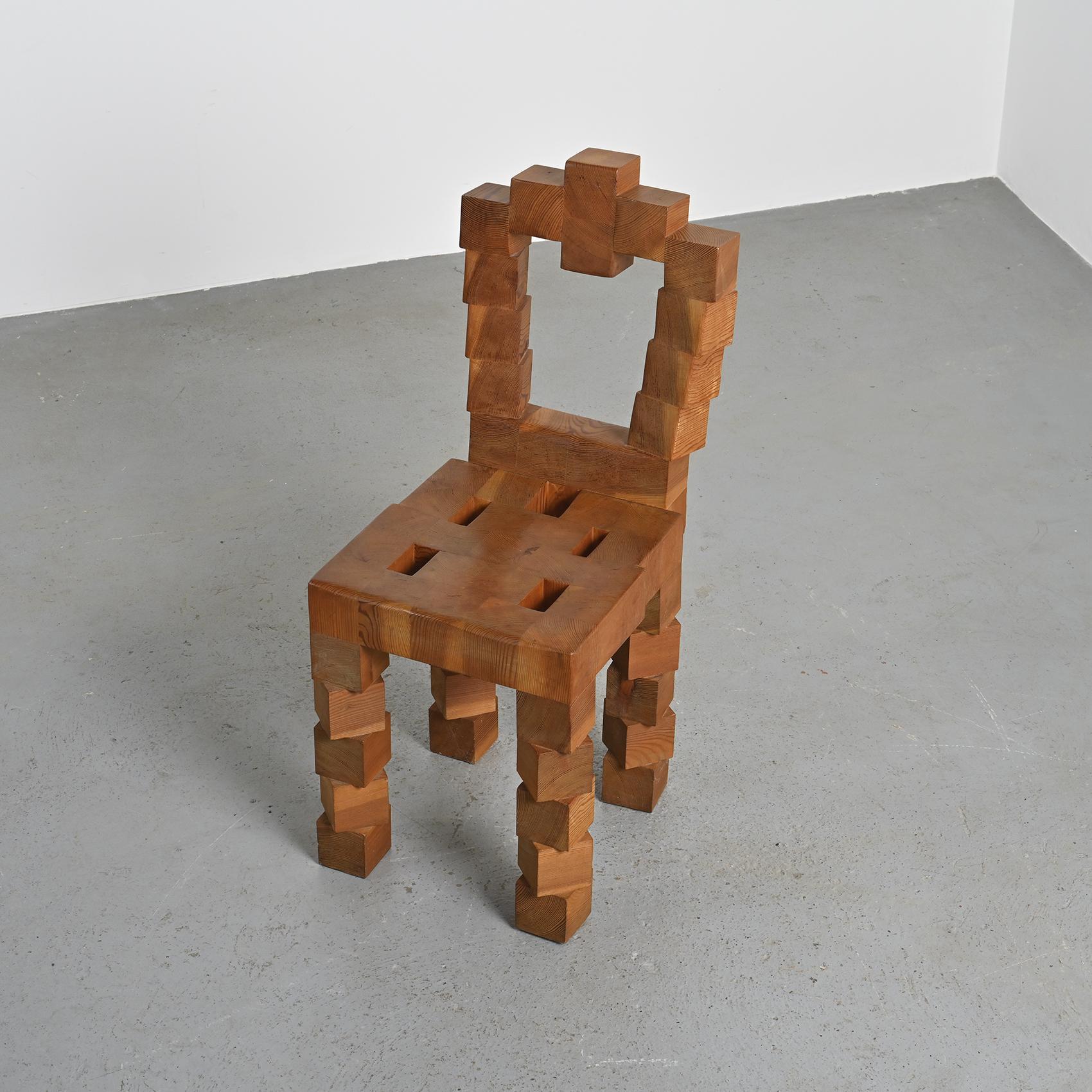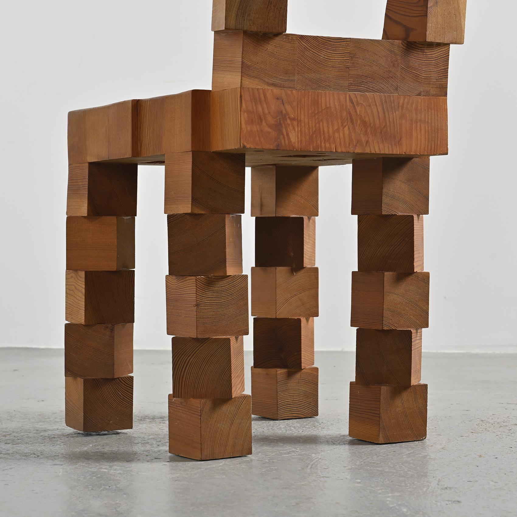 Chaise en bois massif à structure architecturée, composée d'éléments cubiques imbriqués formant l'assise, le dossier et les quatre pieds. Le dessin géométrique, rythmé par des creux et reliefs réguliers, confère à cette pièce une présence sculpturale et une force plastique singulière.