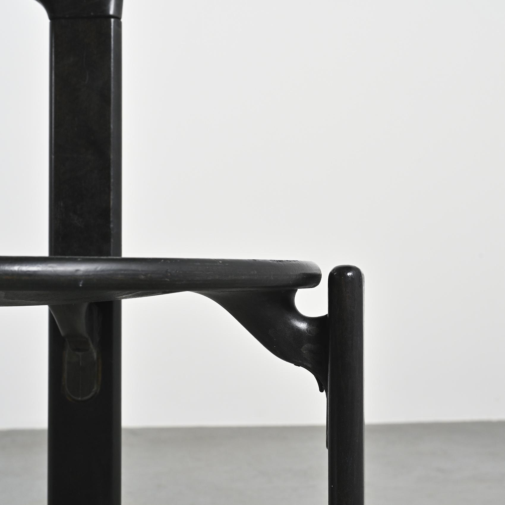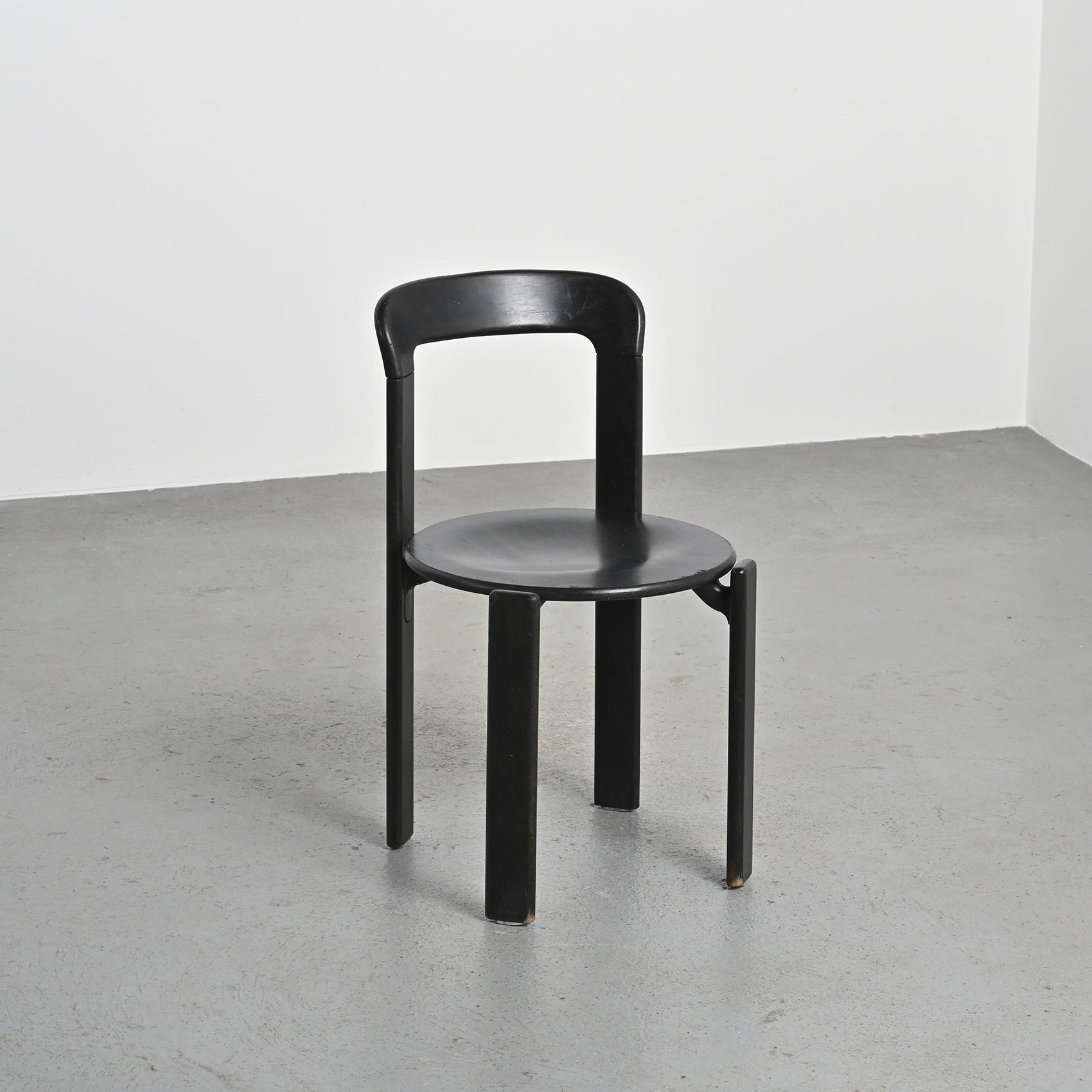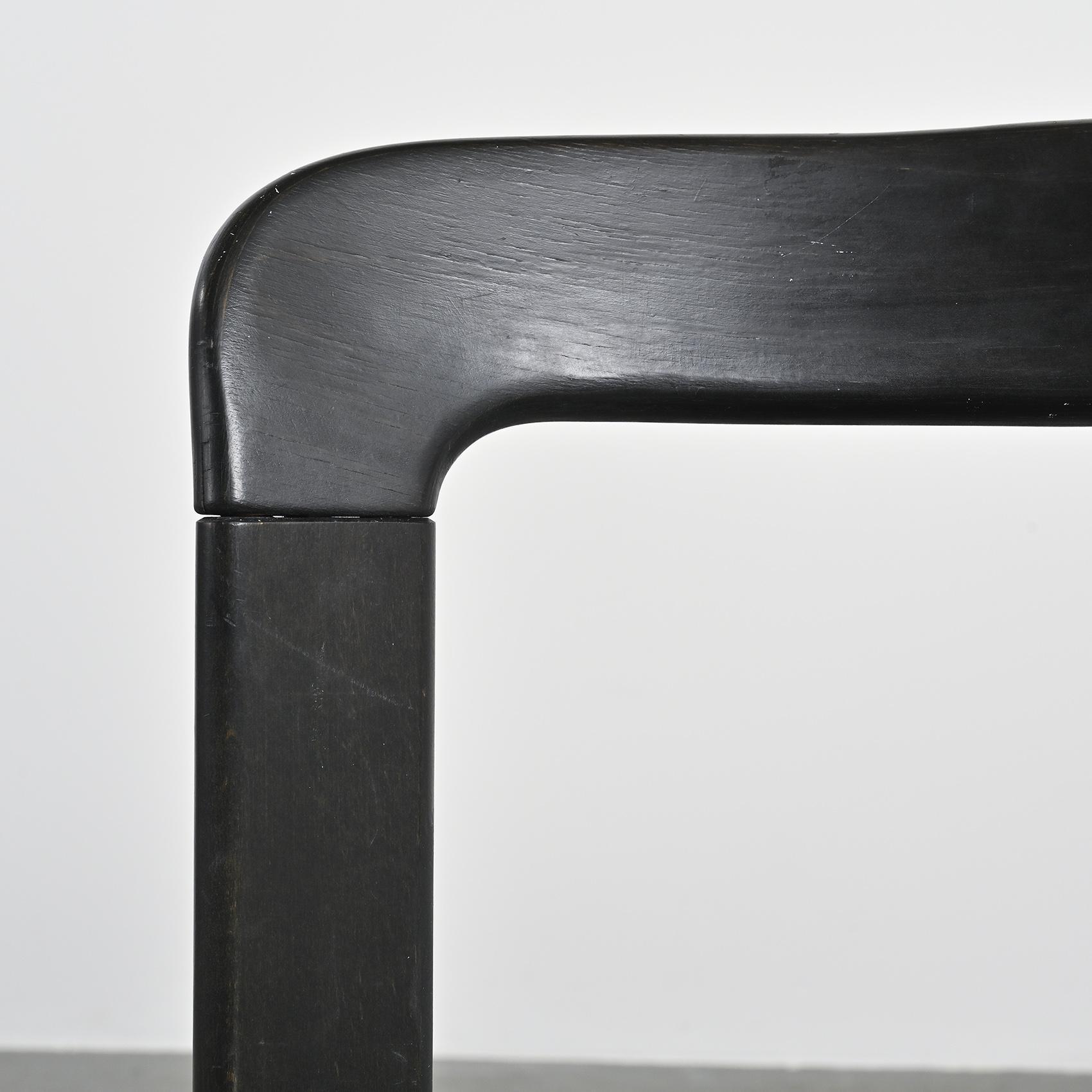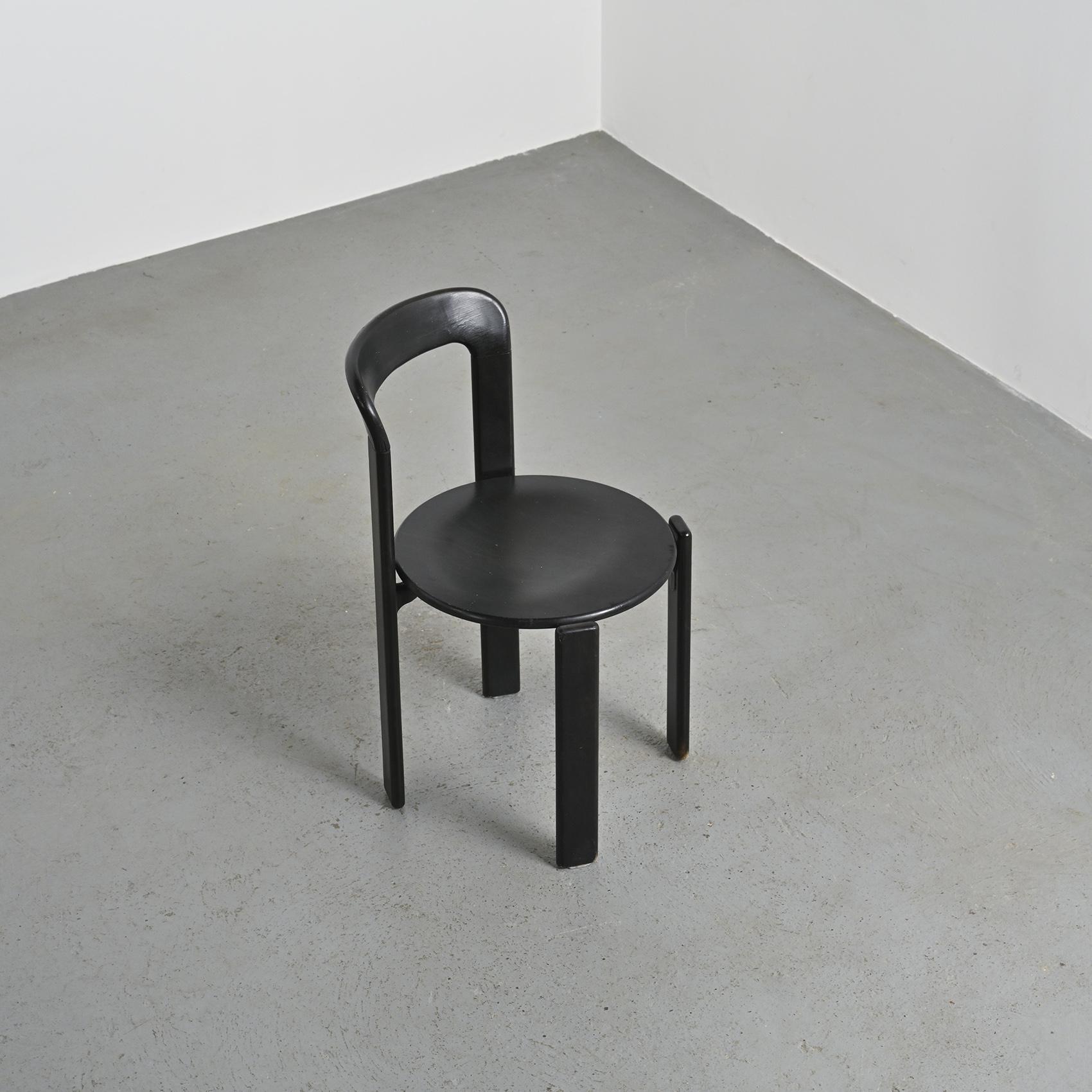 Réalisée en hêtre massif laqué noir, cette chaise se distingue par sa silhouette fluide et son système d'assemblage innovant reliant l'assise et le dossier par des pièces en fonte d'aluminium. Cette conception sans vis apparente est devenue la signature de Bruno Rey,