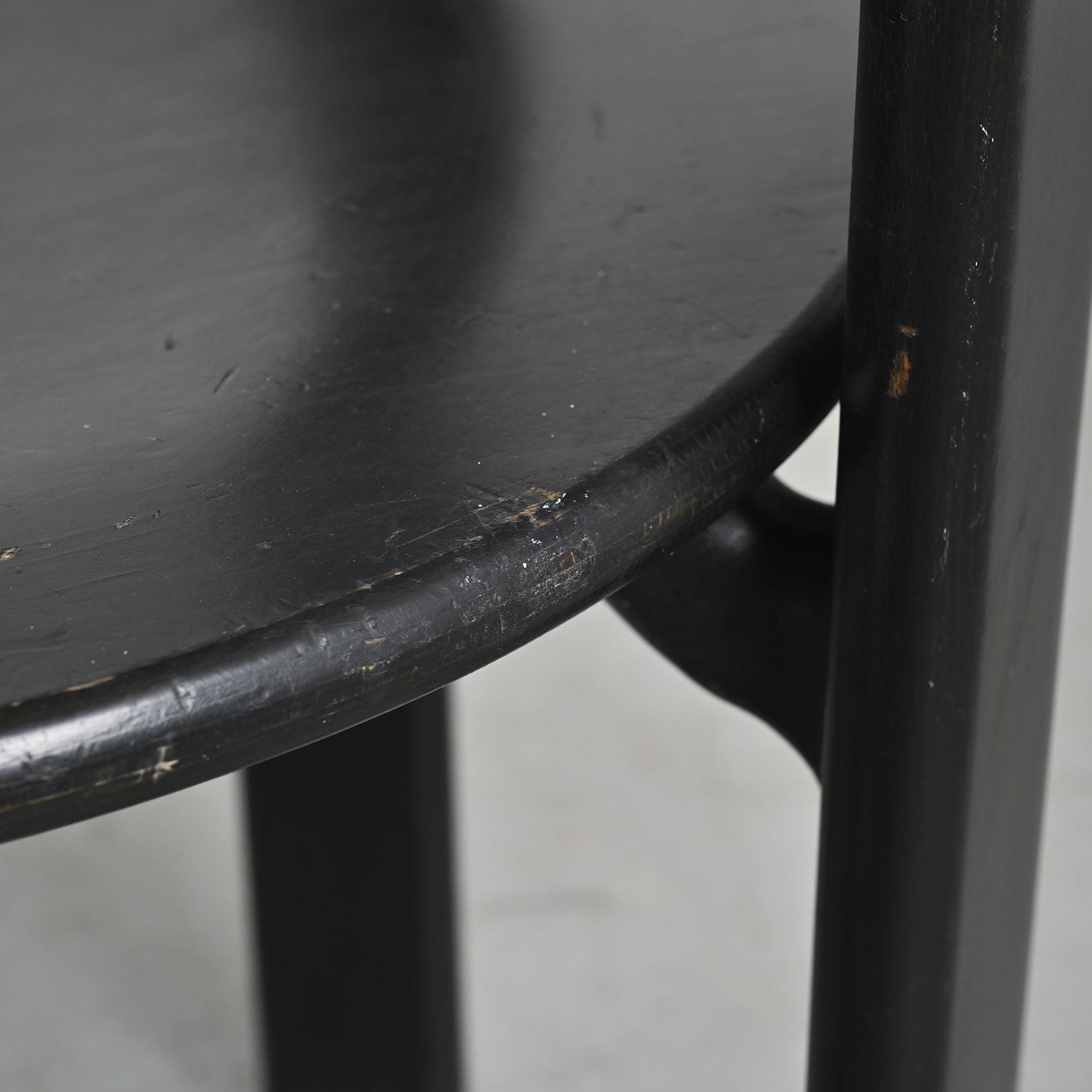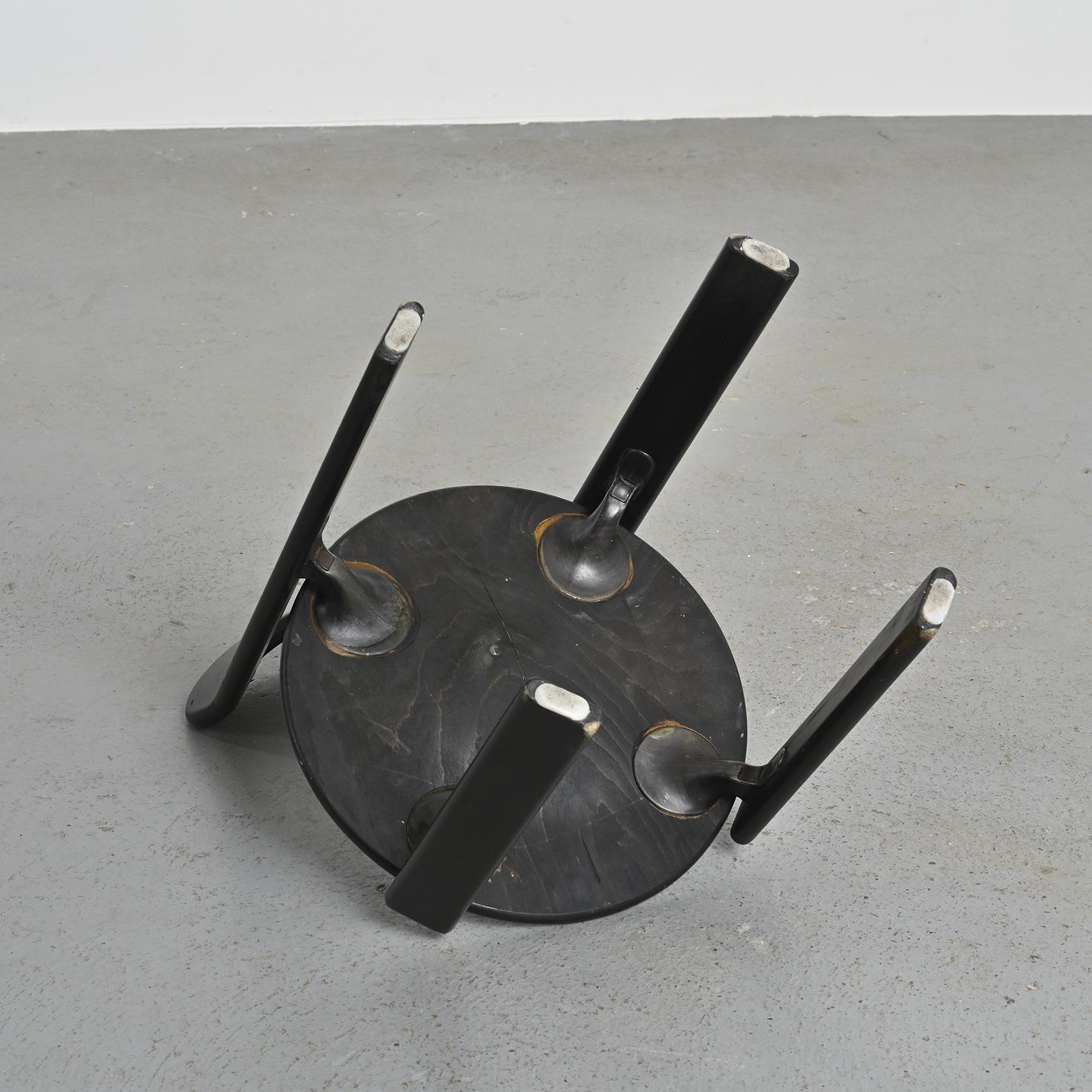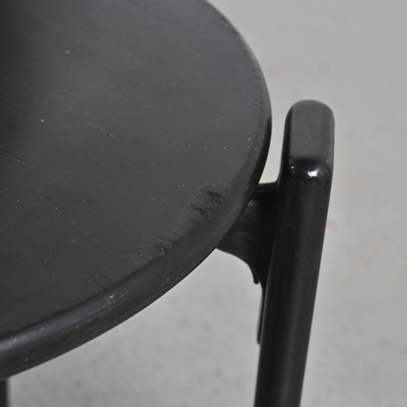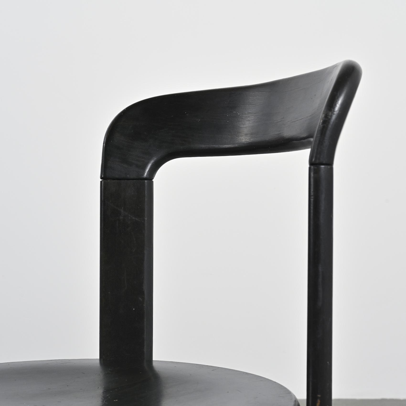 Réalisée en hêtre massif laqué noir, cette chaise se distingue par sa silhouette fluide et son système d'assemblage innovant reliant l'assise et le dossier par des pièces en fonte d'aluminium. Cette conception sans vis apparente est devenue la signature de Bruno Rey,