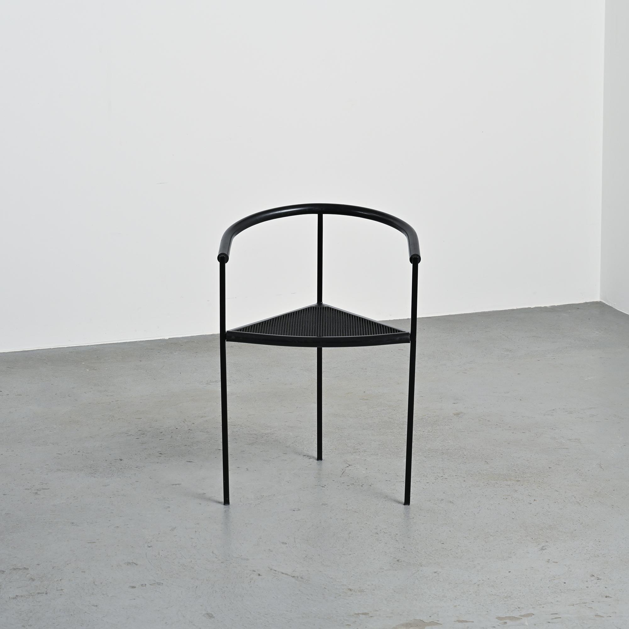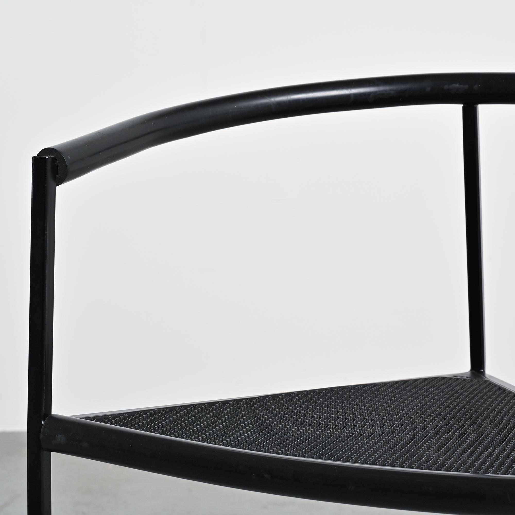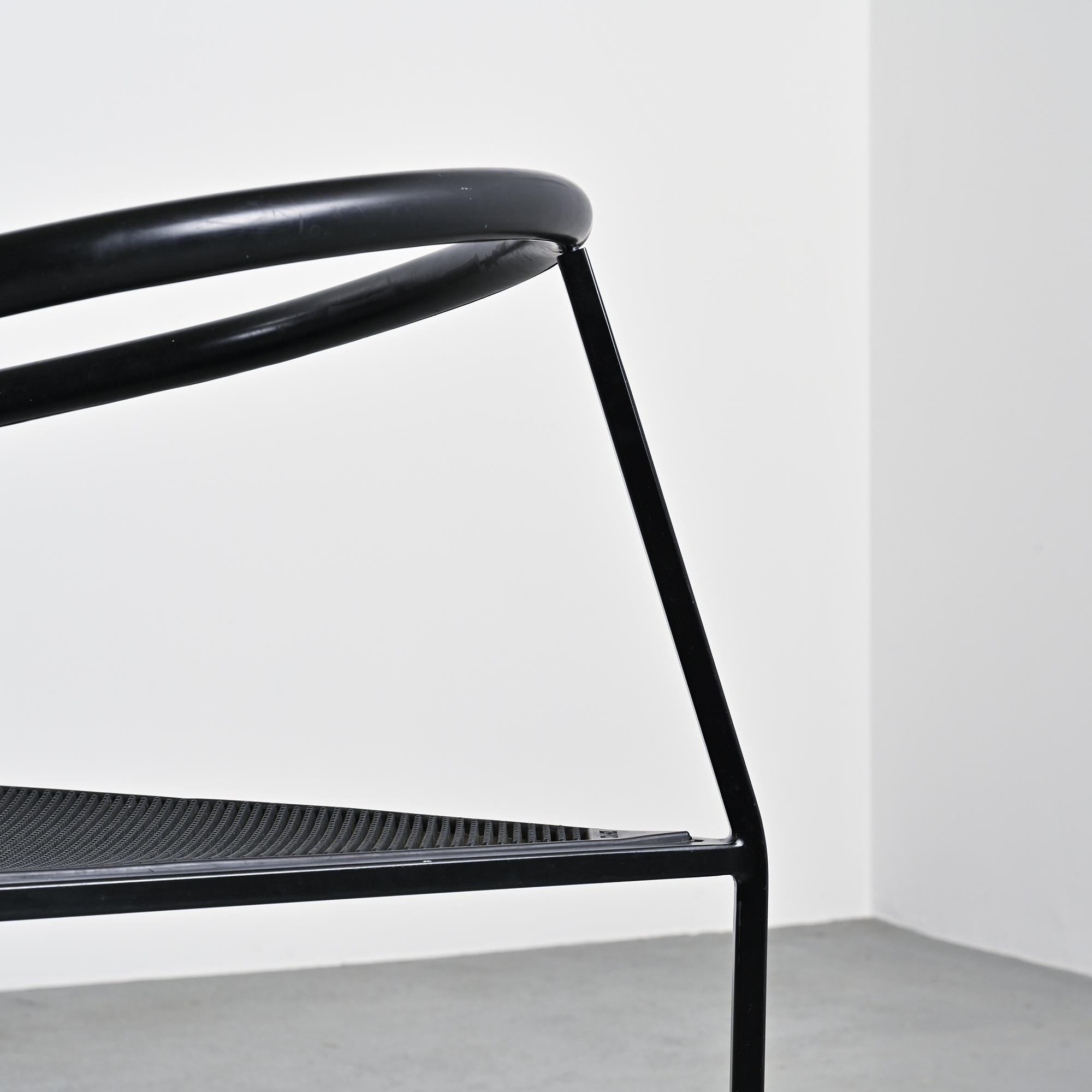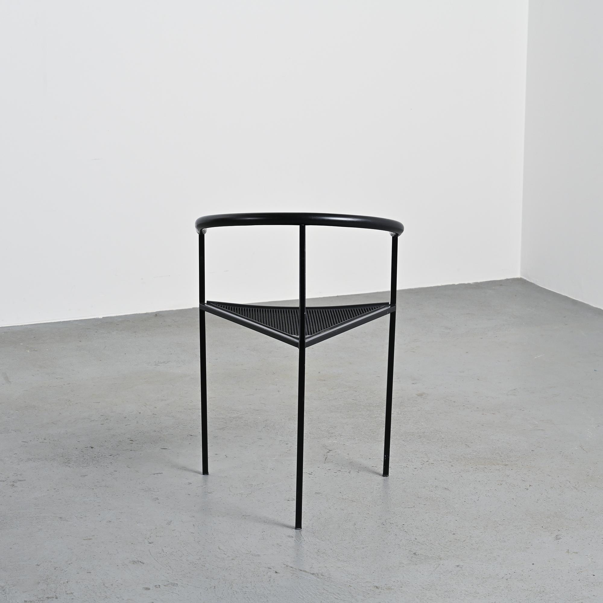 Chaque chaise présente un piètement tripode en métal laqué noir et un accotoir relié par une bande en gomme, élément caractéristique du langage industriel et expérimental développé par Zeus. La silhouette angulaire, la légèreté structurelle et le contraste des matériaux donnent à ces chaises une identité graphique forte et immédiatement reconnaissable dans la production italienne de cette période.