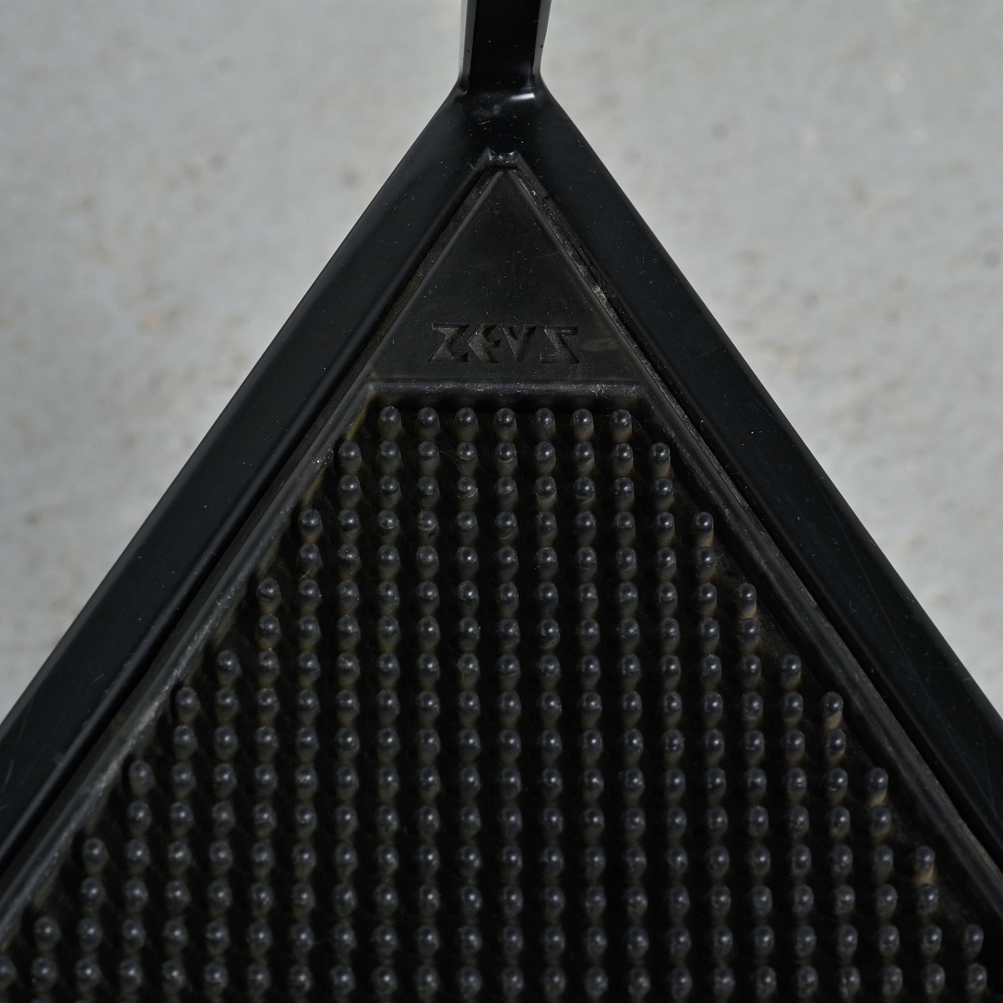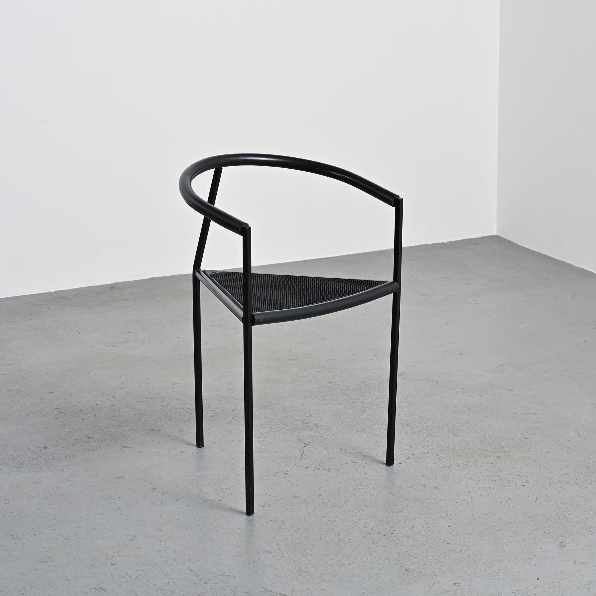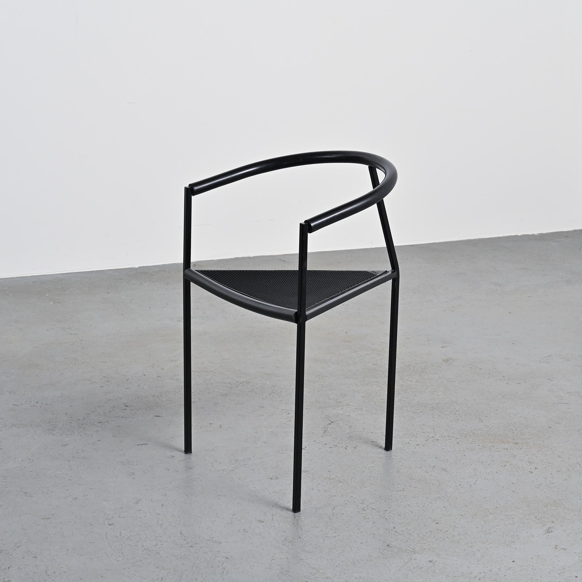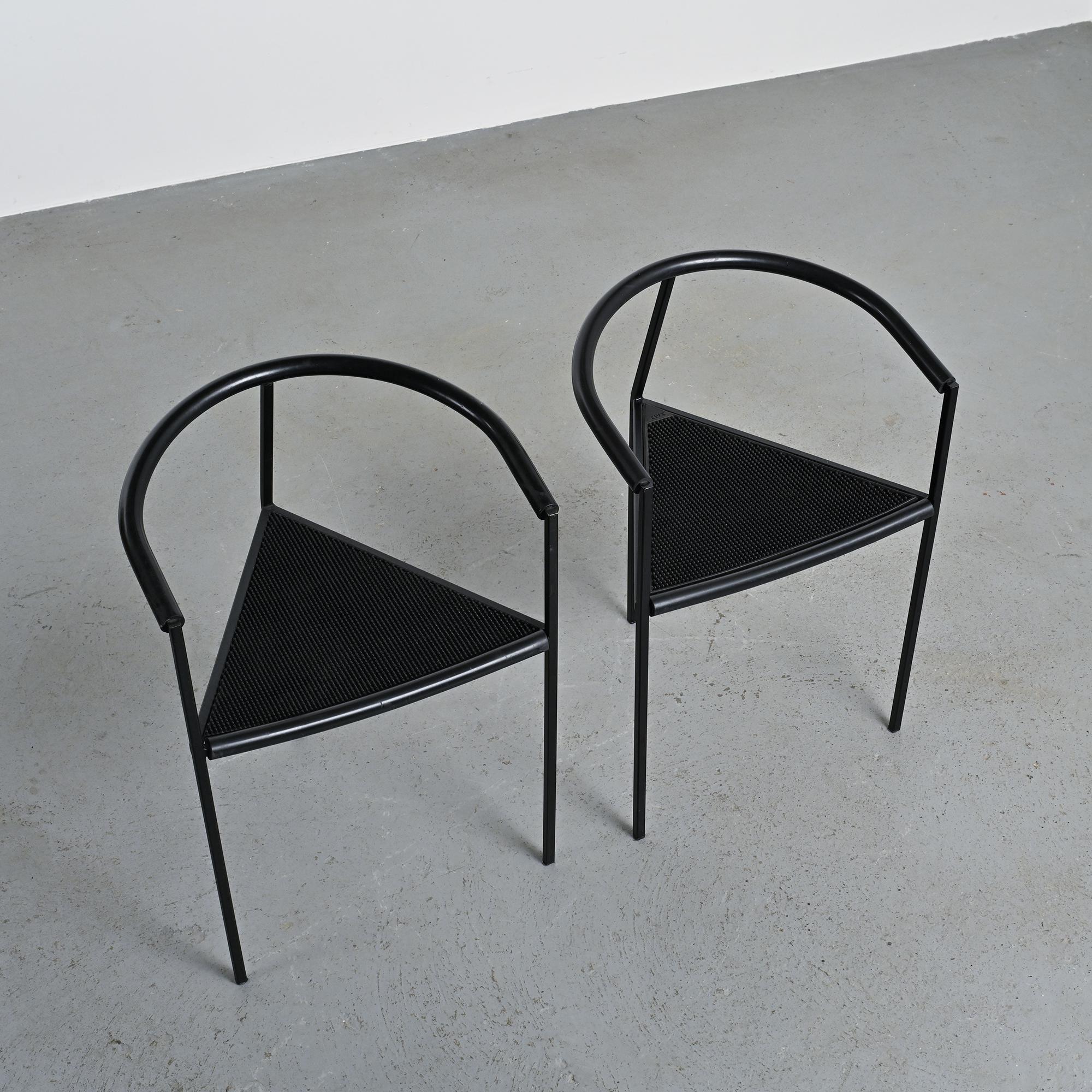 Chaque chaise présente un piètement tripode en métal laqué noir et un accotoir relié par une bande en gomme, élément caractéristique du langage industriel et expérimental développé par Zeus. La silhouette angulaire, la légèreté structurelle et le contraste des matériaux donnent à ces chaises une identité graphique forte et immédiatement reconnaissable dans la production italienne de cette période.