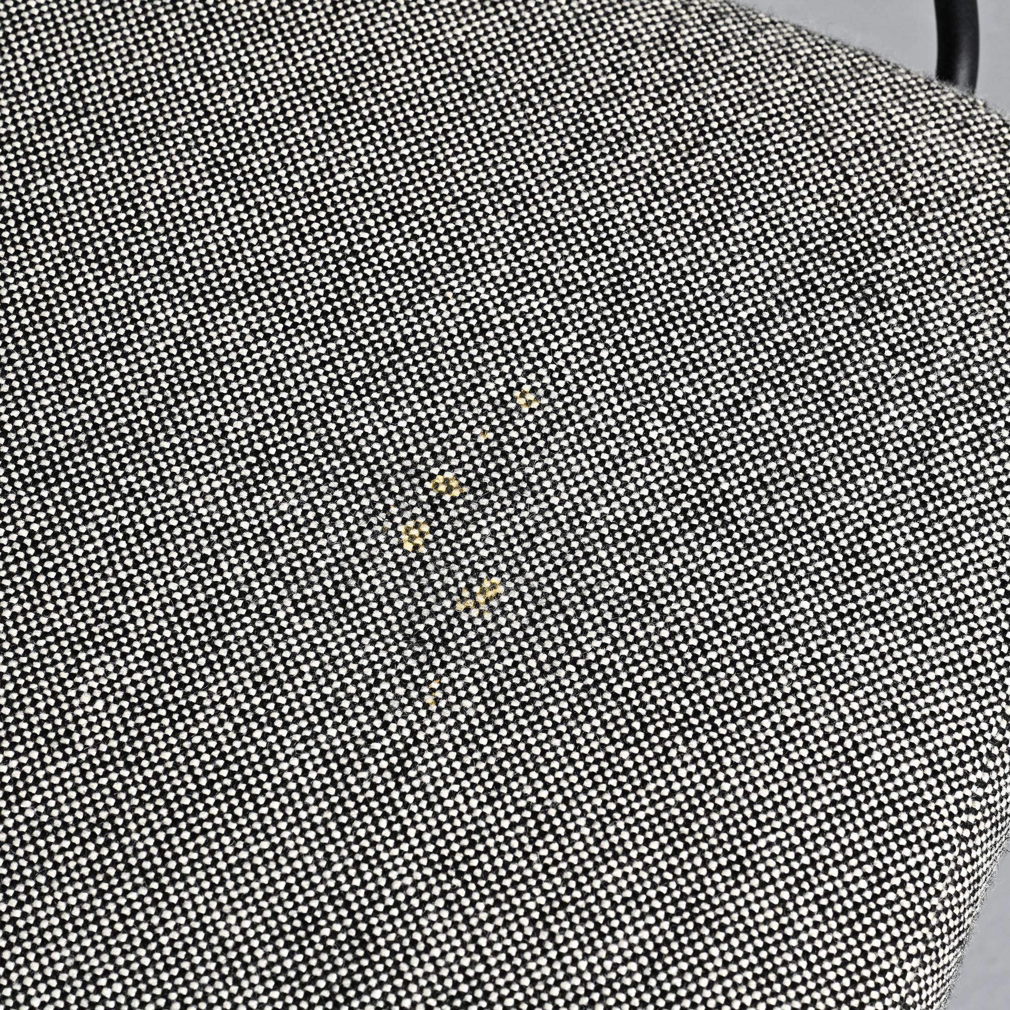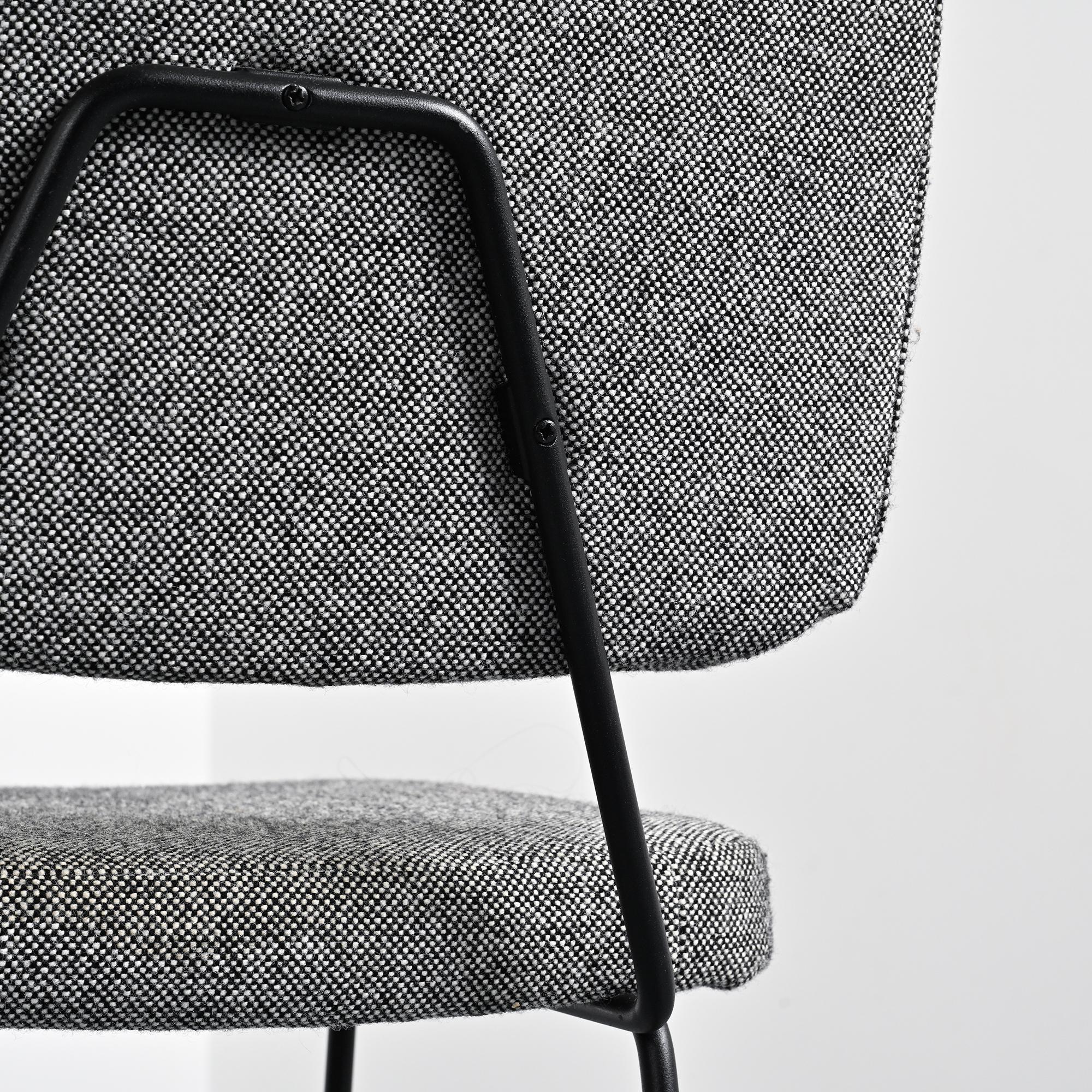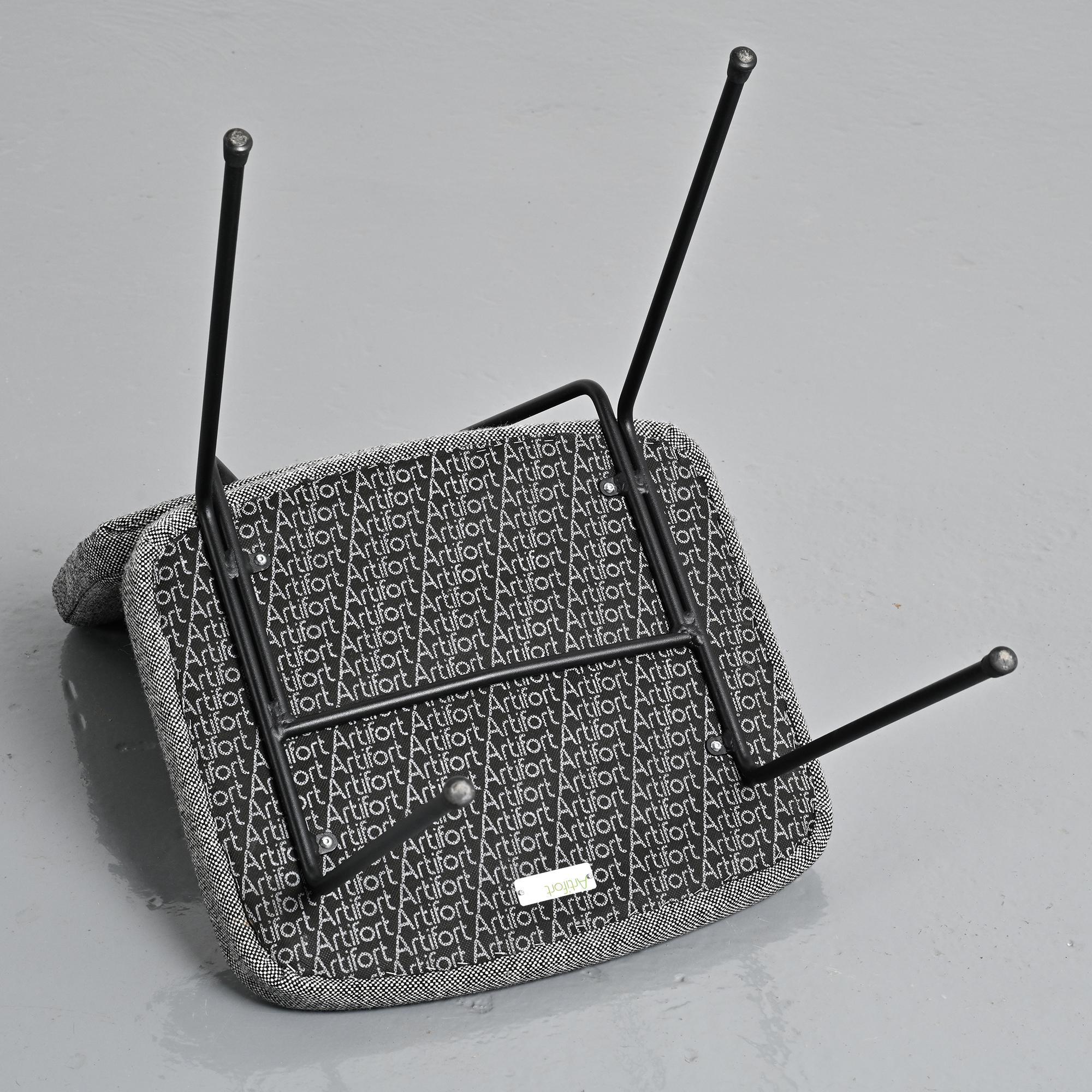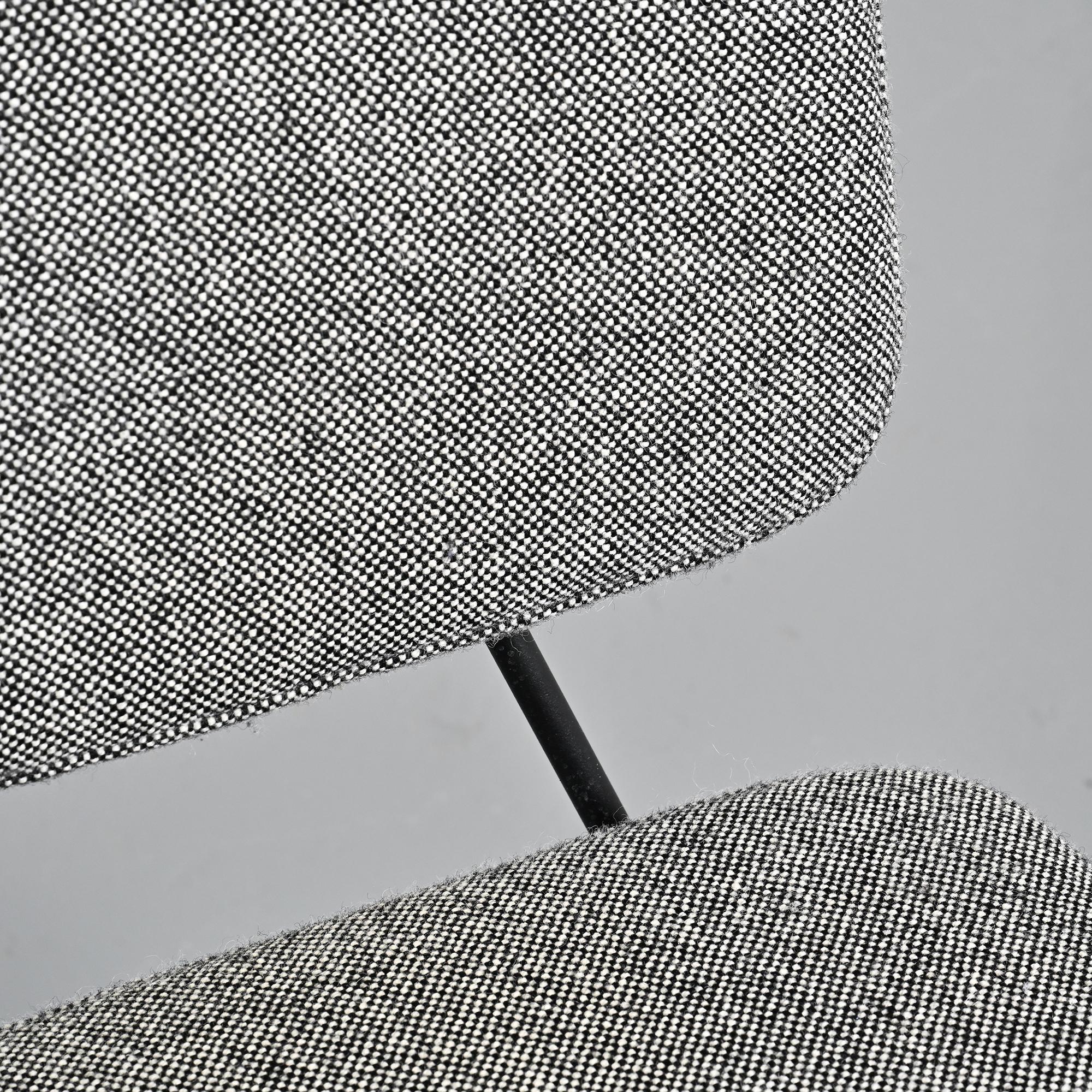 Piétement en métal tubulaire laqué noir, dessinant une structure ouverte et légère. L'assise et le dossier tapissés, habillés d'un tissu en laine Kvadrat sélectionné par Artifort, apportent une présence plus douce en contraste avec la ligne du châssis.