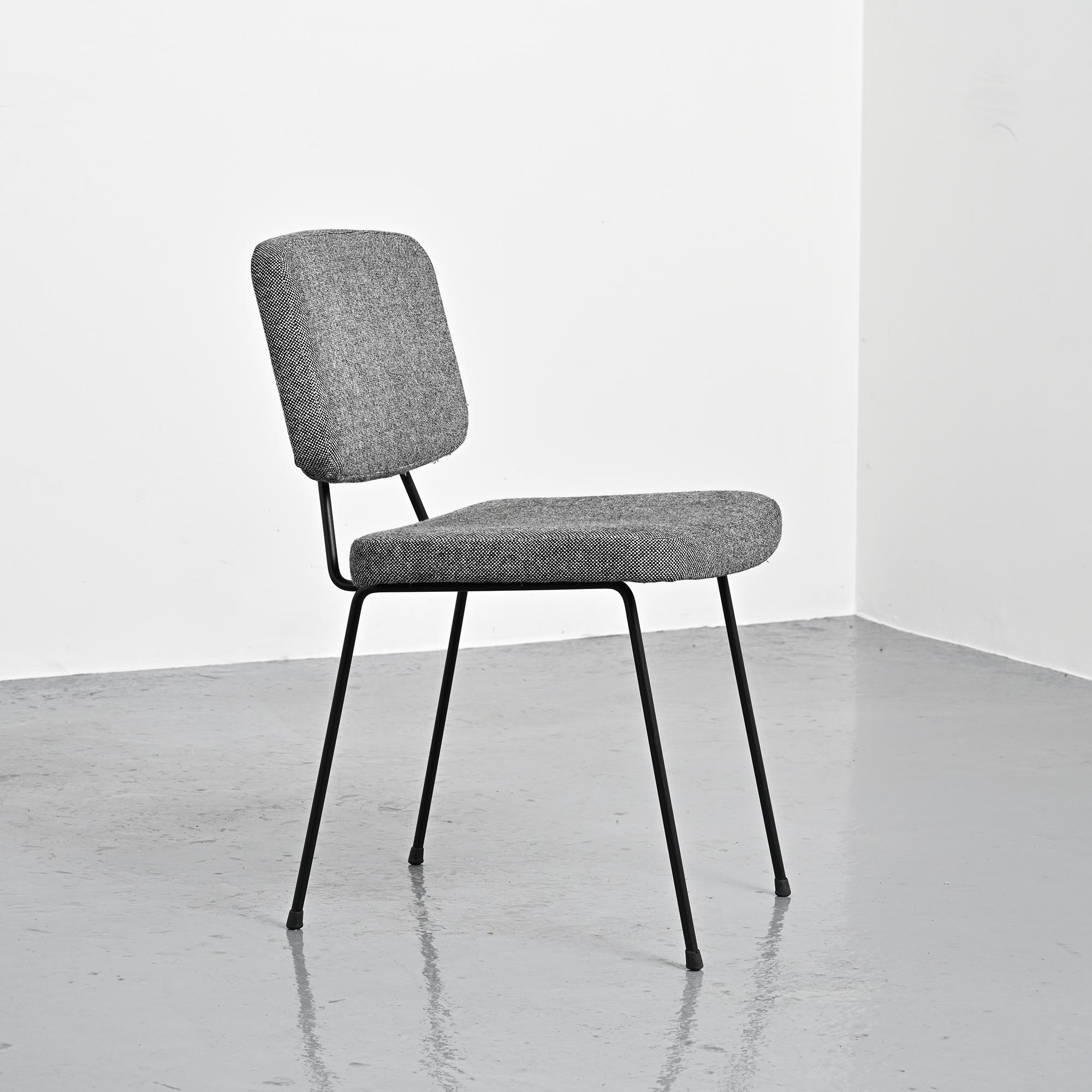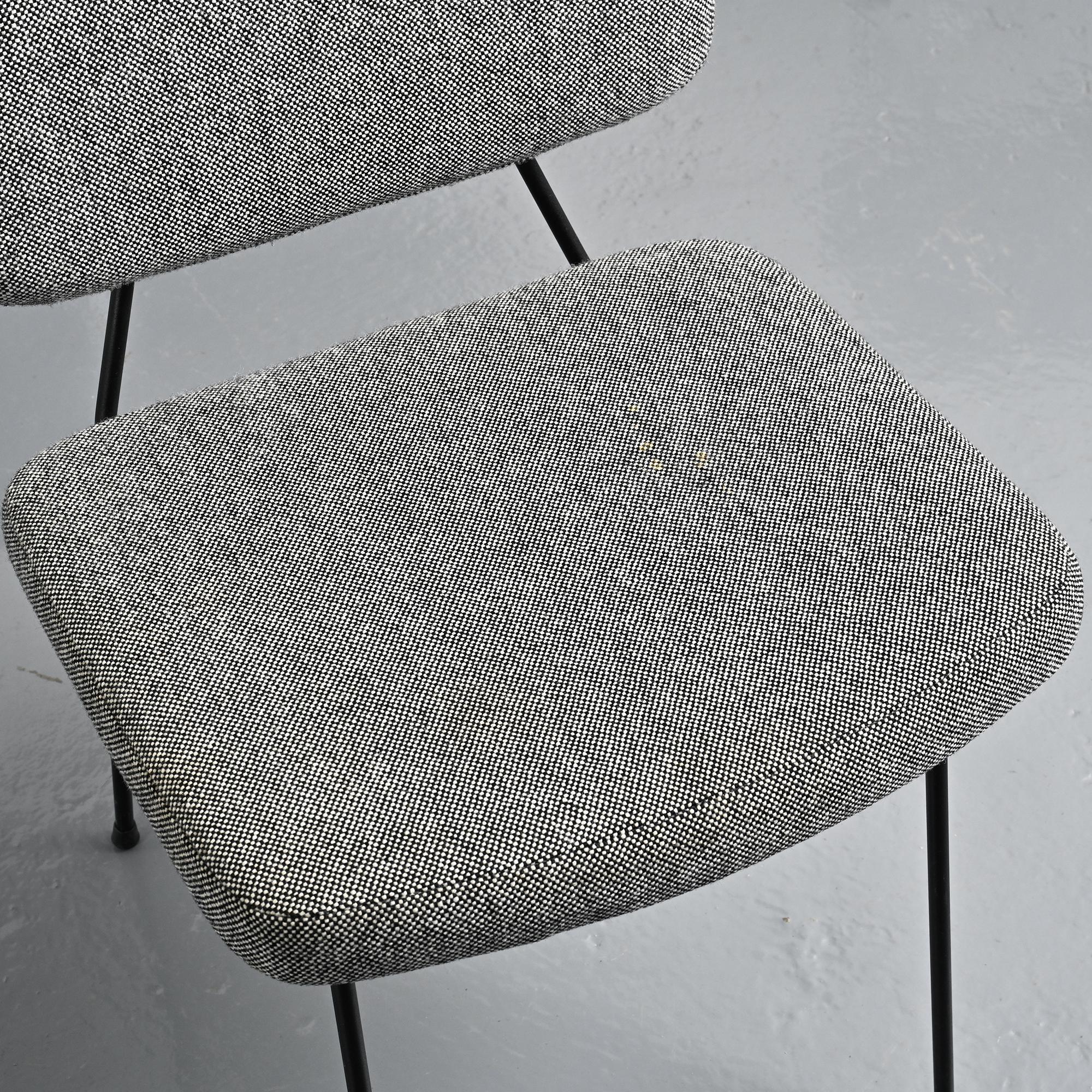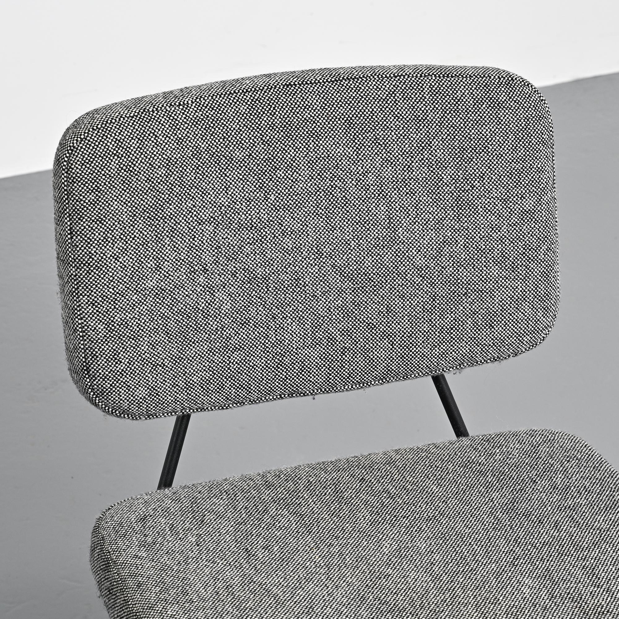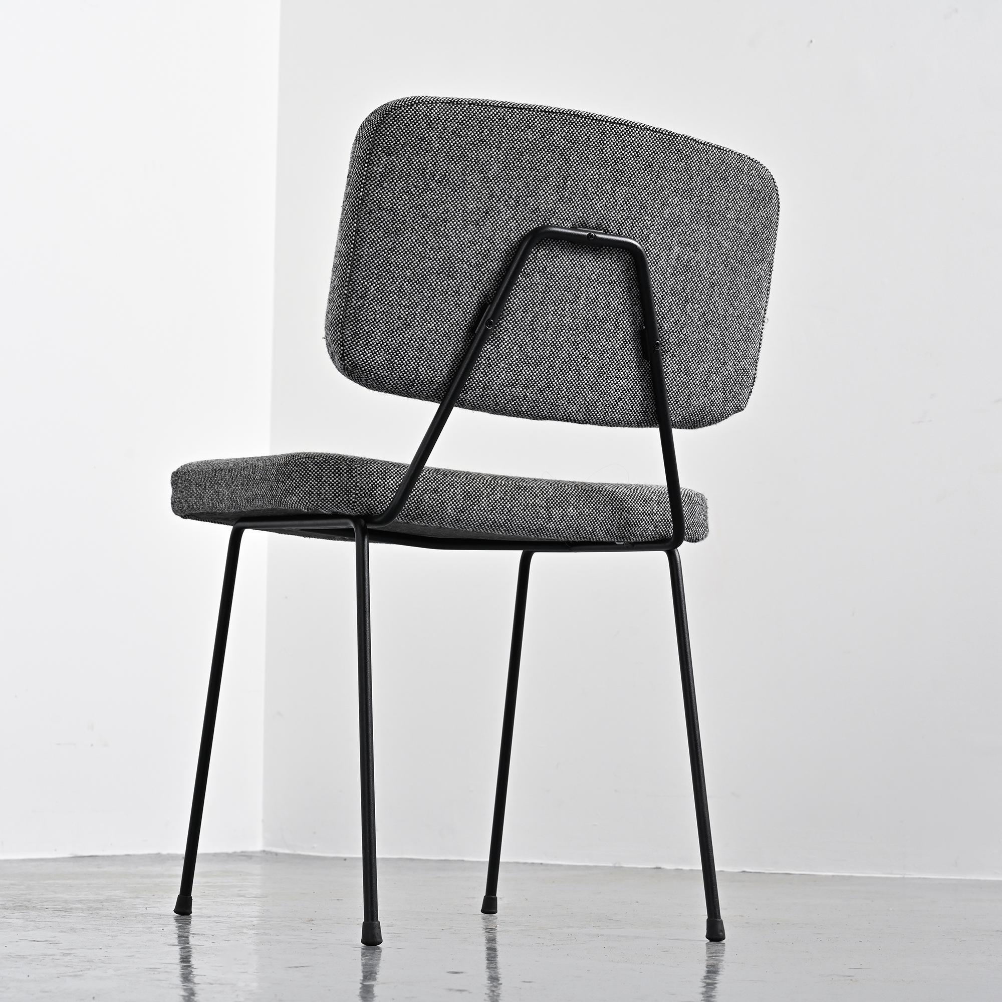 Piétement en métal tubulaire laqué noir, dessinant une structure ouverte et légère. L'assise et le dossier tapissés, habillés d'un tissu en laine Kvadrat sélectionné par Artifort, apportent une présence plus douce en contraste avec la ligne du châssis.