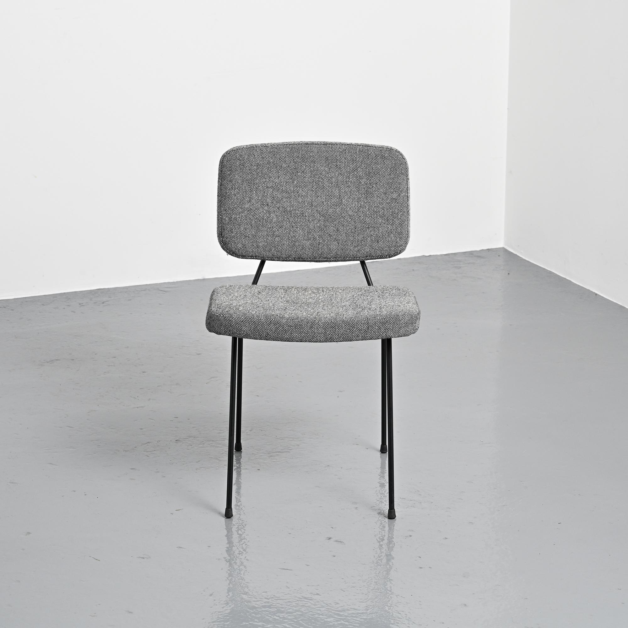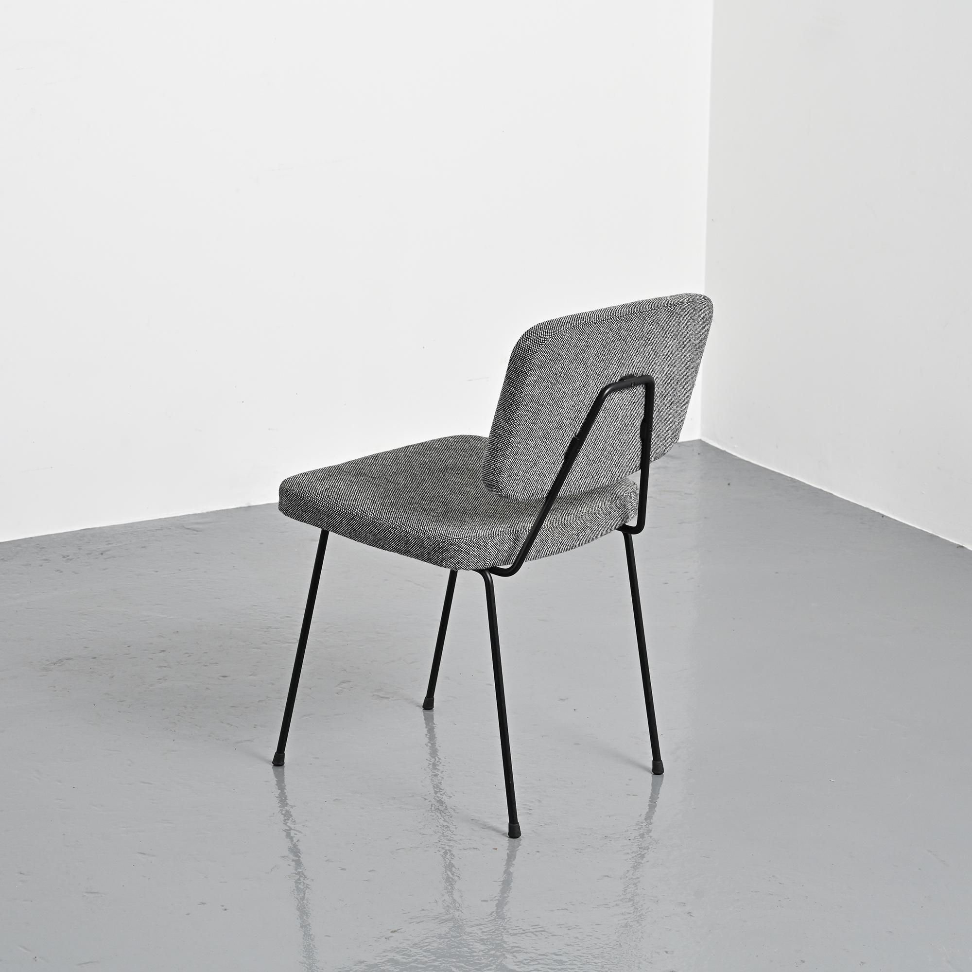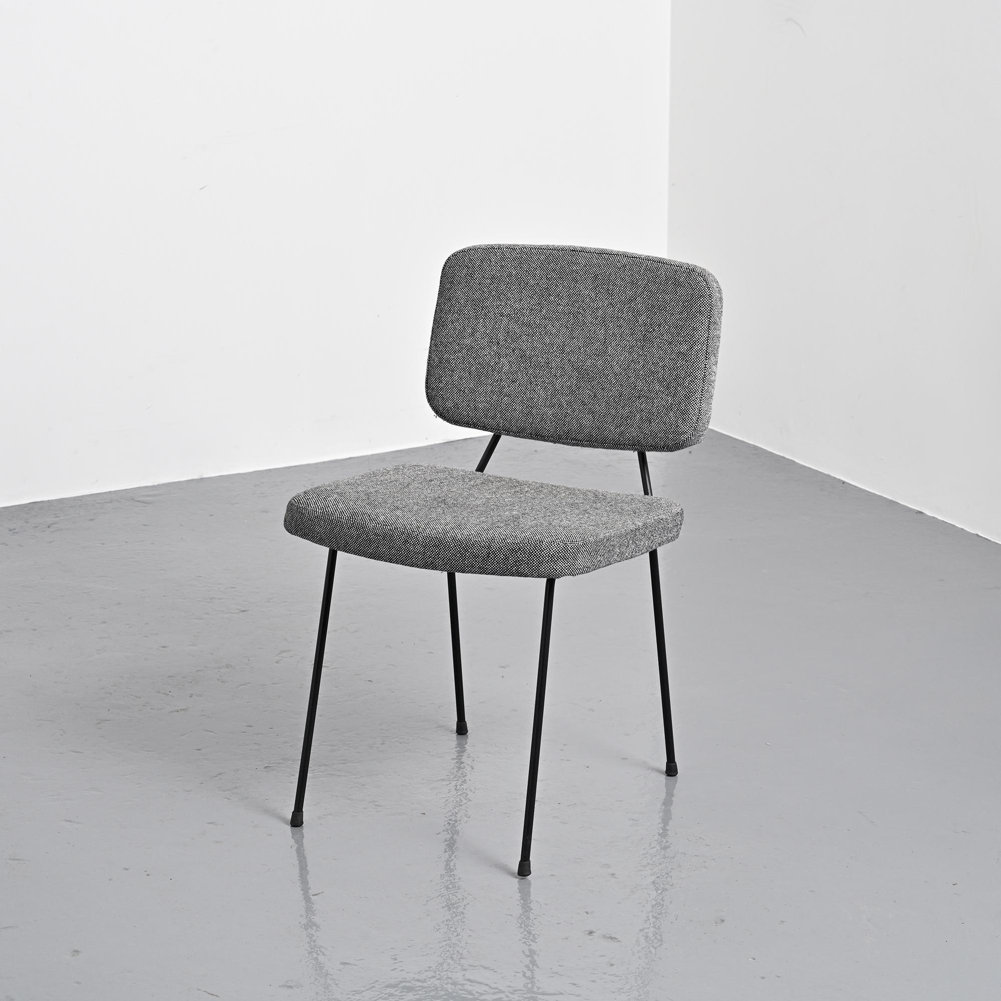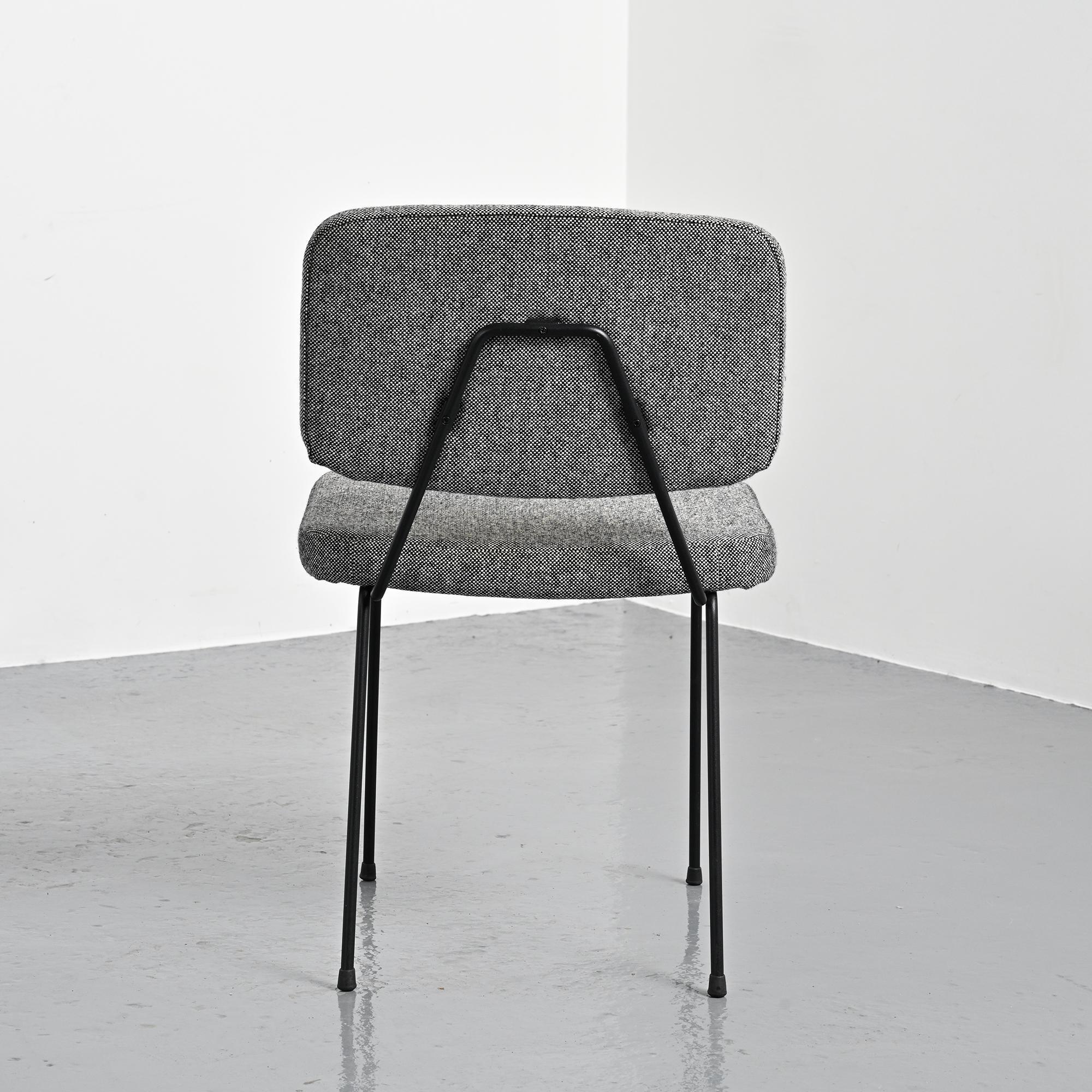 Piétement en métal tubulaire laqué noir, dessinant une structure ouverte et légère. L'assise et le dossier tapissés, habillés d'un tissu en laine Kvadrat sélectionné par Artifort, apportent une présence plus douce en contraste avec la ligne du châssis.