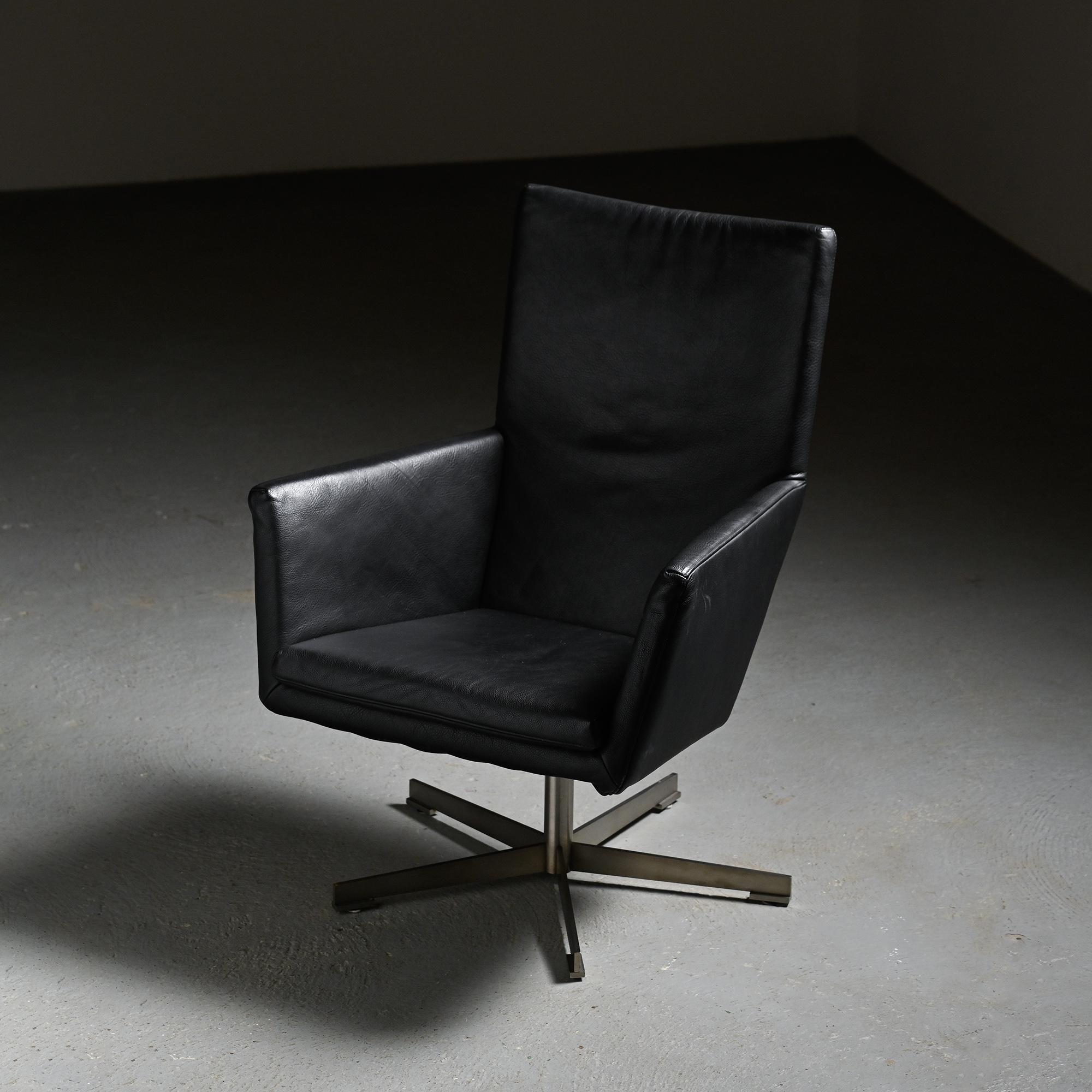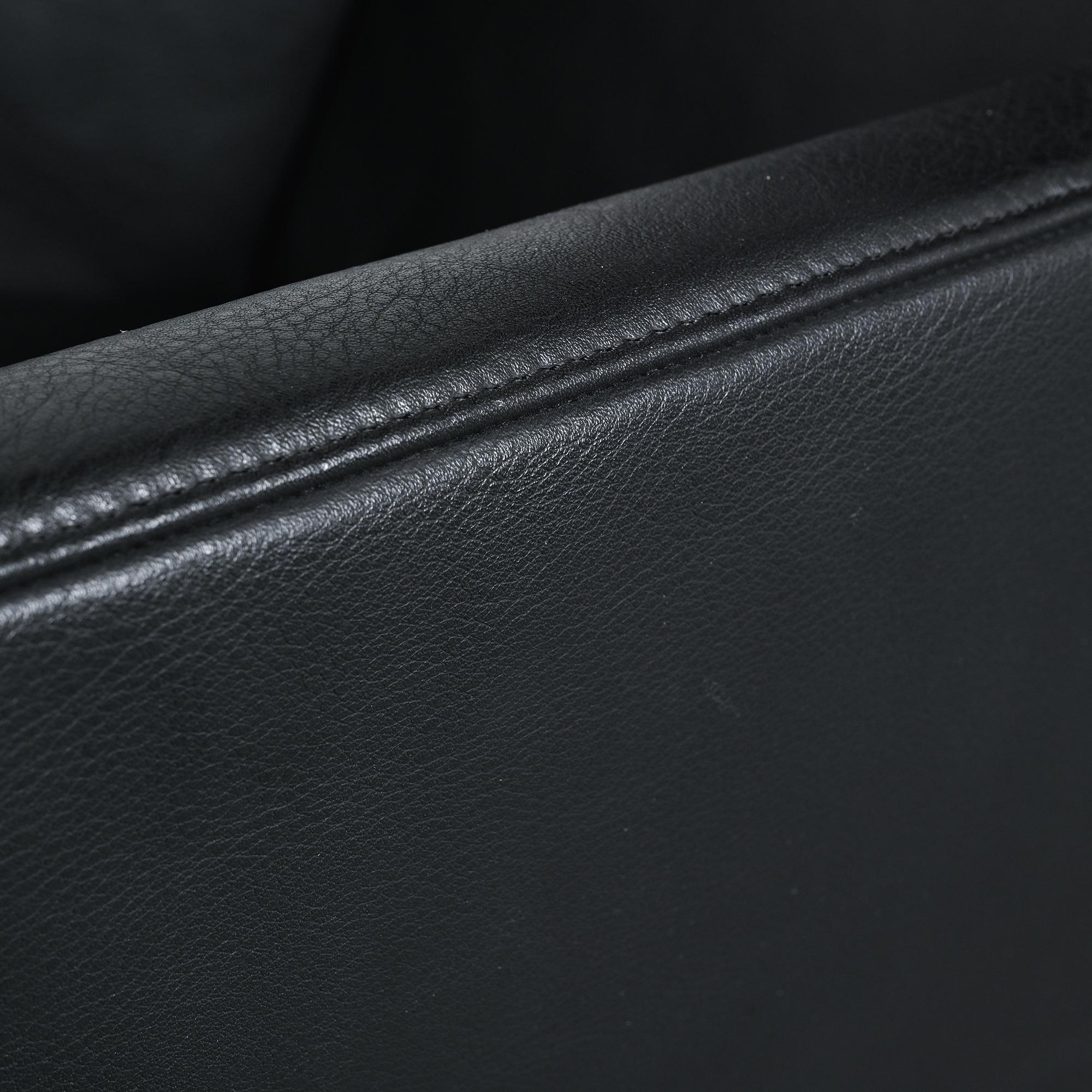 Le fauteuil présente une assise profonde associée à un dossier haut légèrement incliné, offrant un confort enveloppant. Il repose sur un piètement central pivotant en métal. L'ensemble est entièrement revêtu de cuir noir pleine fleur, monté selon le système Jacket développé par Montis, caractérisé par une housse en cuir amovible fixée par fermetures éclair sur la structure. Ce procédé permet une tension précise du cuir et une lecture directe de la construction.