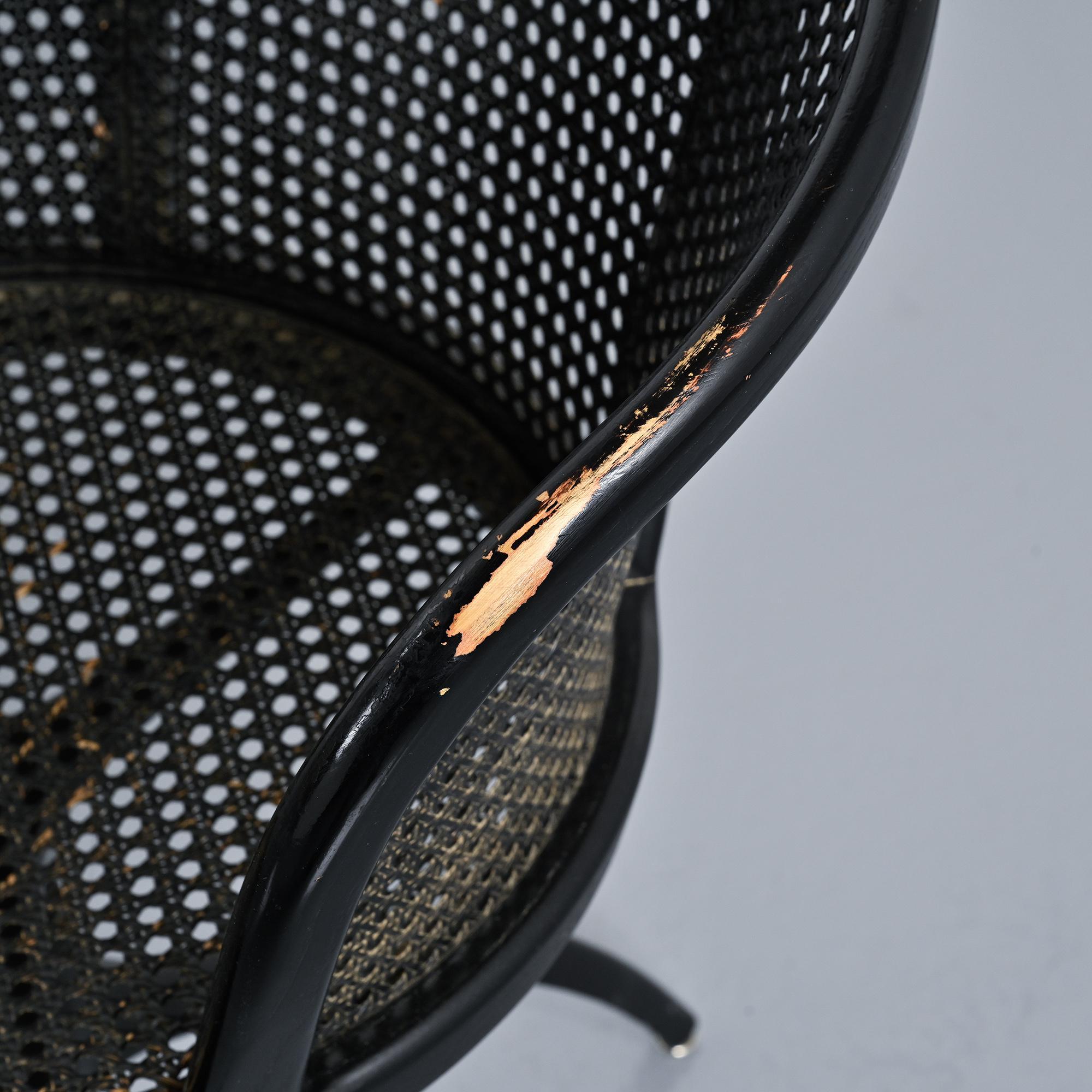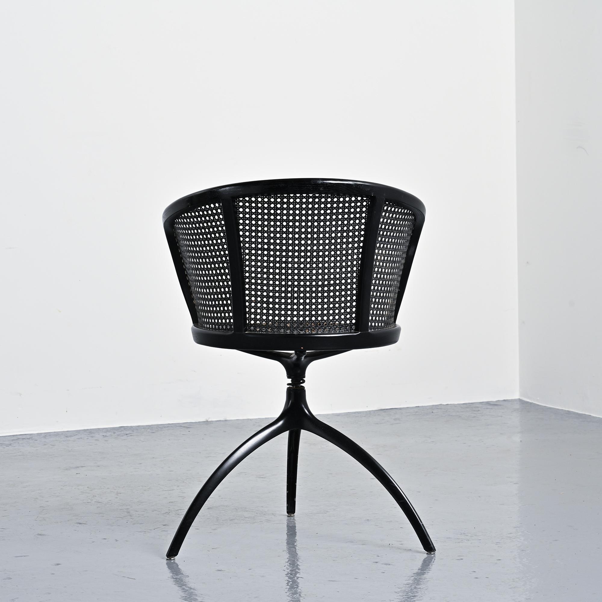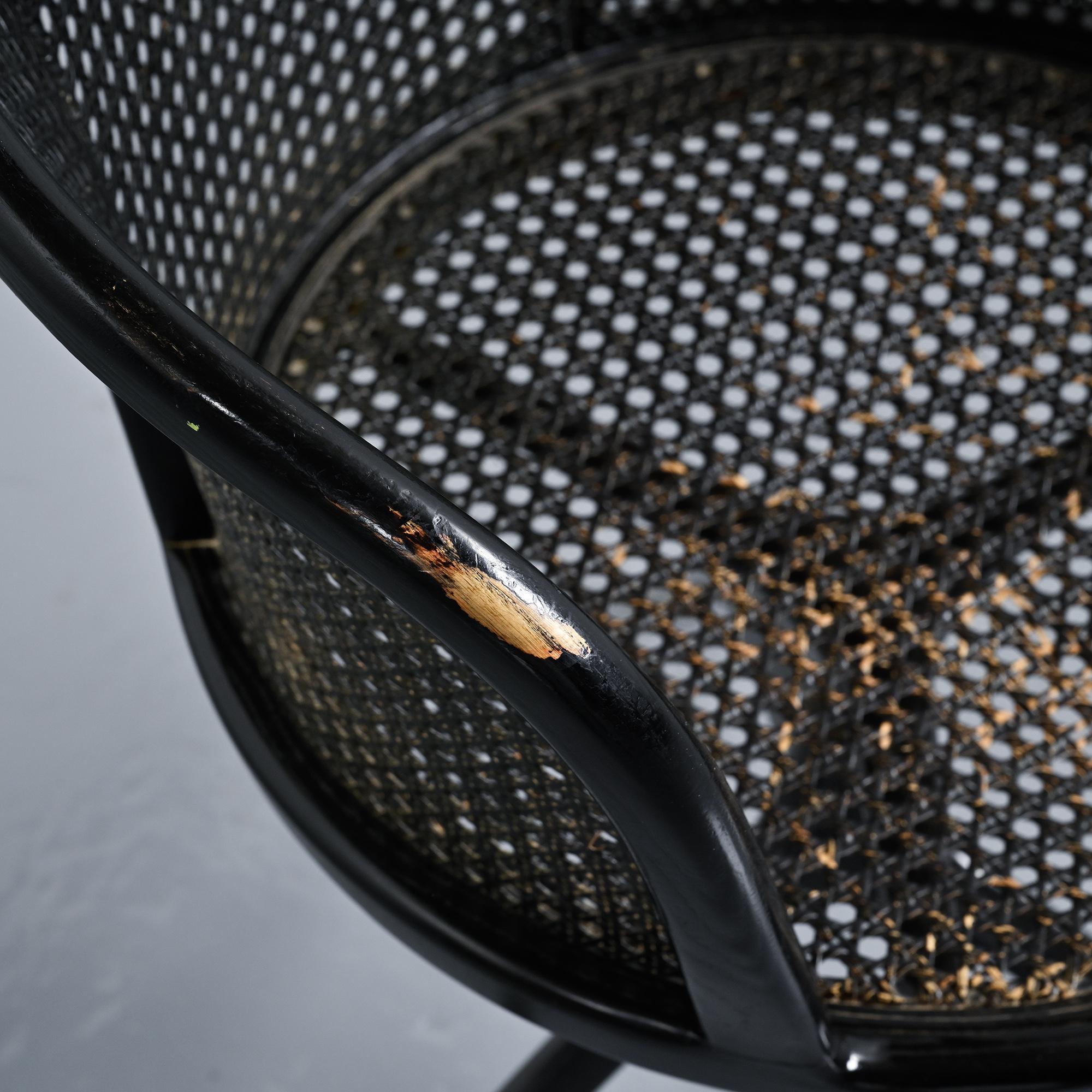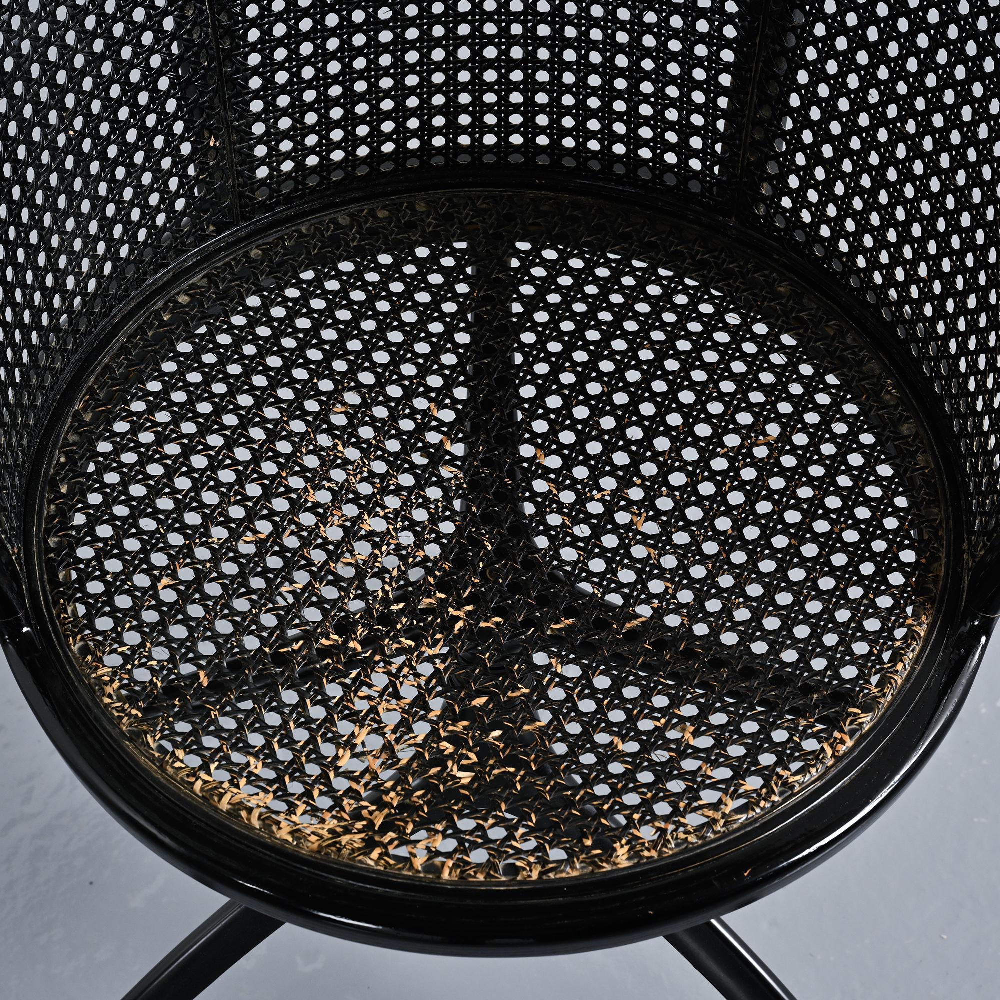 Structure tripode en aluminium moulé sous pression laqué noir. Assise circulaire et dossier courbe en frêne massif teinté noir, garnis d'un cannage en paille de Vienne.