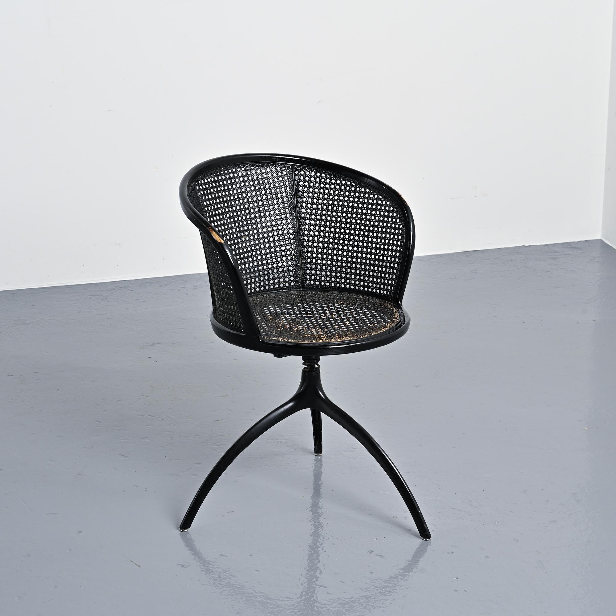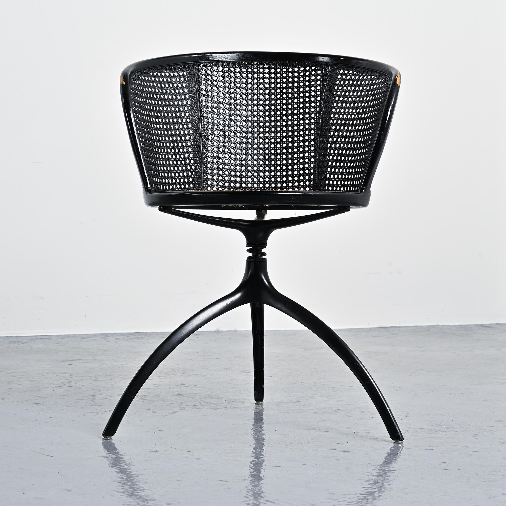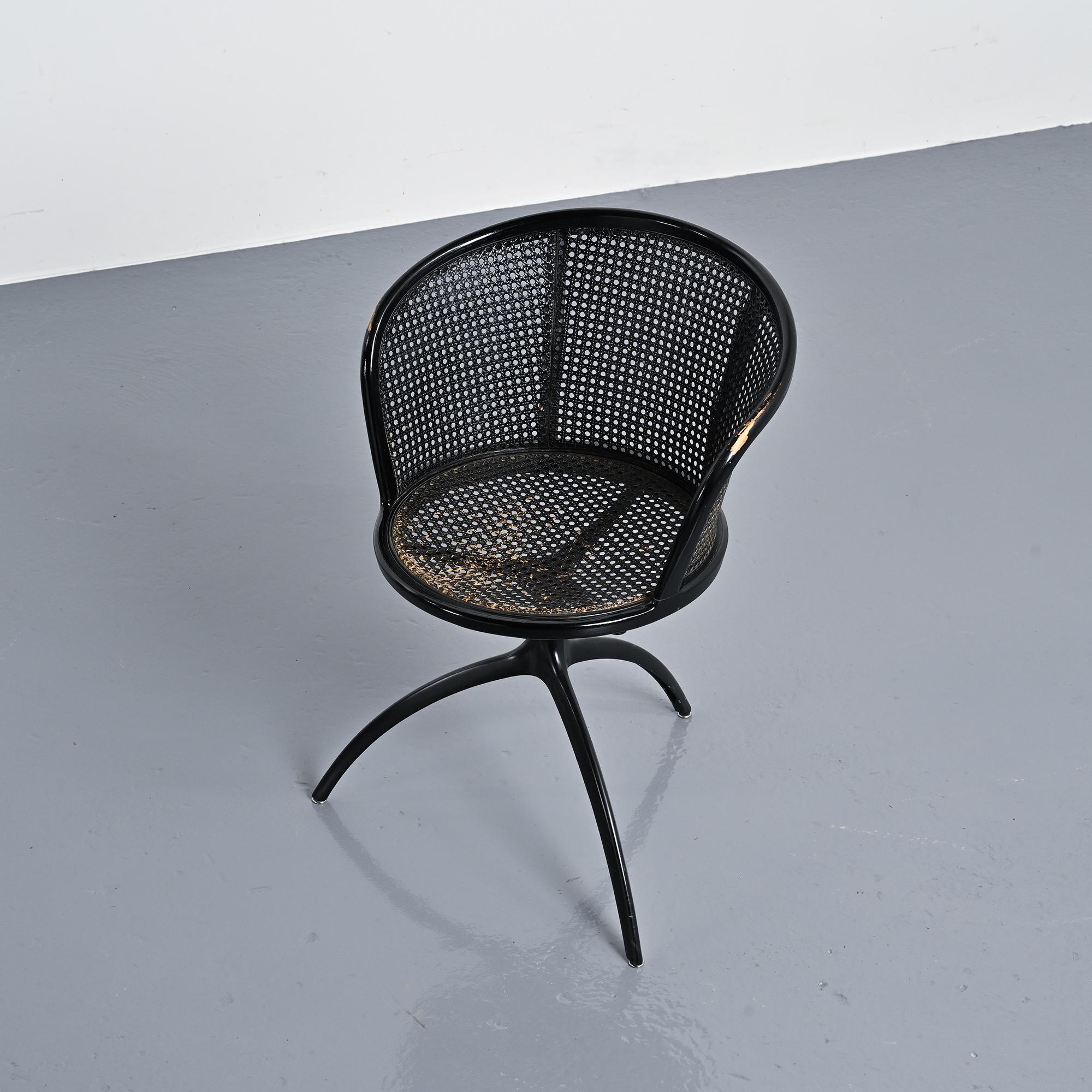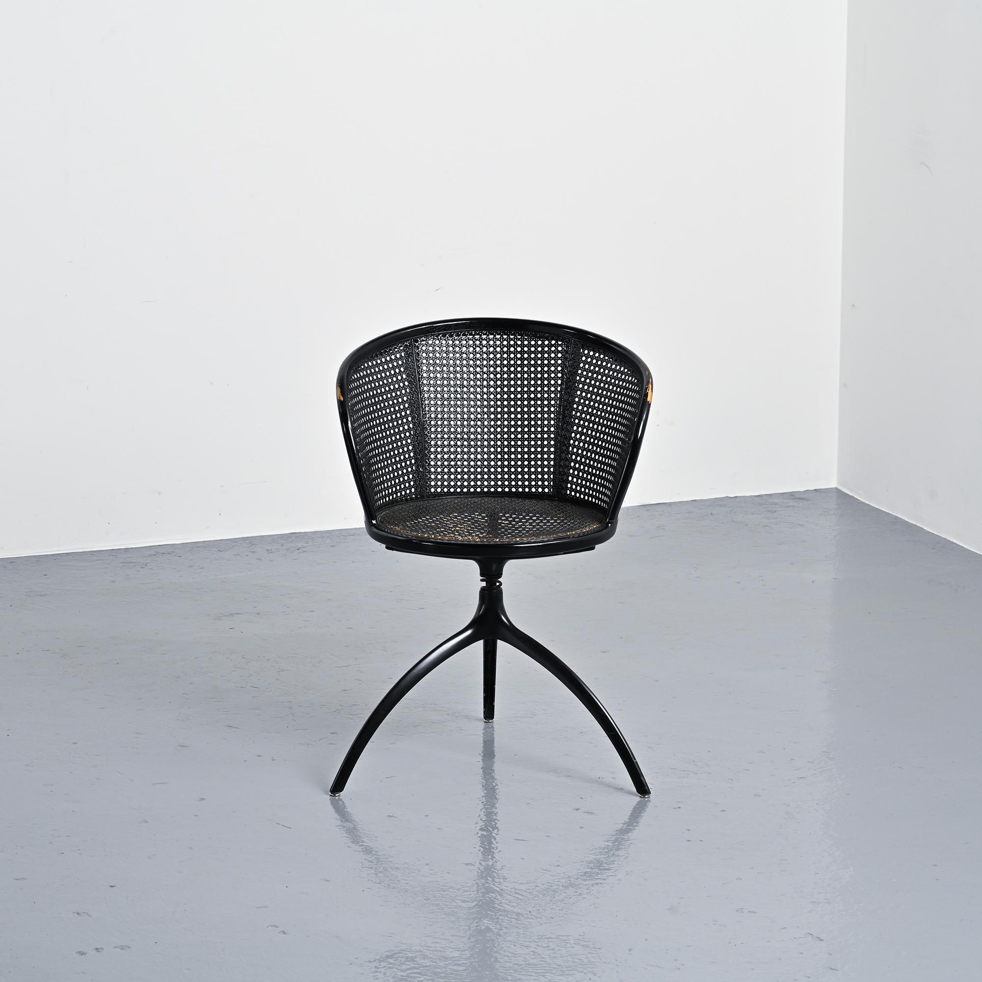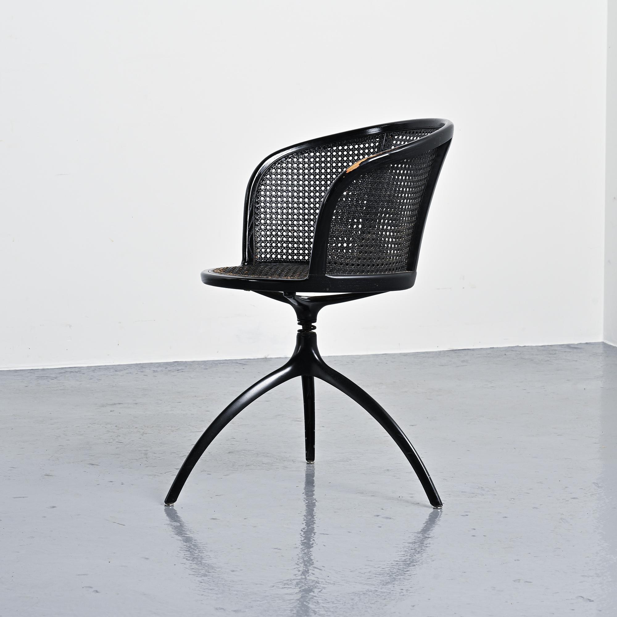 Structure tripode en aluminium moulé sous pression laqué noir. Assise circulaire et dossier courbe en frêne massif teinté noir, garnis d'un cannage en paille de Vienne.