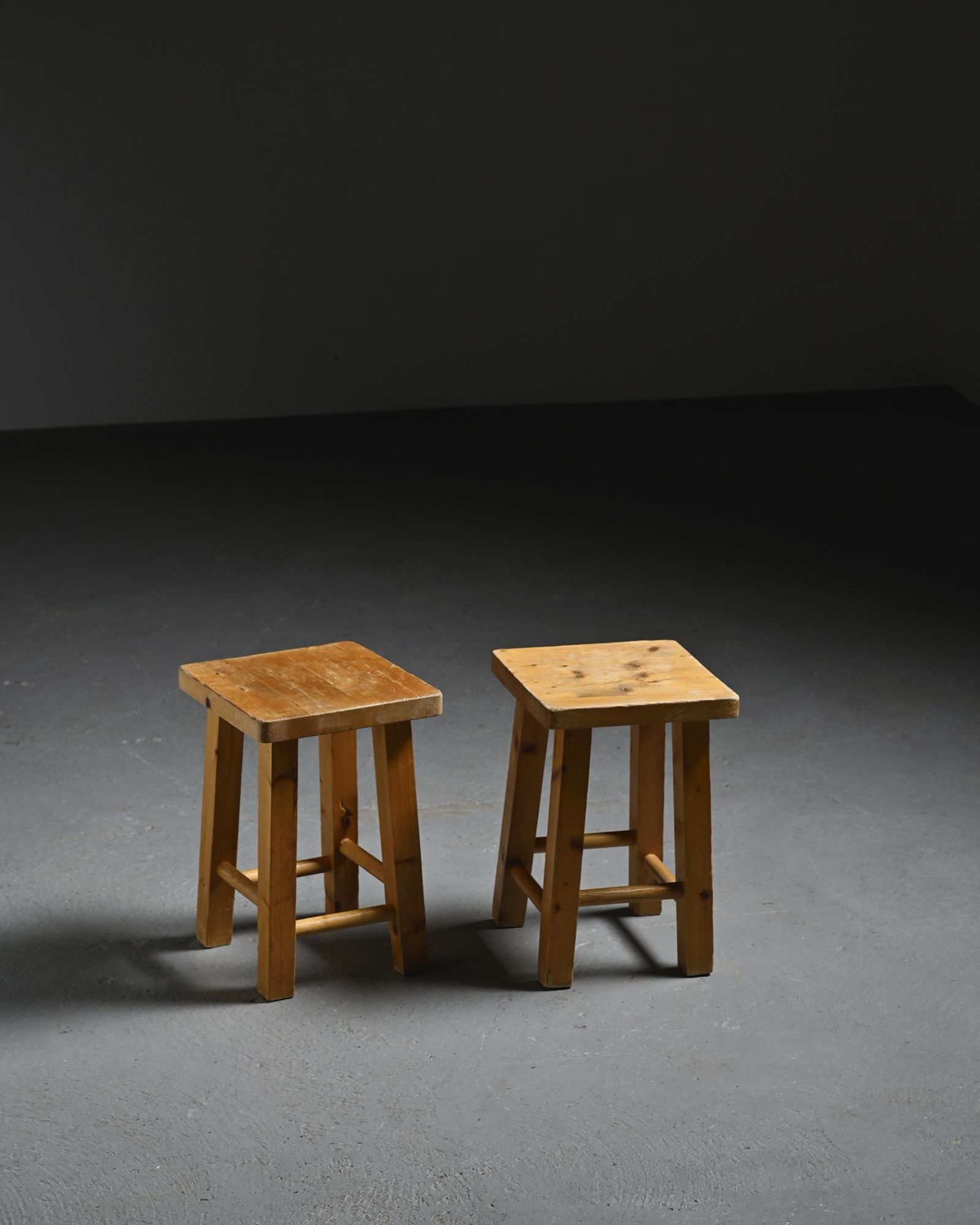 Paire de tabourets à quatre pieds quadrangulaires, reliés par des entretoises cylindriques décalées, créant un jeu rythmique dans la structure. Dessinés par Charlotte Perriand, ces modèles s'inscrivent dans son travail global d'architecture intérieure et d'équipements pour l'immeuble La Pierra Menta, conçu dans le cadre du vaste projet des Arcs.