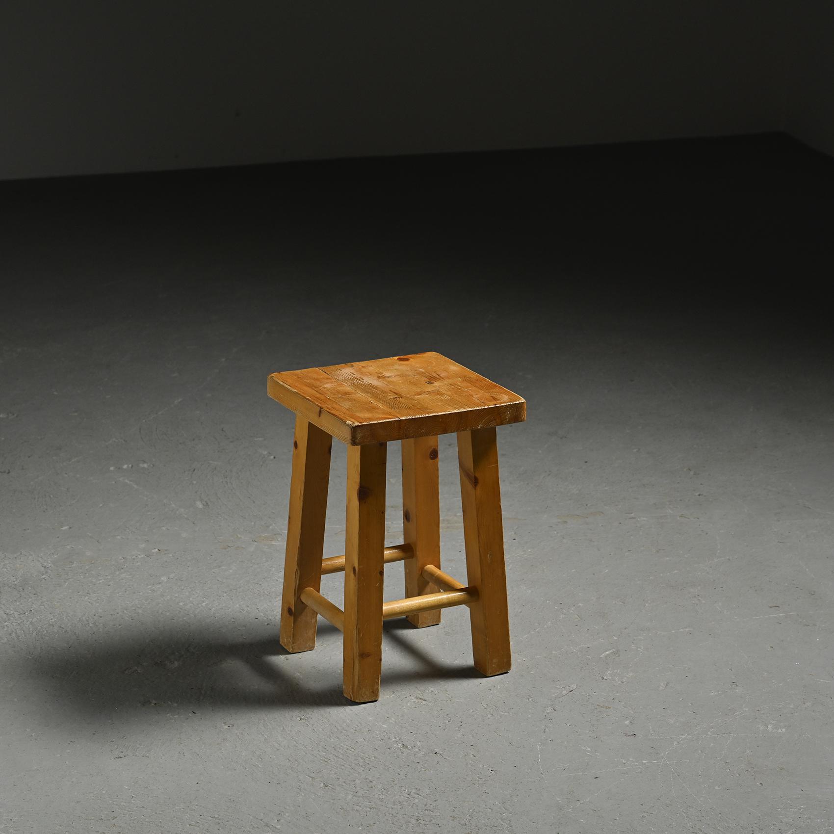 Tabouret à quatre pieds quadrangulaires, reliés par des entretoises cylindriques décalées qui animent la structure d'un rythme discret. Conçu par Charlotte Perriand dans le cadre de son travail d'architecture intérieure et d'équipements pour l'immeuble La Pierra Menta aux Arcs, il témoigne de sa volonté d'associer robustesse et simplicité dans un mobilier pensé pour la vie collective en montagne.