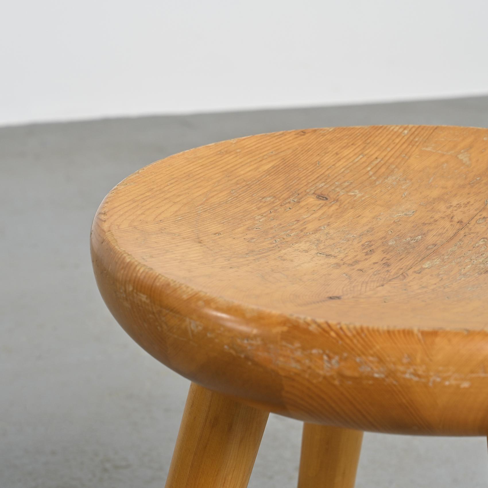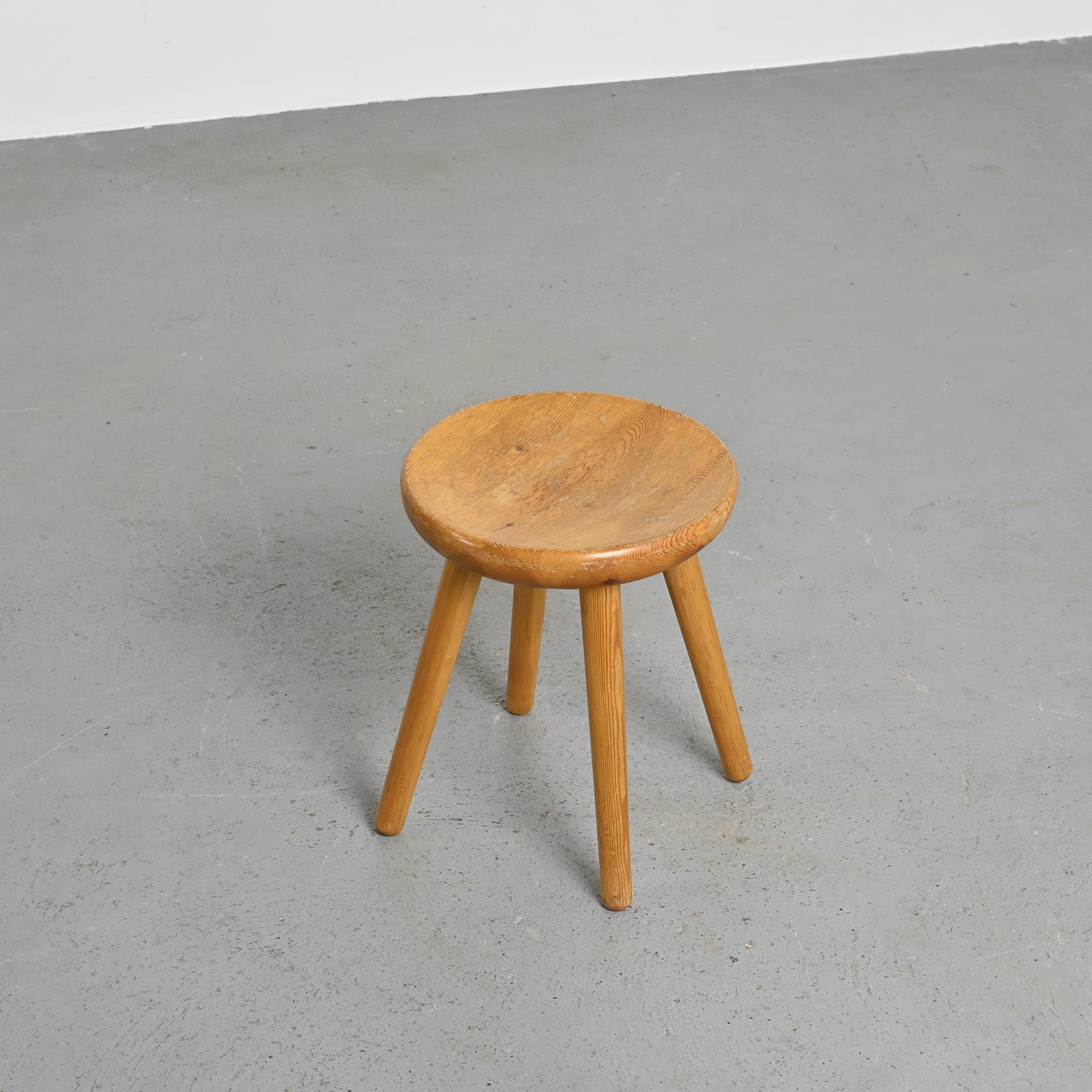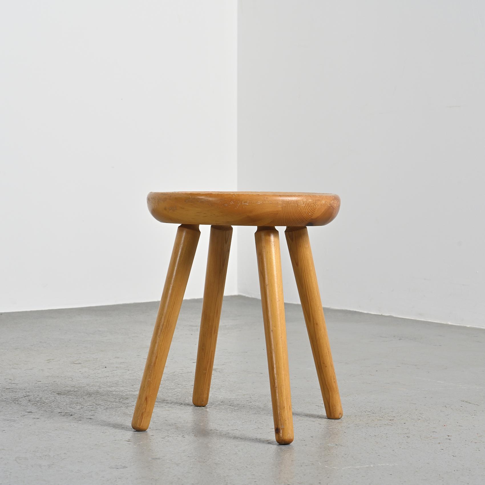 Reposant sur une base quadripode à pieds tournés, ce tabouret présente une assise circulaire épaisse légèrement creusée, révélant le veinage naturel du pin. Alliant simplicité, solidité et élégance rustique, il incarne parfaitement l'esprit du mobilier de montagne moderniste, pensé pour durer et s'intégrer à l'architecture.