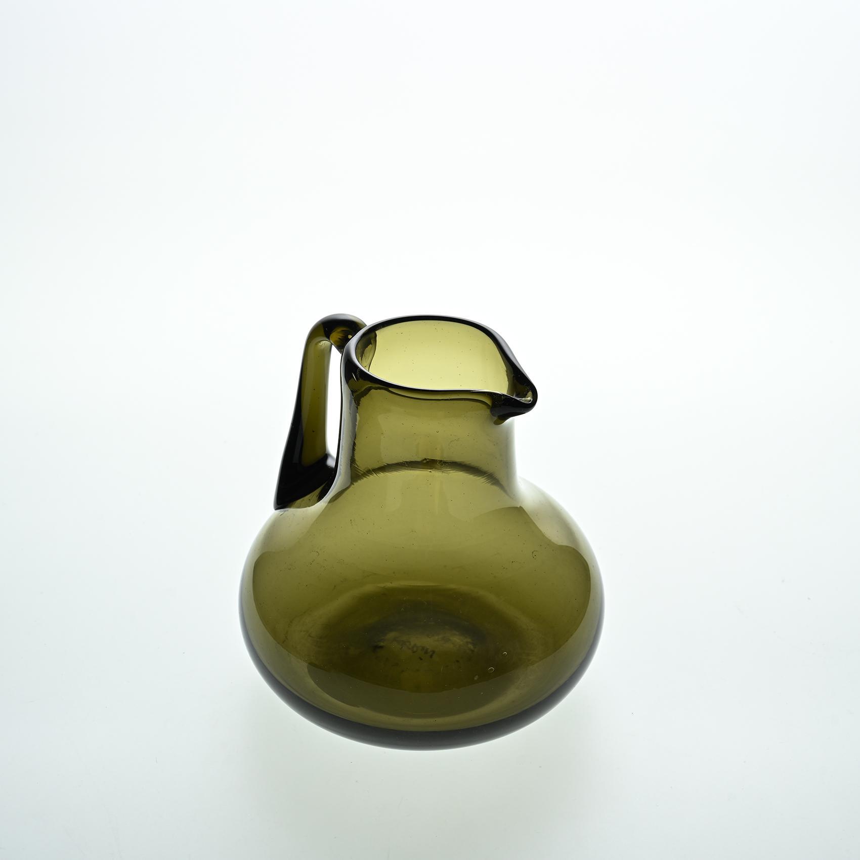 Soufflée à la bouche dans un verre vert olive, cette cruche se caractérise par une panse arrondie, un col élancé et une anse rapportée d'un geste précis. Les fines bulles emprisonnées dans la matière soulignent le caractère vivant de l'œuvre. À la croisée de l'objet utilitaire et de la sculpture décorative, cette pièce incarne le langage poétique de Claude Morin.