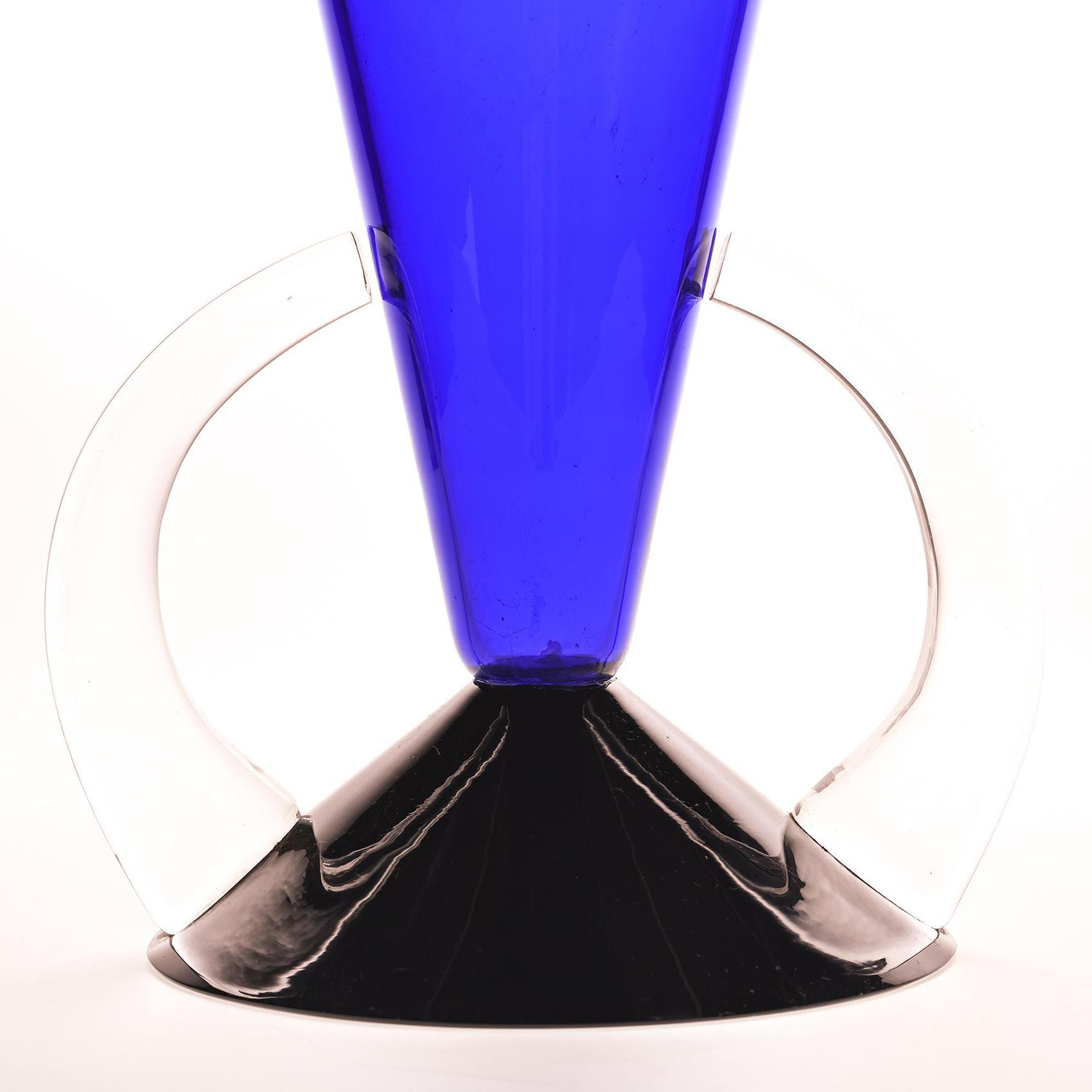Connu sous le nom de modèle Nike, il est en verre soufflé à la main de couleur bleu foncé à deux anses.