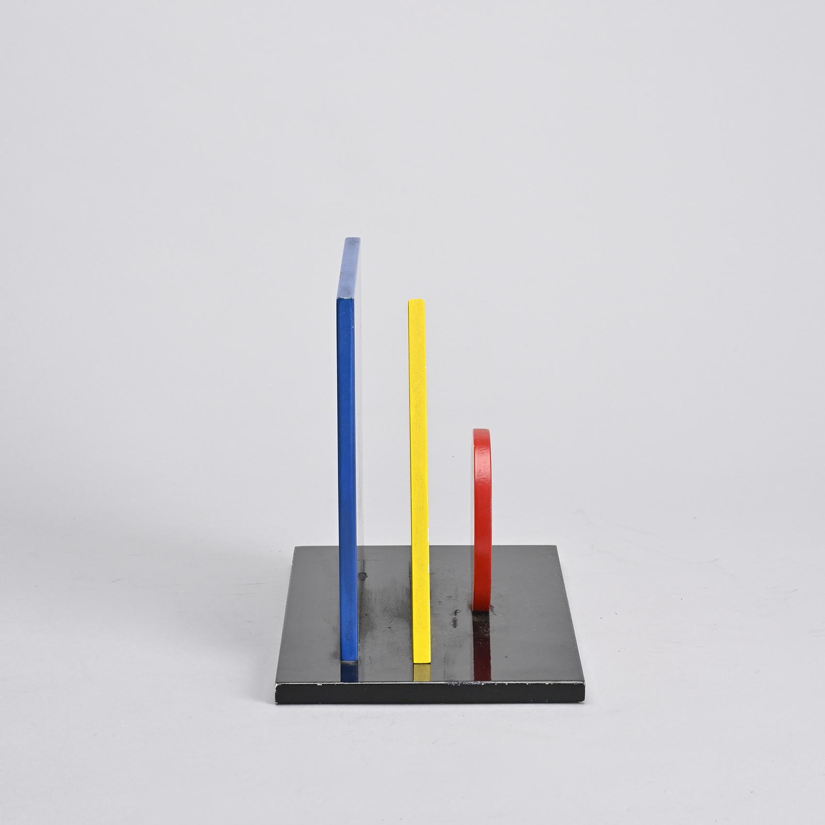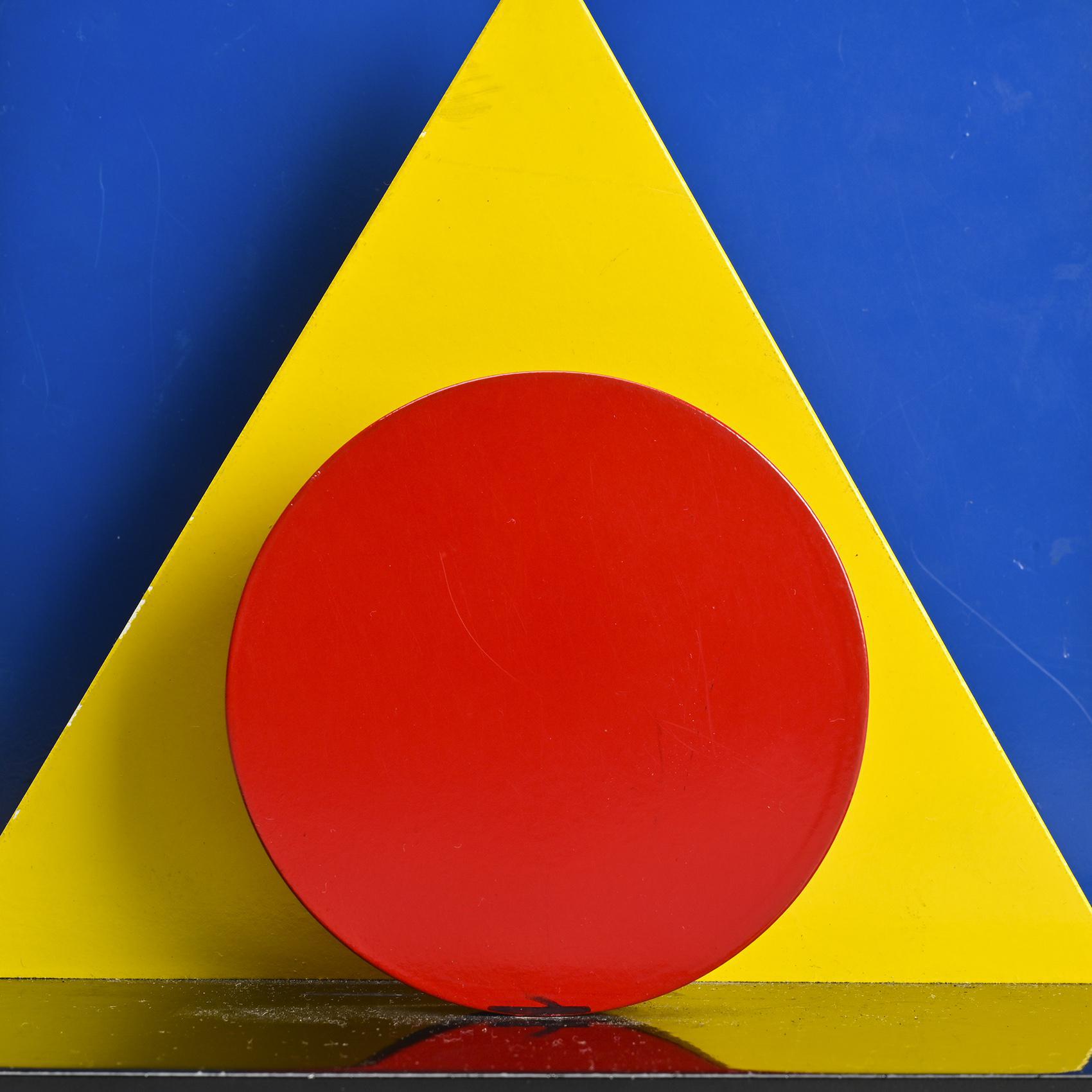 Composée de formes géométriques élémentaires déclinées, cercle, triangle, carré,- cette sculpture en bois laqué illustre le vocabulaire formel de Robert-Jean Chapuis, à la croisée du Bauhaus et du néo-constructivisme. Sa composition frontale, posée sur un socle noir brillant, joue des contrastes de couleurs primaires et de volumes épurés, évoquant une architecture miniature ou une icône graphique.