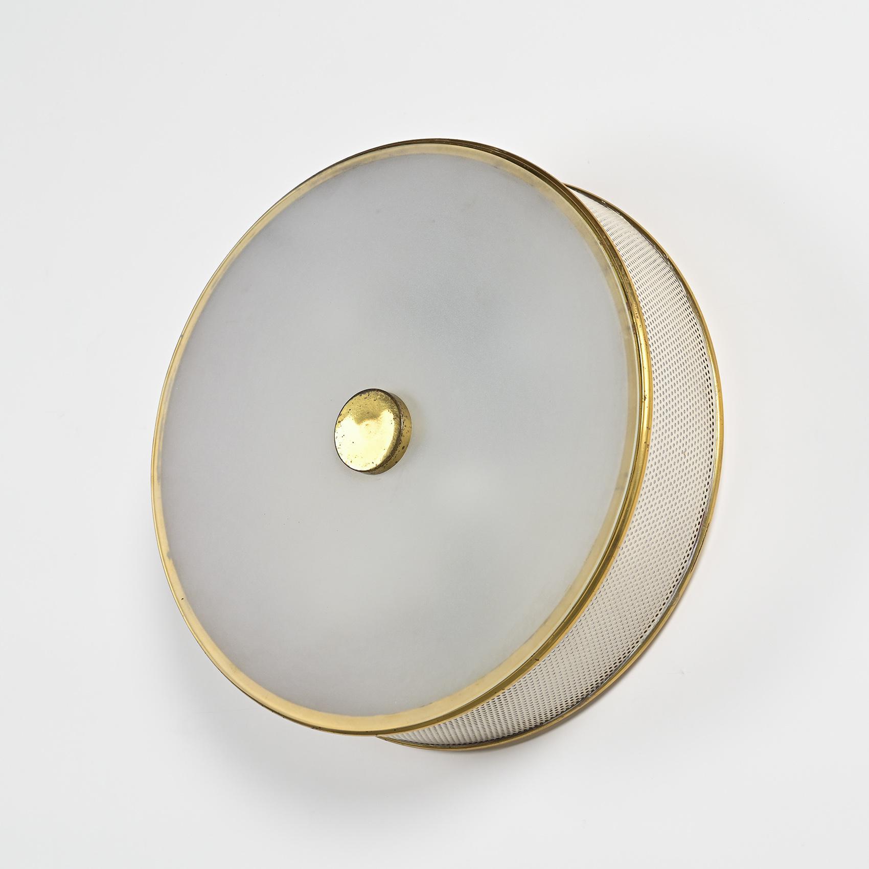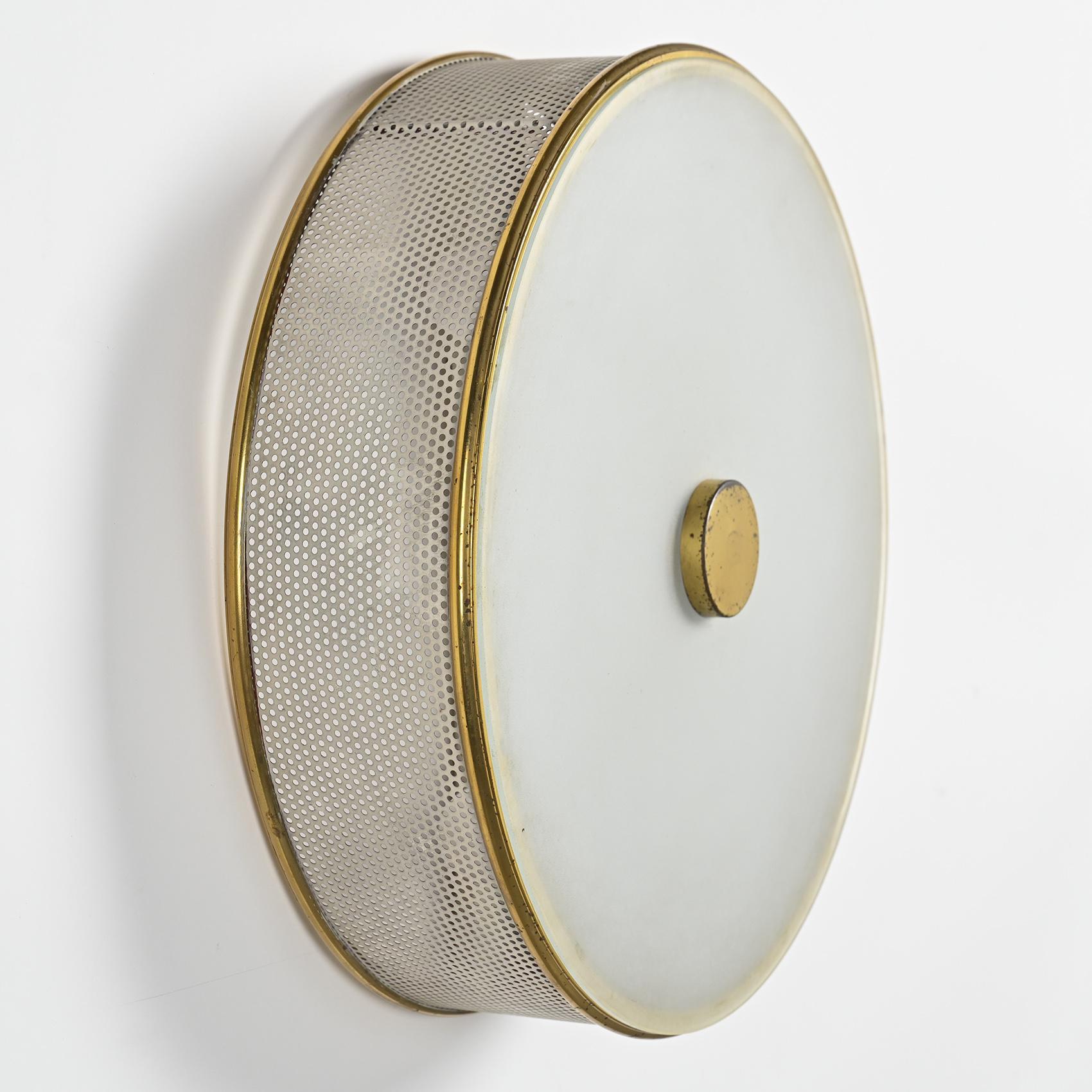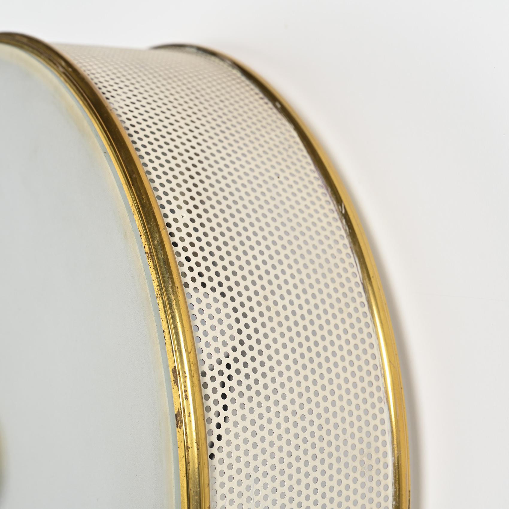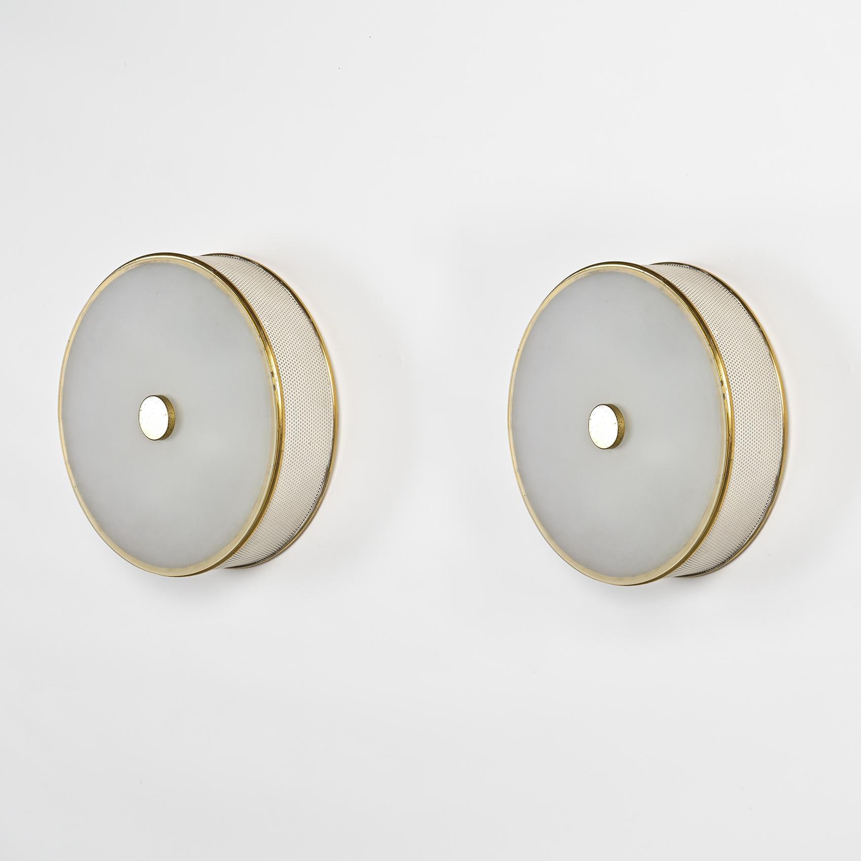 Chaque applique présente une structure en métal laqué crème à perforations régulières, cerclée de laiton doré. Le diffuseur en rhodoïd opalin diffuse une lumière douce et homogène, emblématique du savoir-faire de Lunel dans l'éclairage domestique des années 1950. Le bouton central en laiton poli vient ponctuer la composition, soulignant la rigueur géométrique et l'élégance discrète propres à la maison.