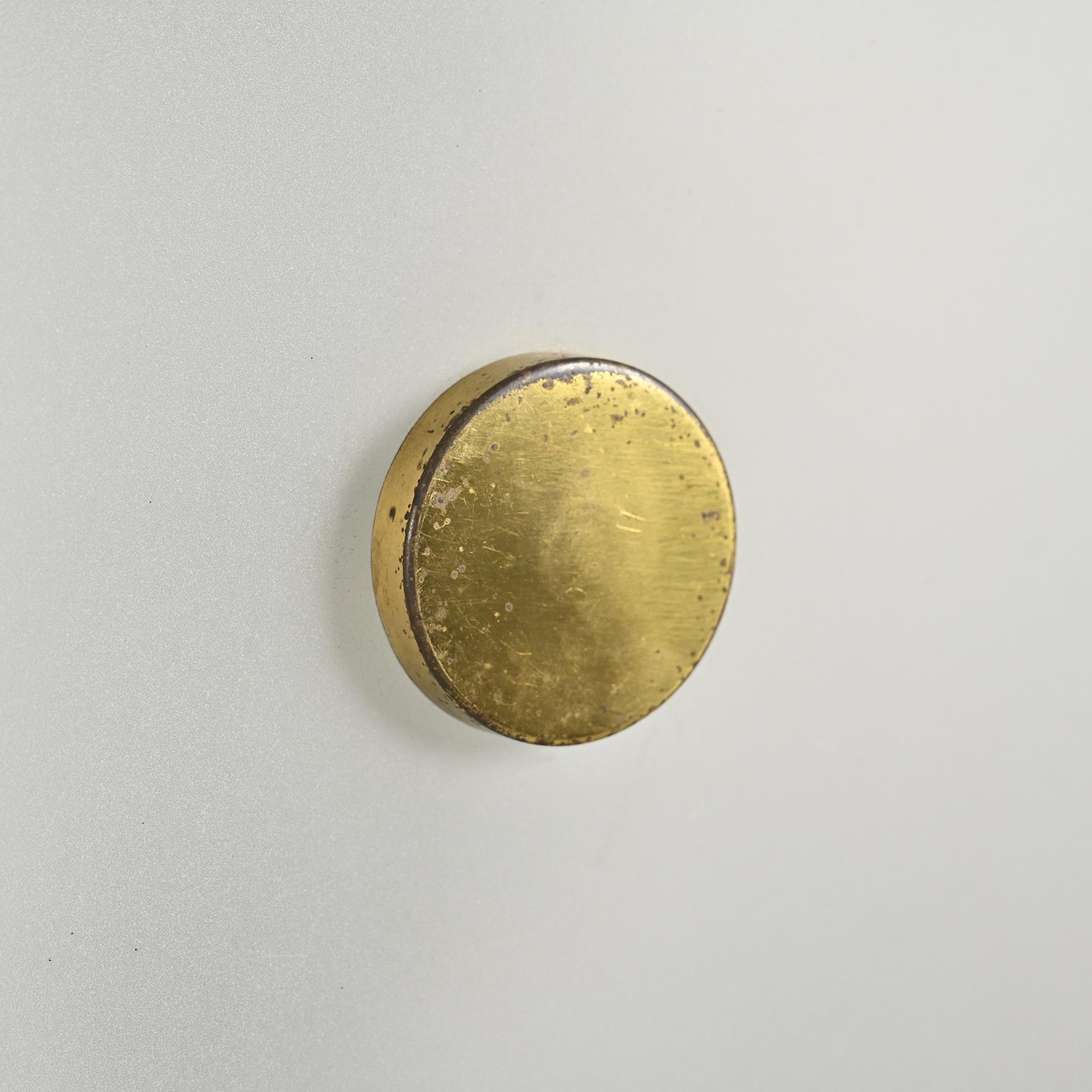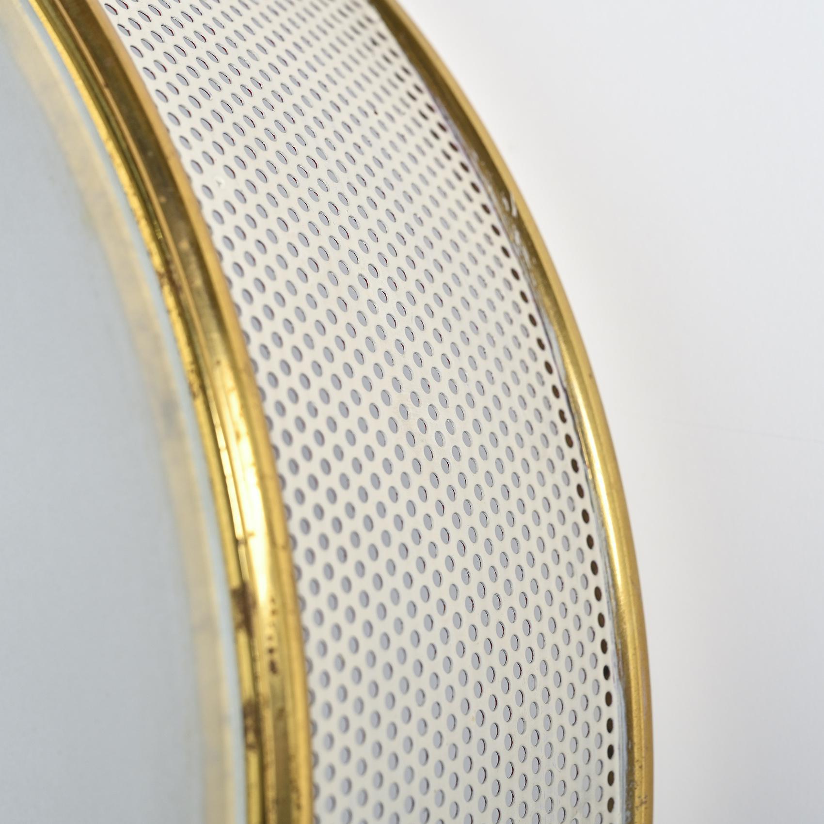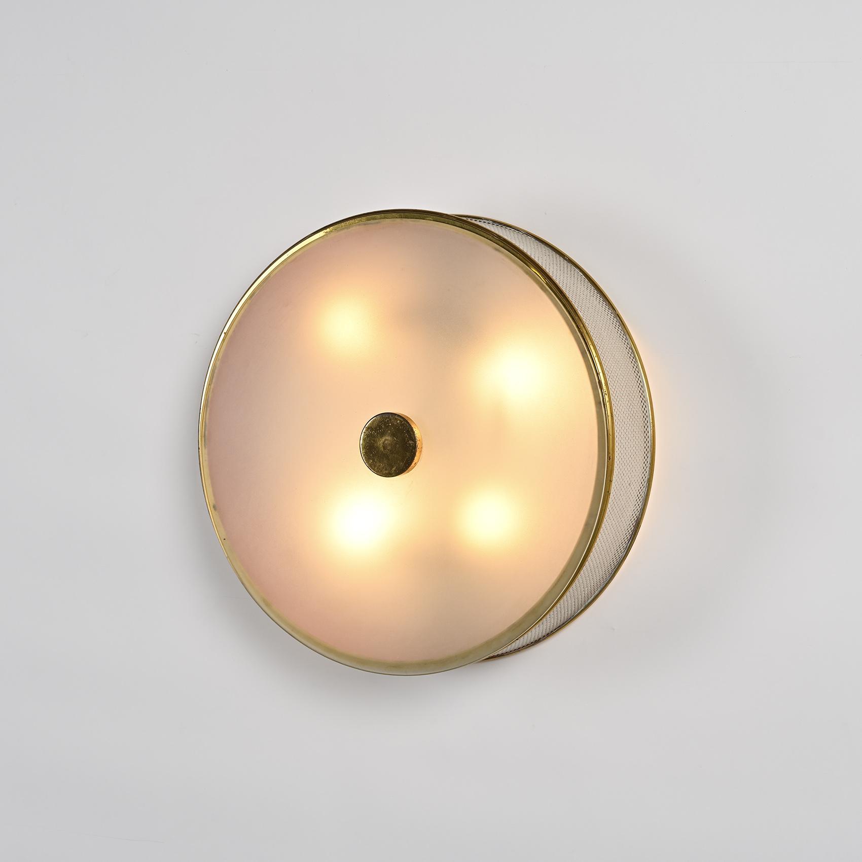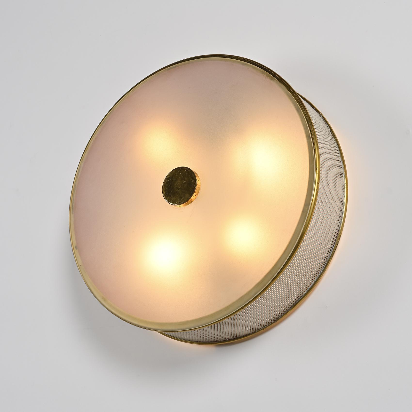 Chaque applique présente une structure en métal laqué crème à perforations régulières, cerclée de laiton doré. Le diffuseur en rhodoïd opalin diffuse une lumière douce et homogène, emblématique du savoir-faire de Lunel dans l'éclairage domestique des années 1950. Le bouton central en laiton poli vient ponctuer la composition, soulignant la rigueur géométrique et l'élégance discrète propres à la maison.