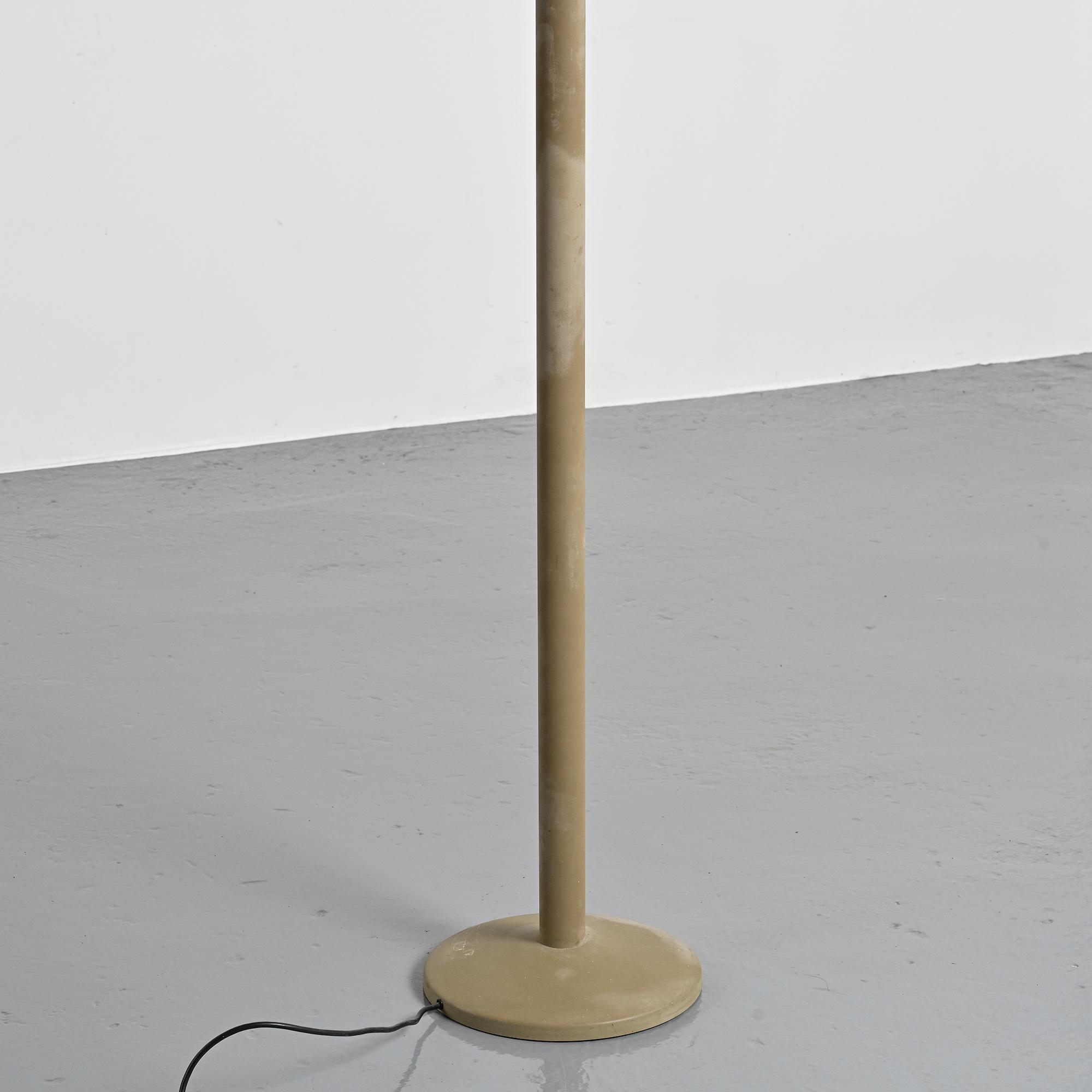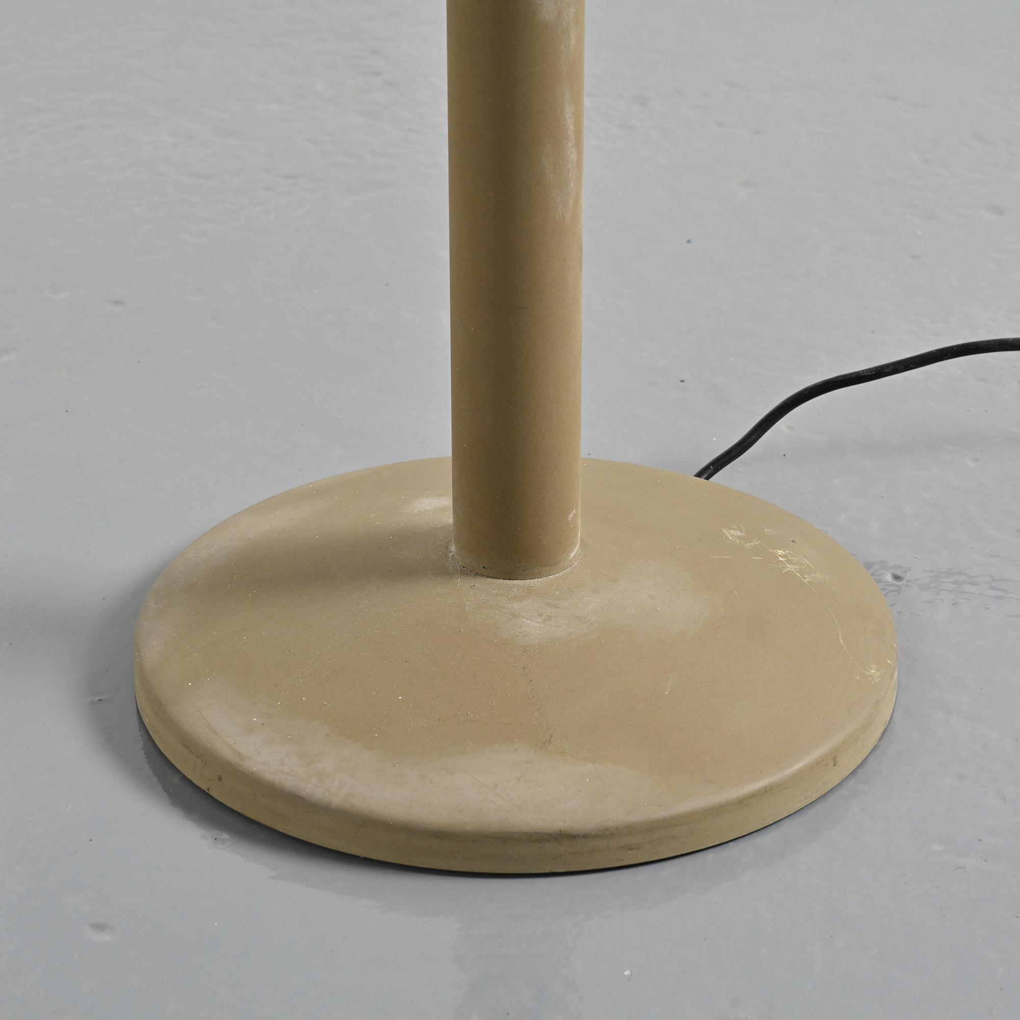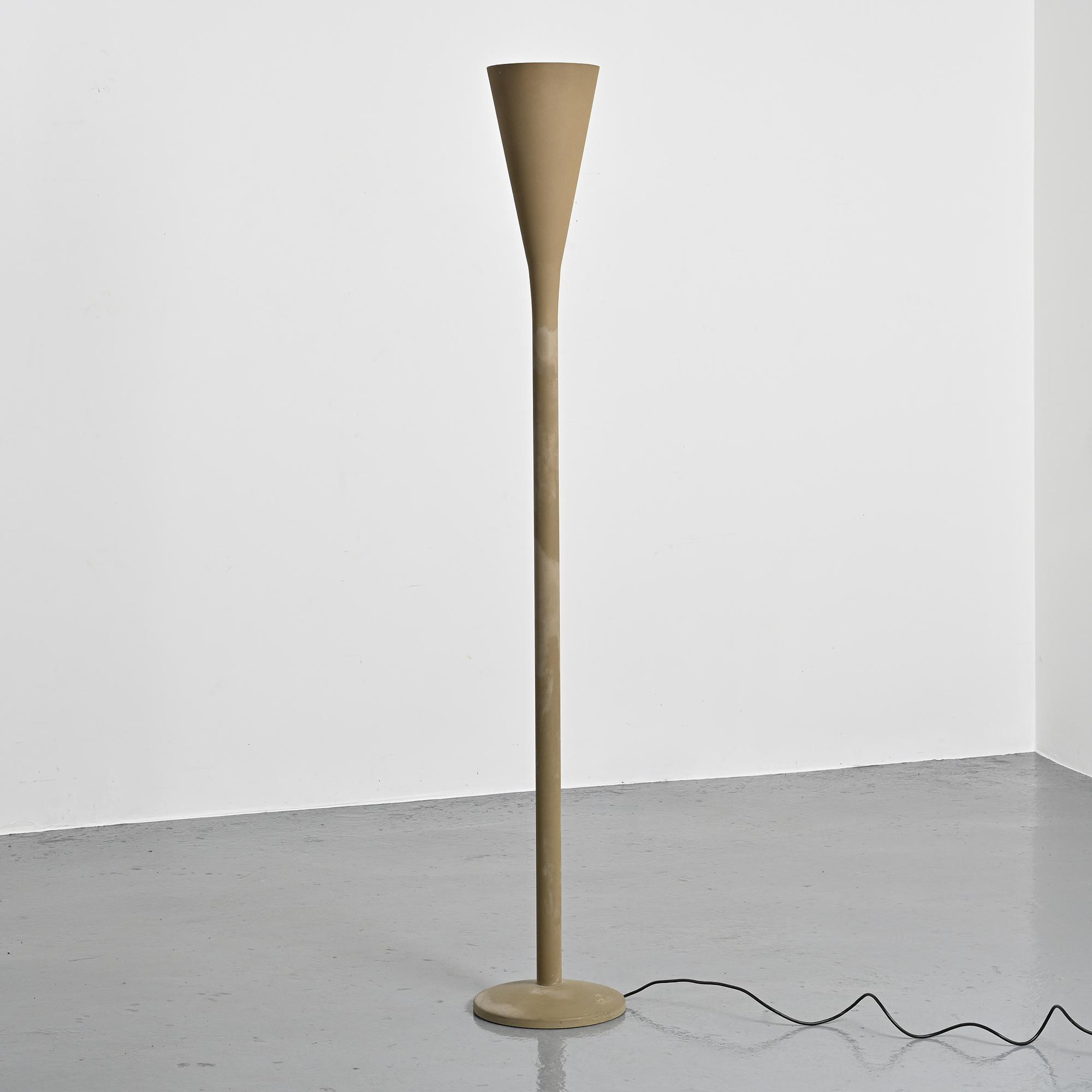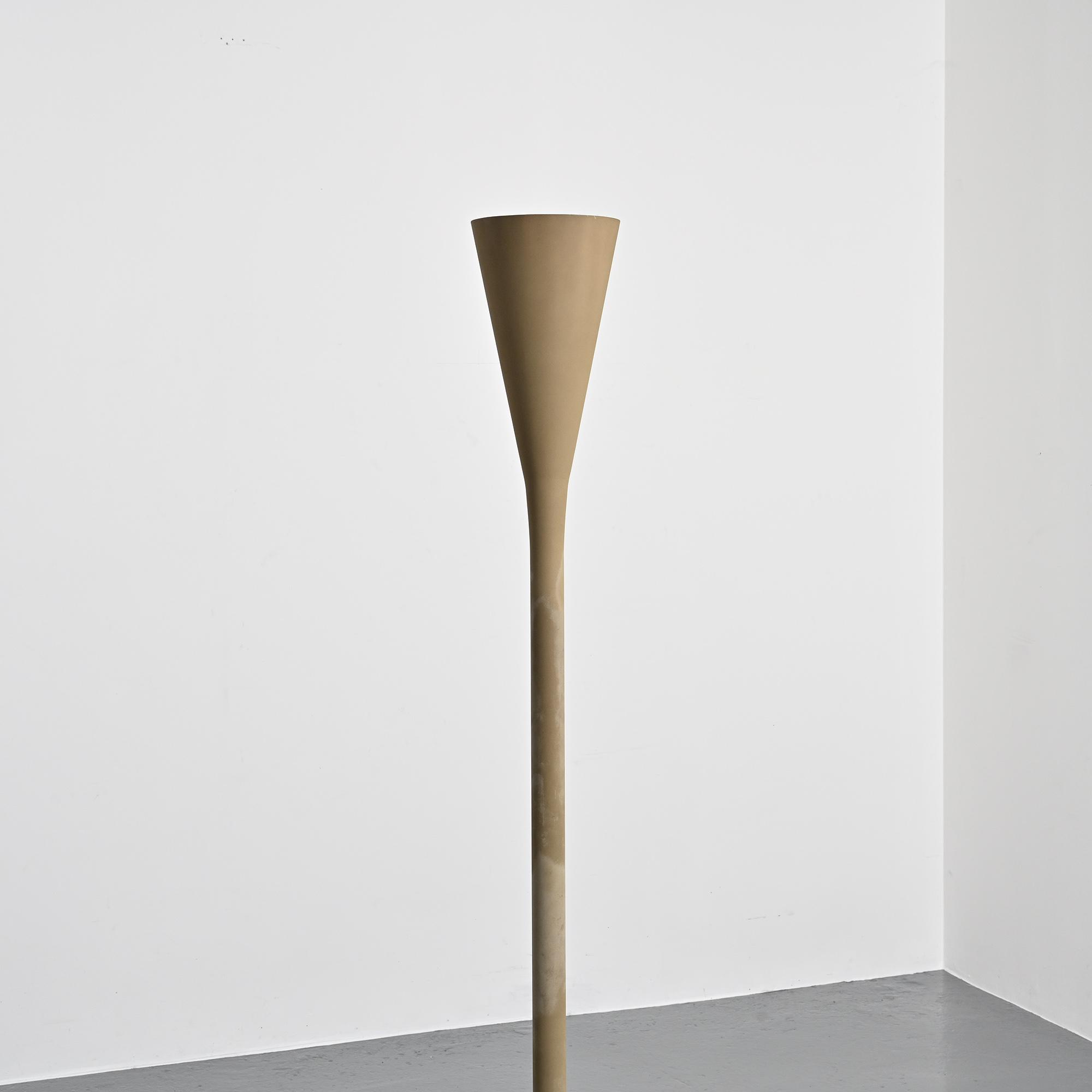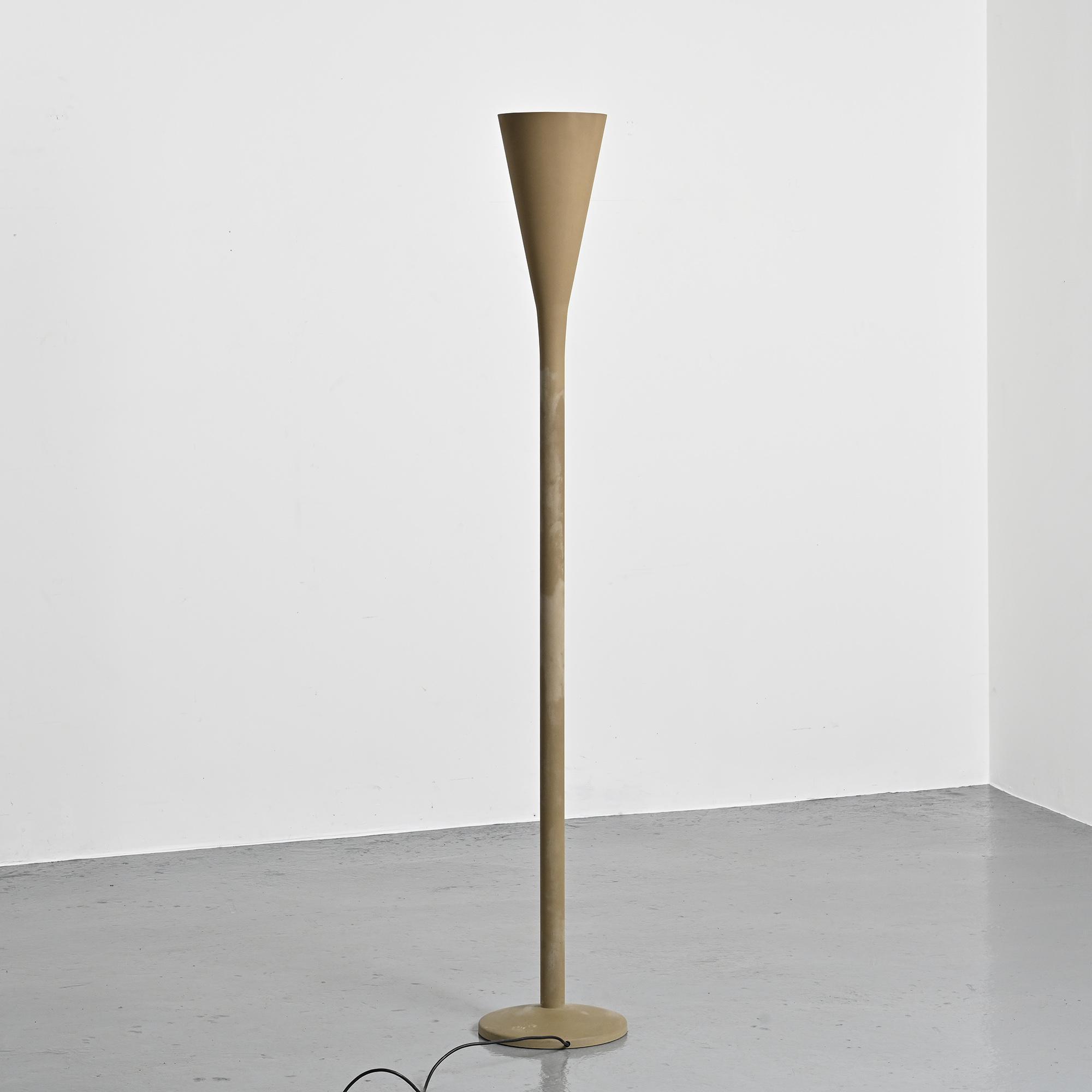 Structure moderniste composé d'une base accueillant un fut à réflecteur de forme conique, le tout en métal recouvert d'une peinture laquée époxy.