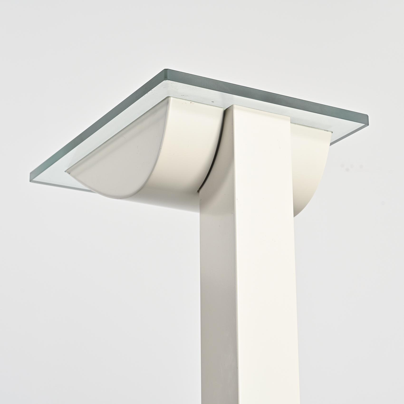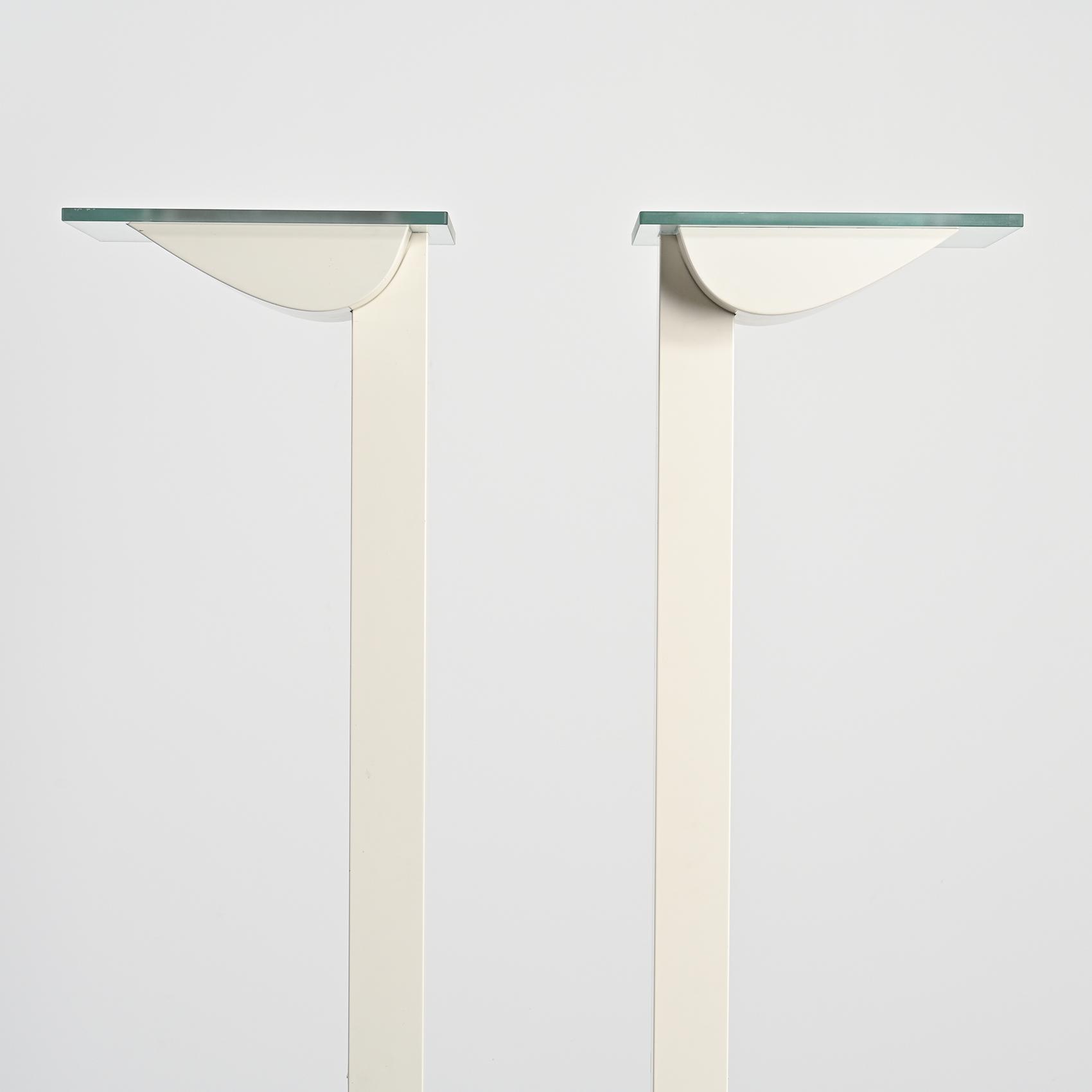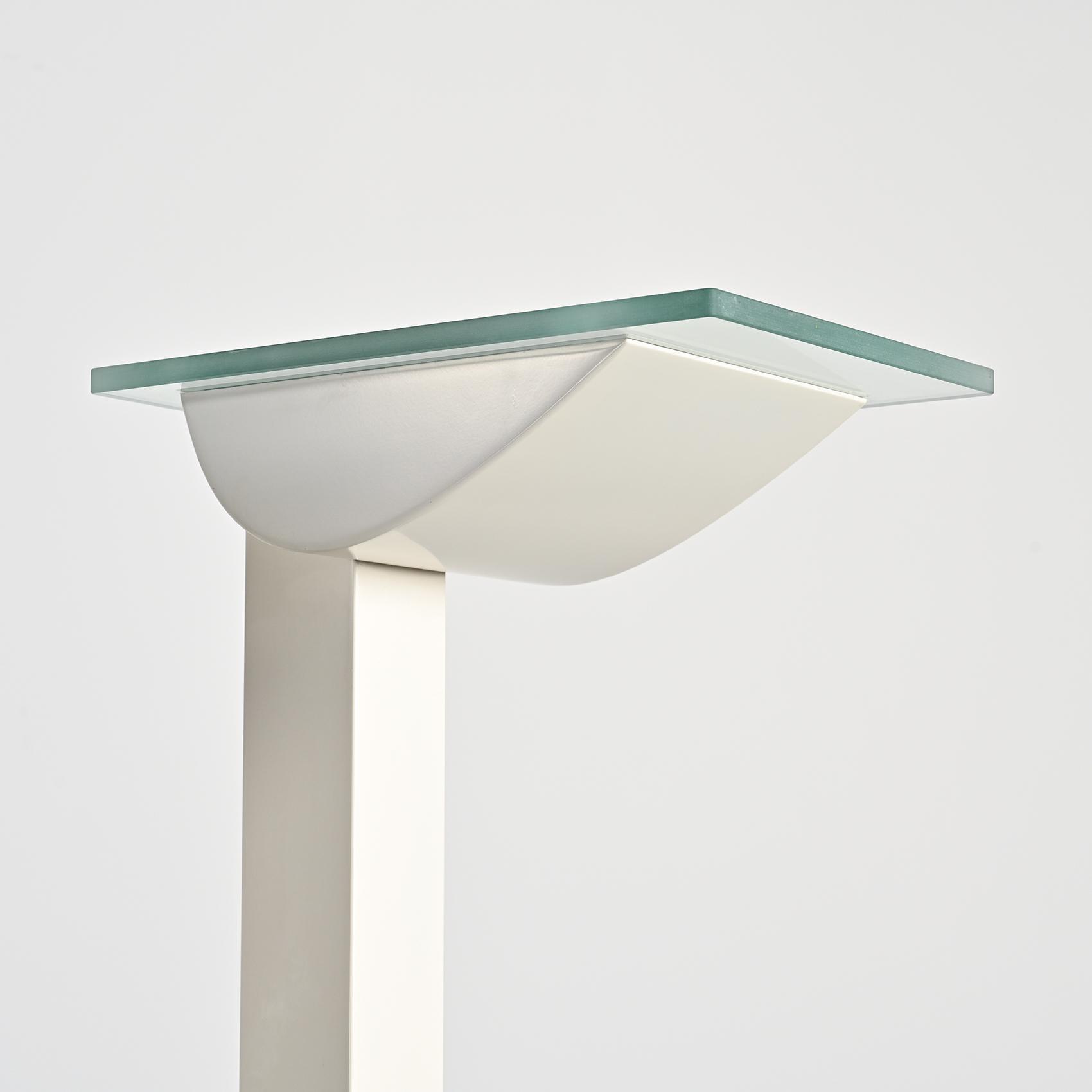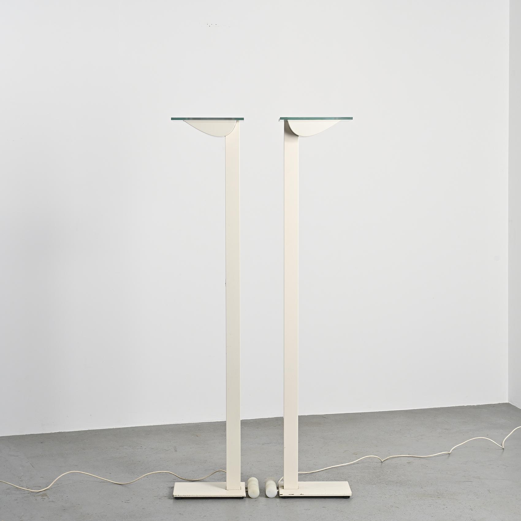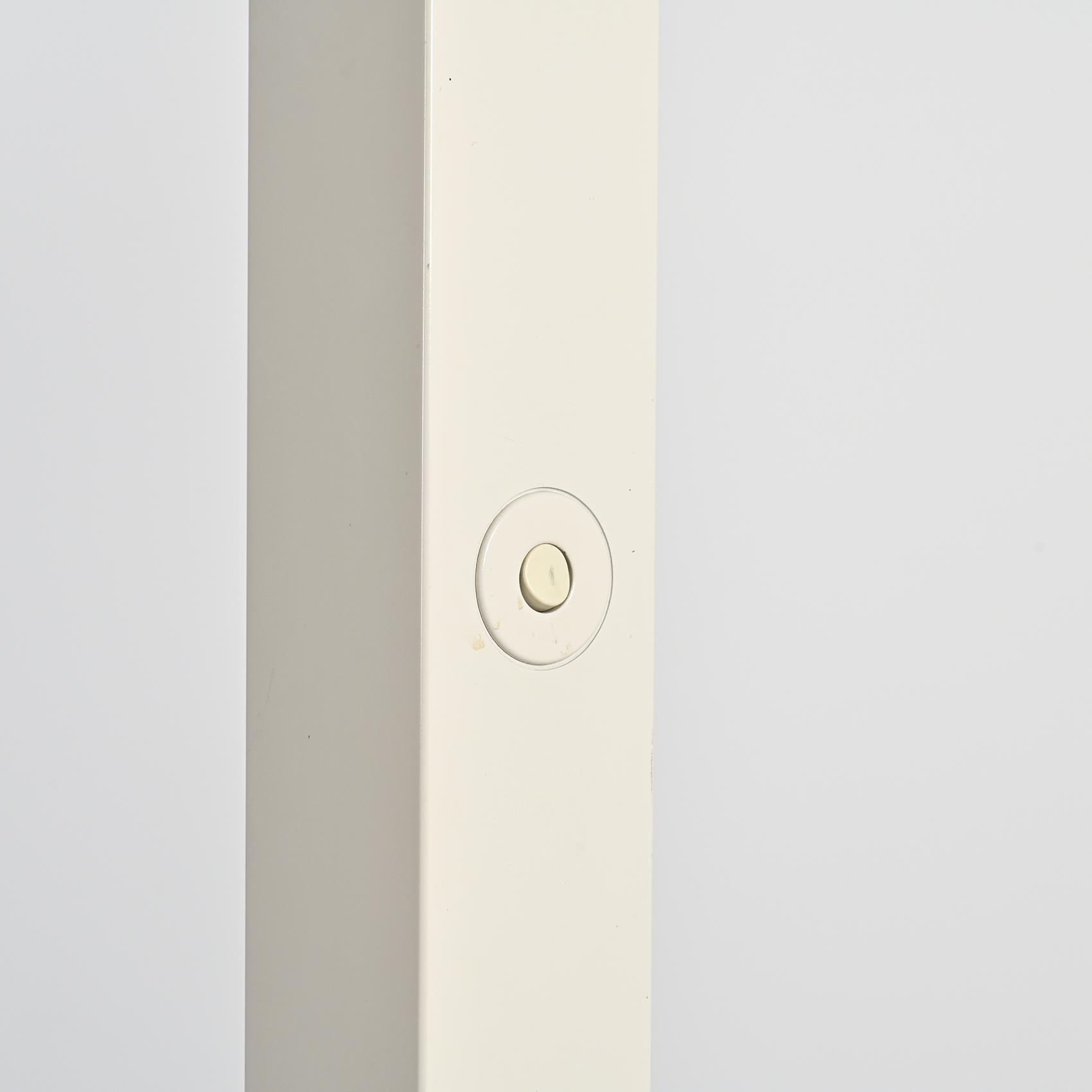 Réalisés en métal laqué blanc, ils s'élèvent sur une tige fine reposant sur une base rectangulaire montée sur trois roulettes, facilitant leur déplacement. Équipés d'une source halogène, ces lampadaires traduisent la recherche d'un équilibre entre rigueur industrielle et pureté formelle, signature du travail de Sottsass dans les années 1980.