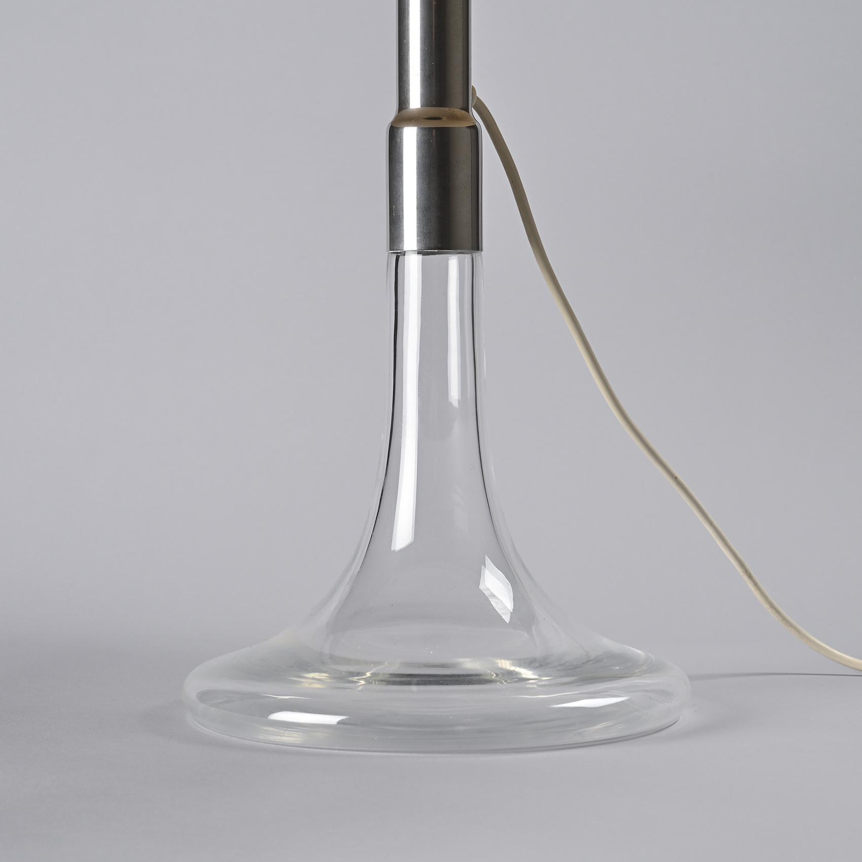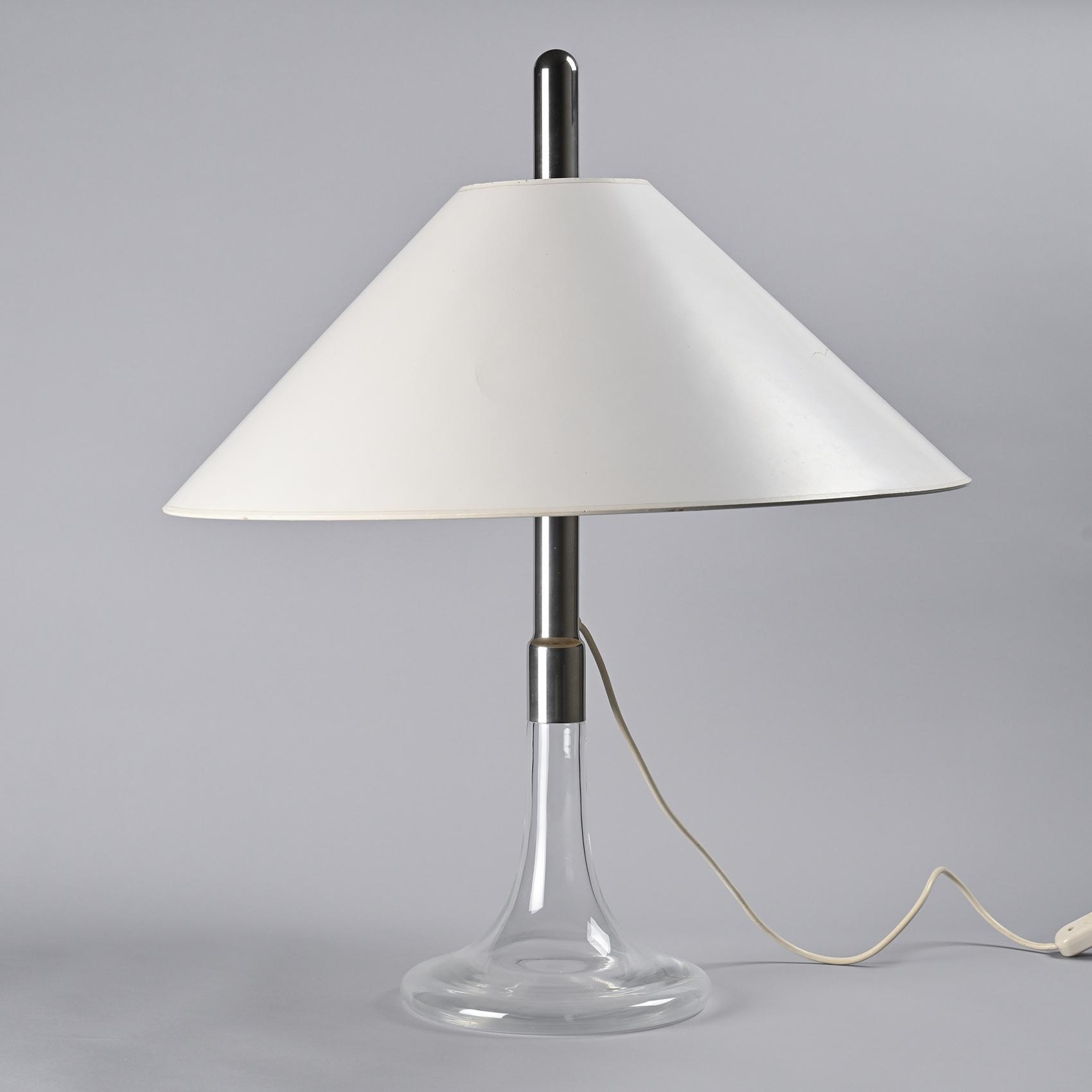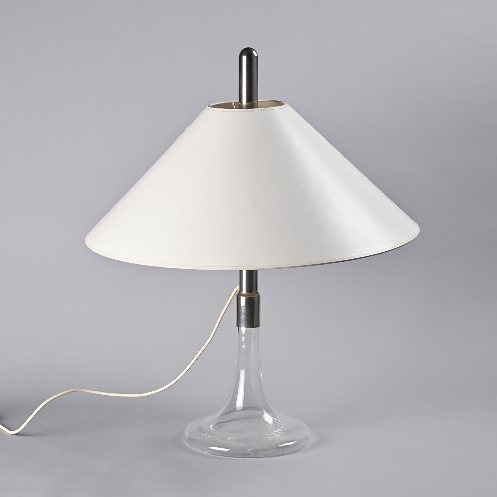 Le piètement en verre soufflé, élancé et transparent, soutient une tige métallique chromée sur laquelle repose un large abat-jour conique en métal laqué blanc. Le contraste entre la légèreté du verre et la présence affirmée de l'abat-jour confère à ce modèle une silhouette élégante et équilibrée. Cette pièce appartient aux premières créations d'Ingo Maurer, marquant le début d'un parcours où innovation technique et poésie formelle se rejoignent.