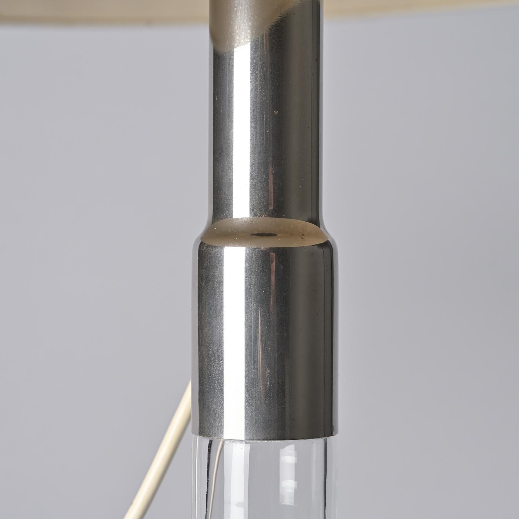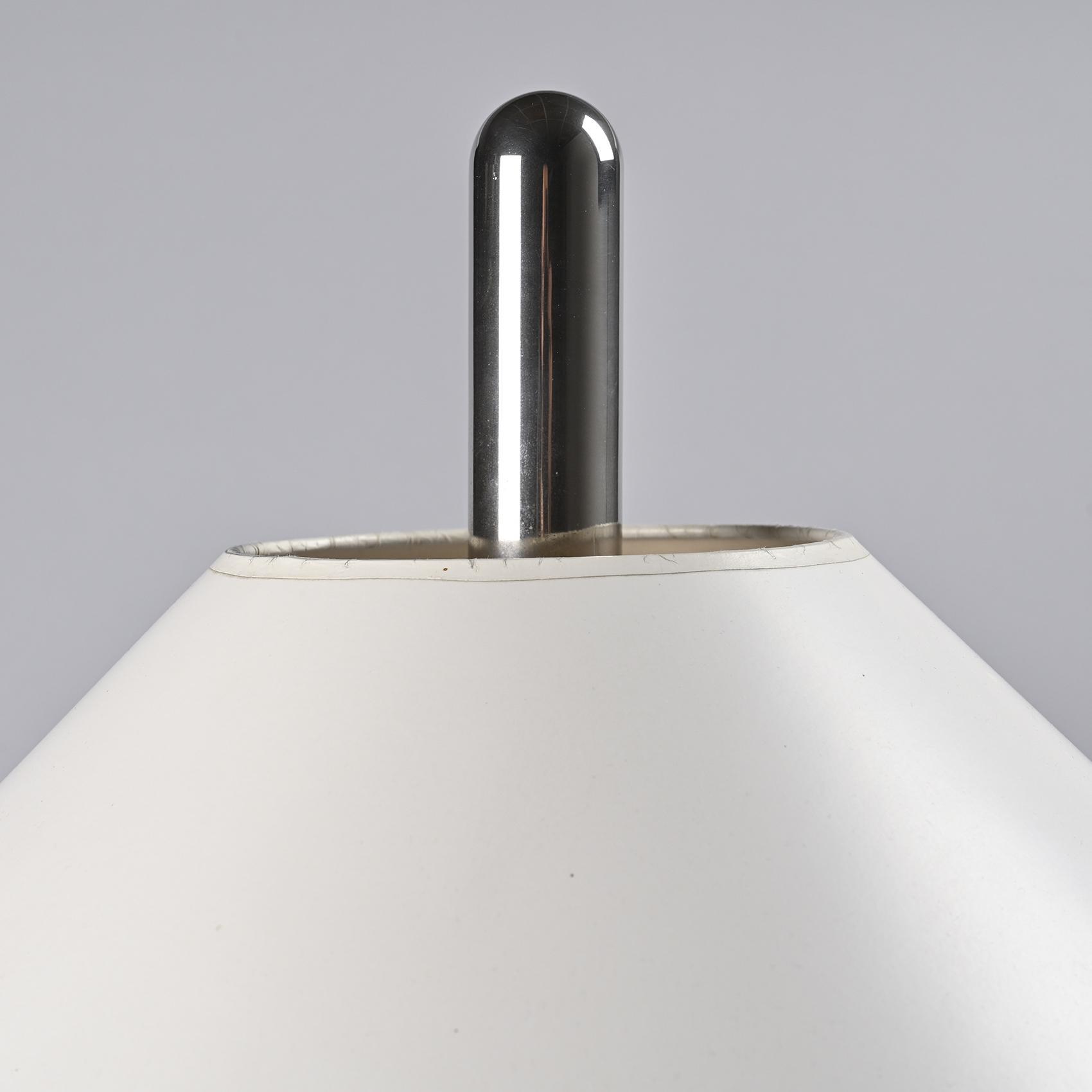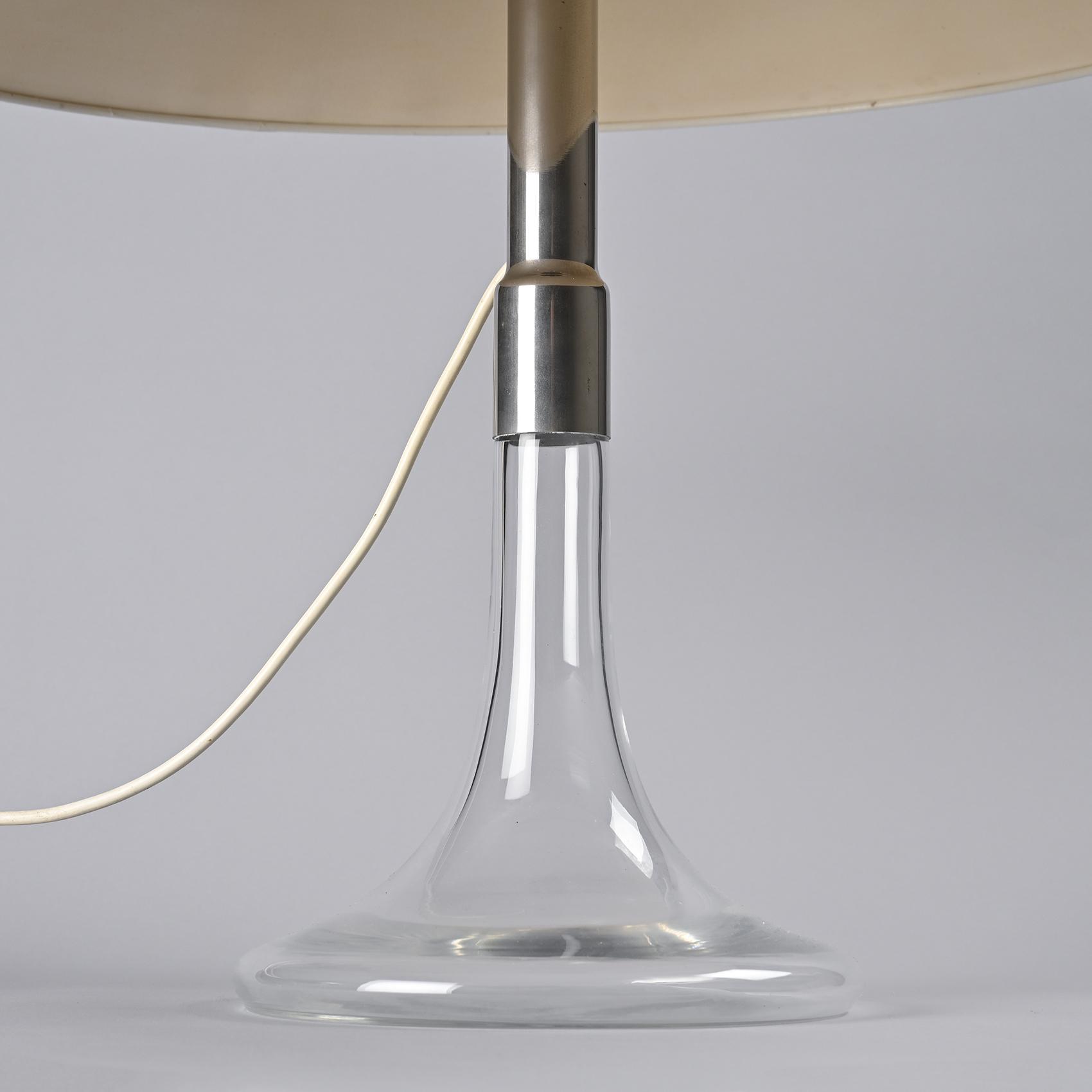 Le piètement en verre soufflé, élancé et transparent, soutient une tige métallique chromée sur laquelle repose un large abat-jour conique en métal laqué blanc. Le contraste entre la légèreté du verre et la présence affirmée de l'abat-jour confère à ce modèle une silhouette élégante et équilibrée. Cette pièce appartient aux premières créations d'Ingo Maurer, marquant le début d'un parcours où innovation technique et poésie formelle se rejoignent.