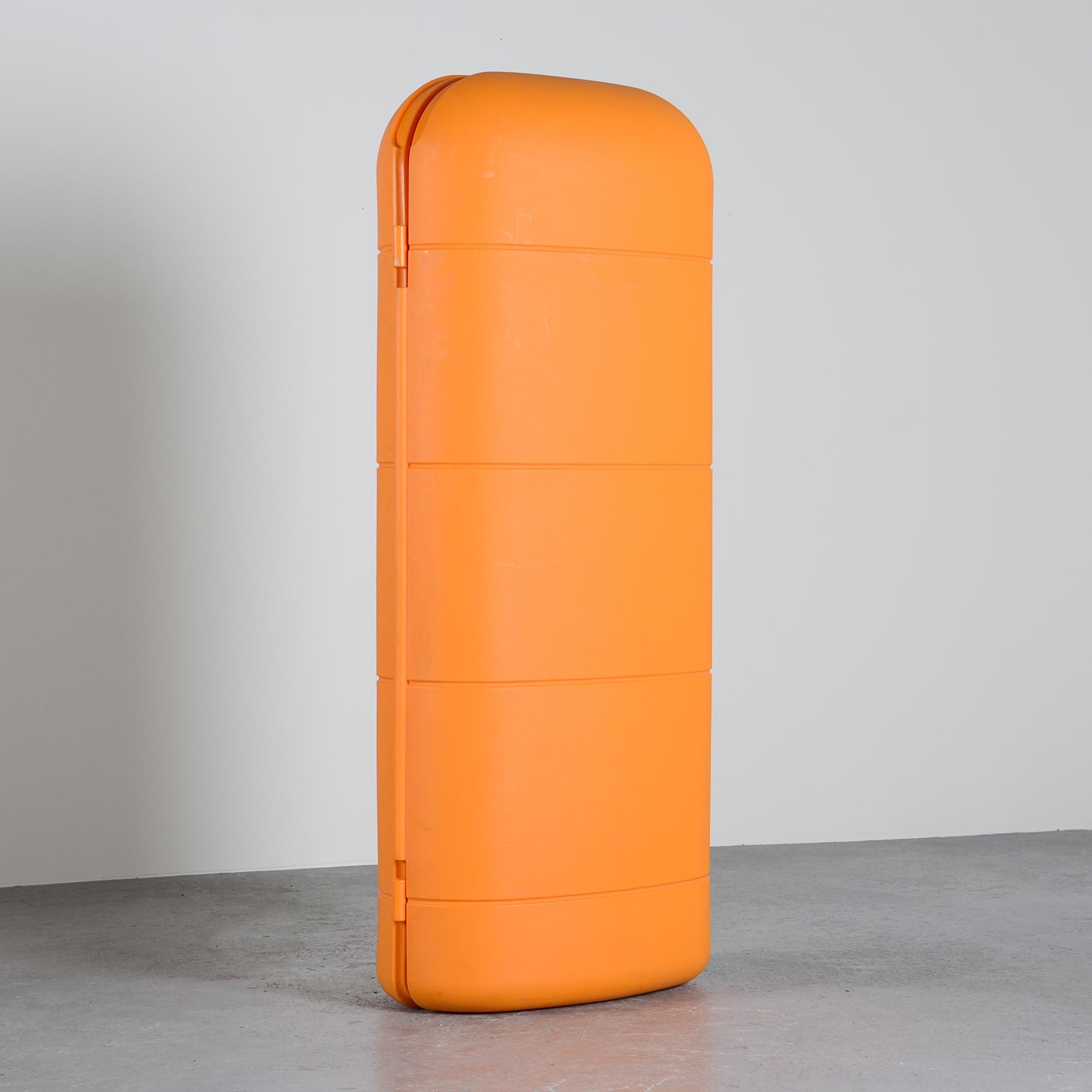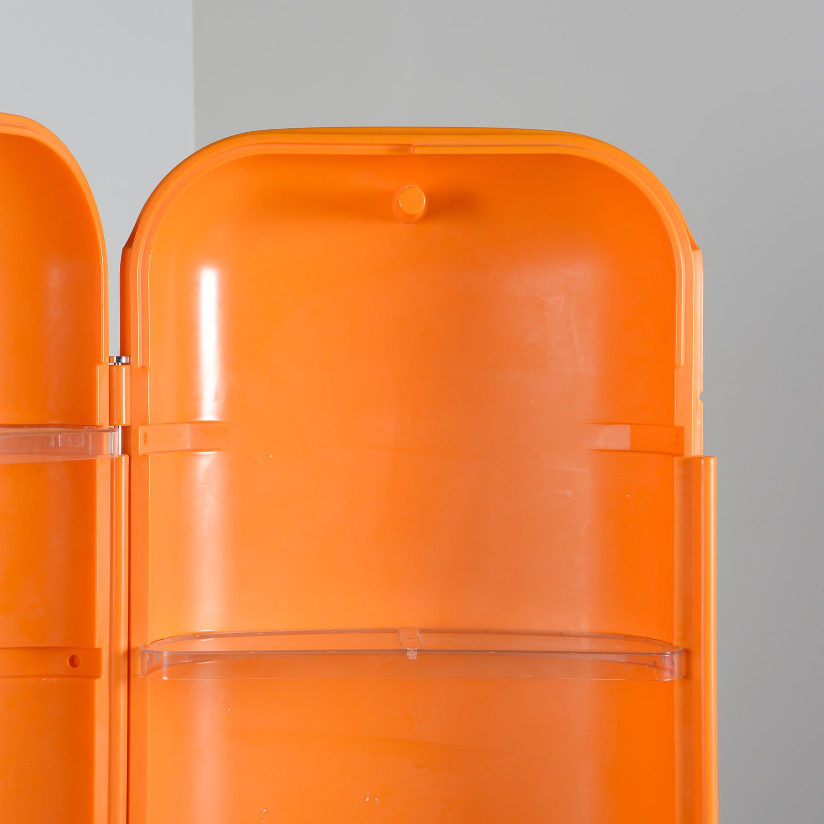 Its molded plastic capsule design, in a vibrant and distinctly pop orange, hides transparent plastic storage compartments.