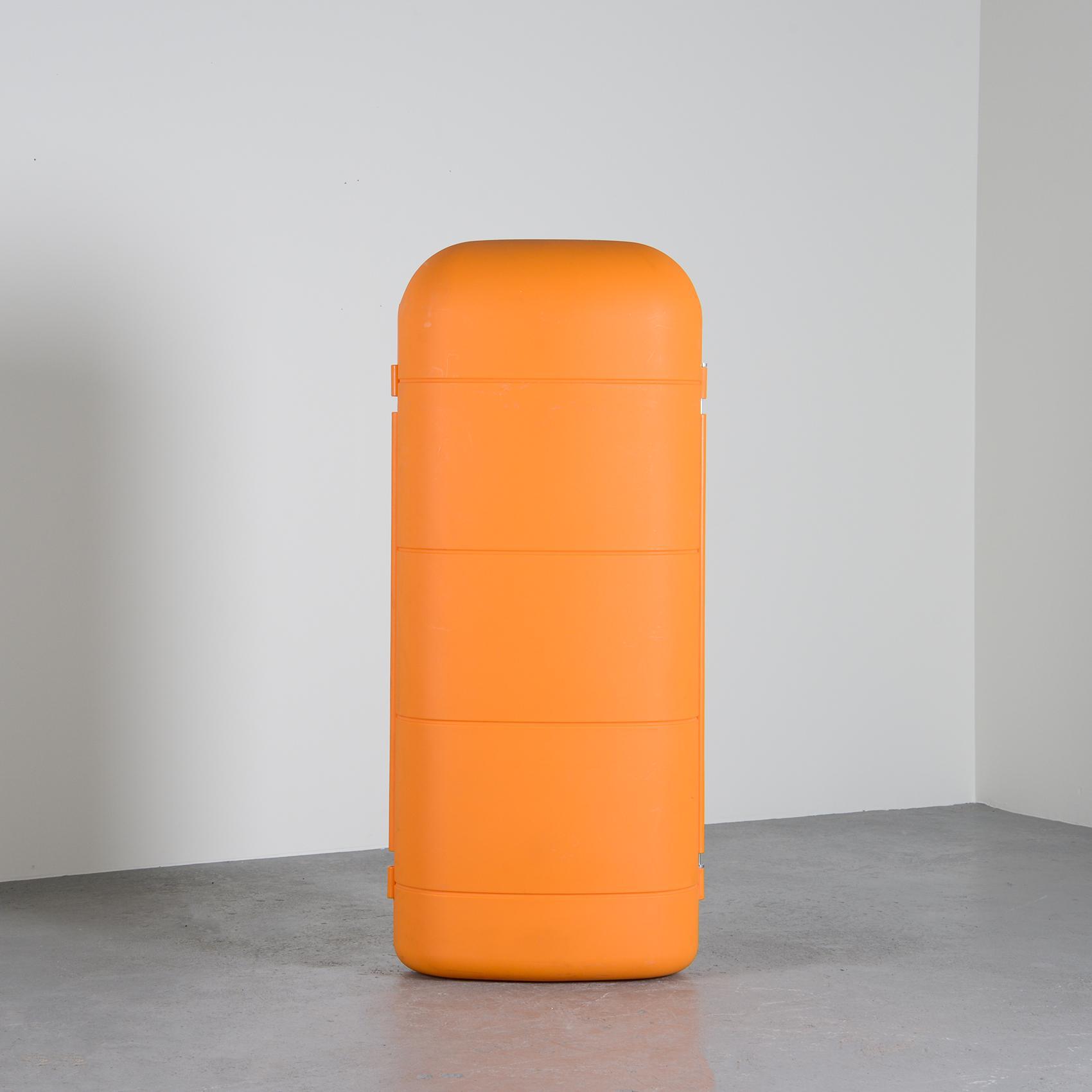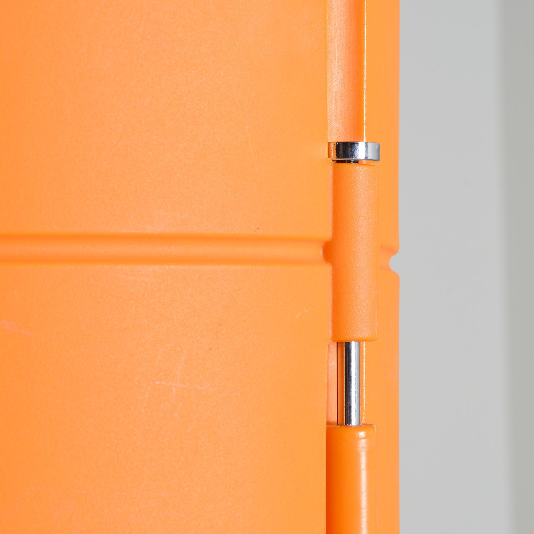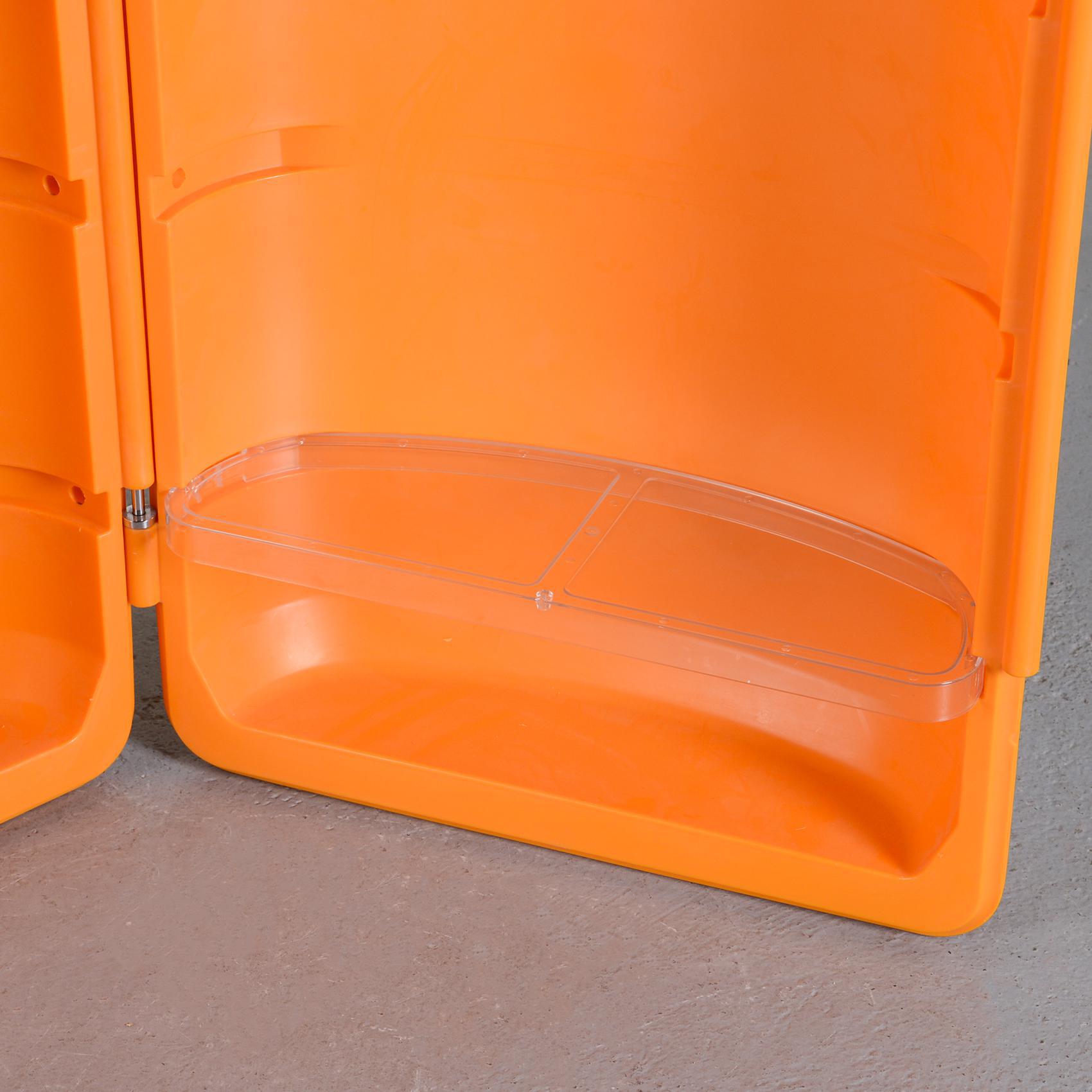 Son design en forme de capsule en plastique moulé, d'un vibrant orange résolument pop, cache des rangements intercalaires en plastique transparent.