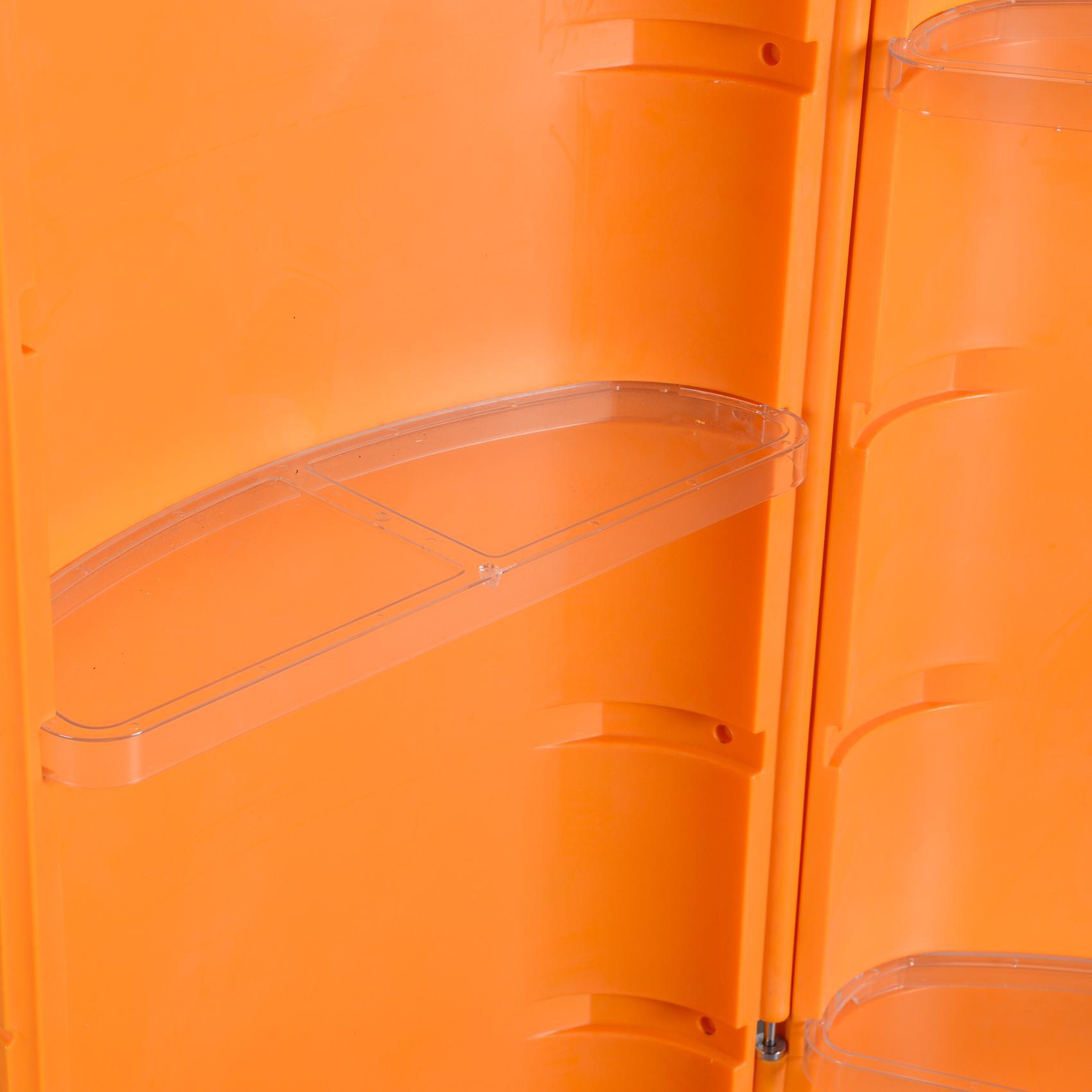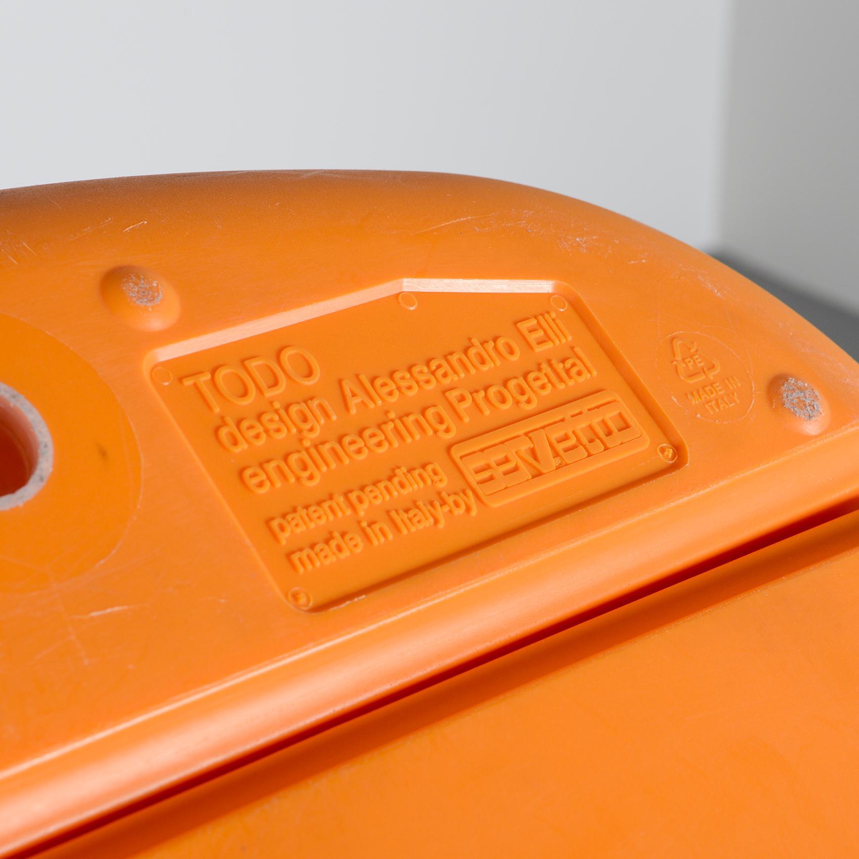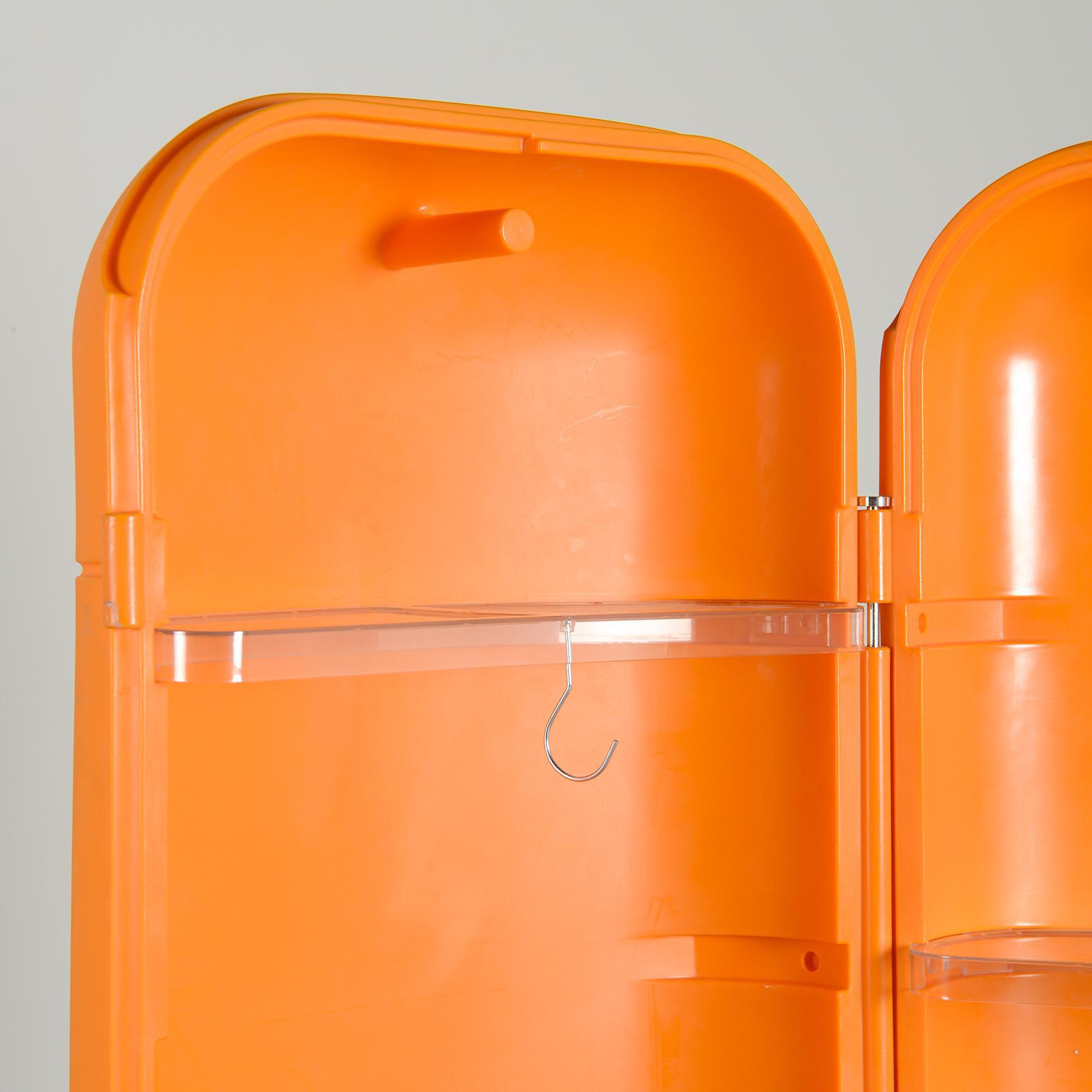 Son design en forme de capsule en plastique moulé, d'un vibrant orange résolument pop, cache des rangements intercalaires en plastique transparent.
