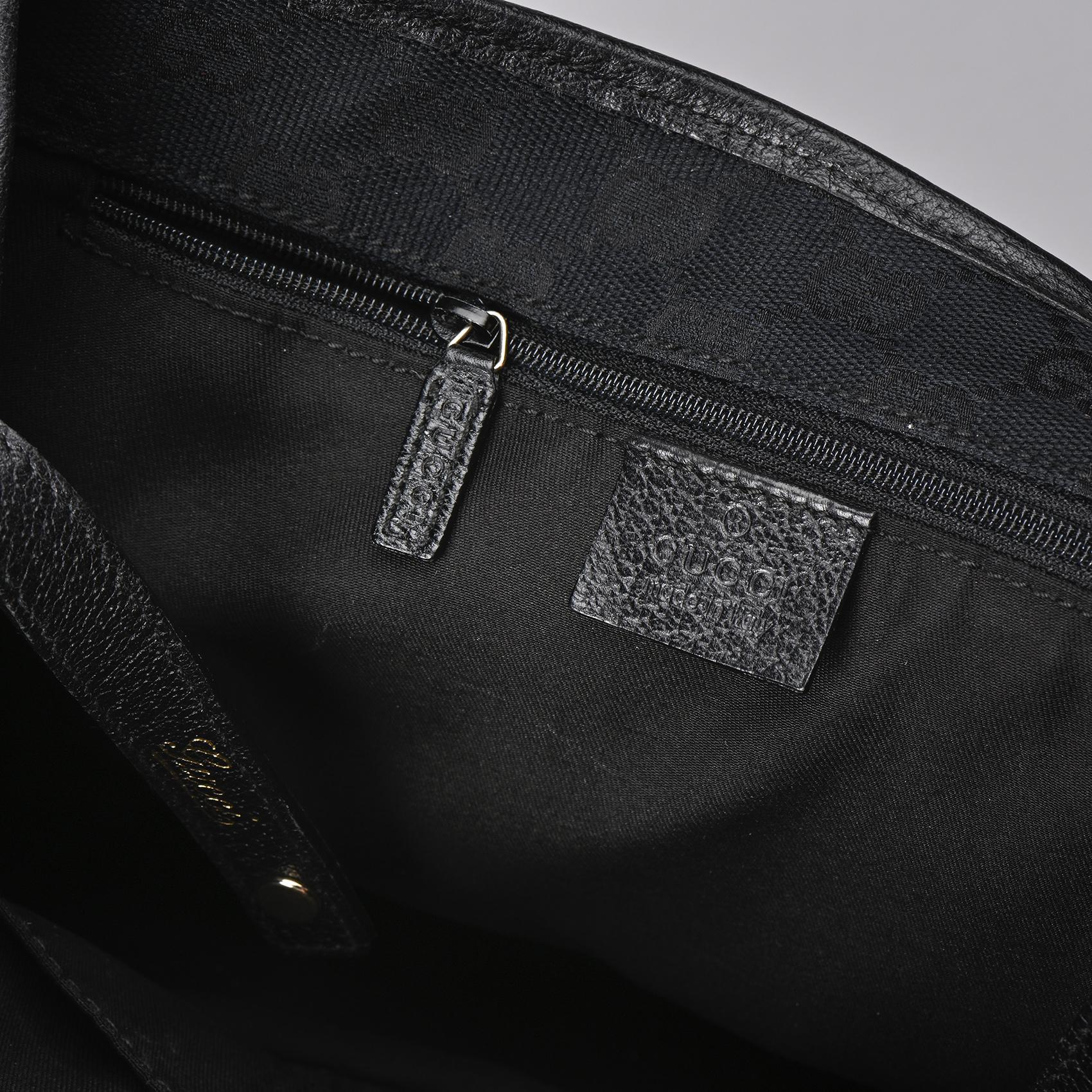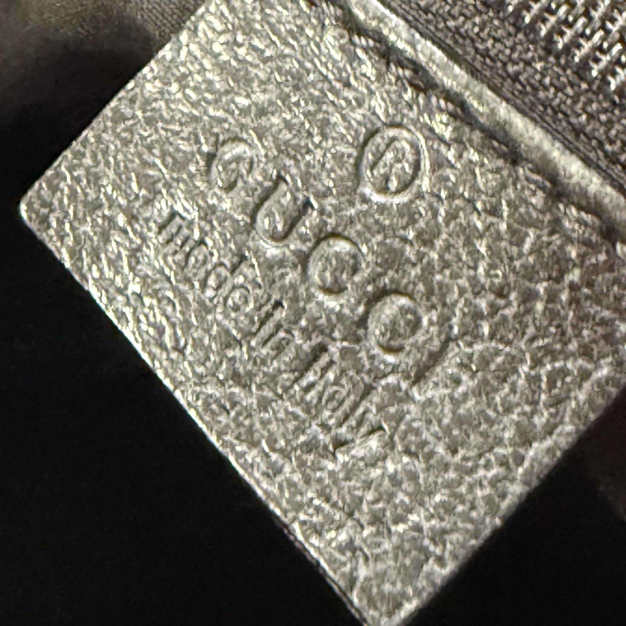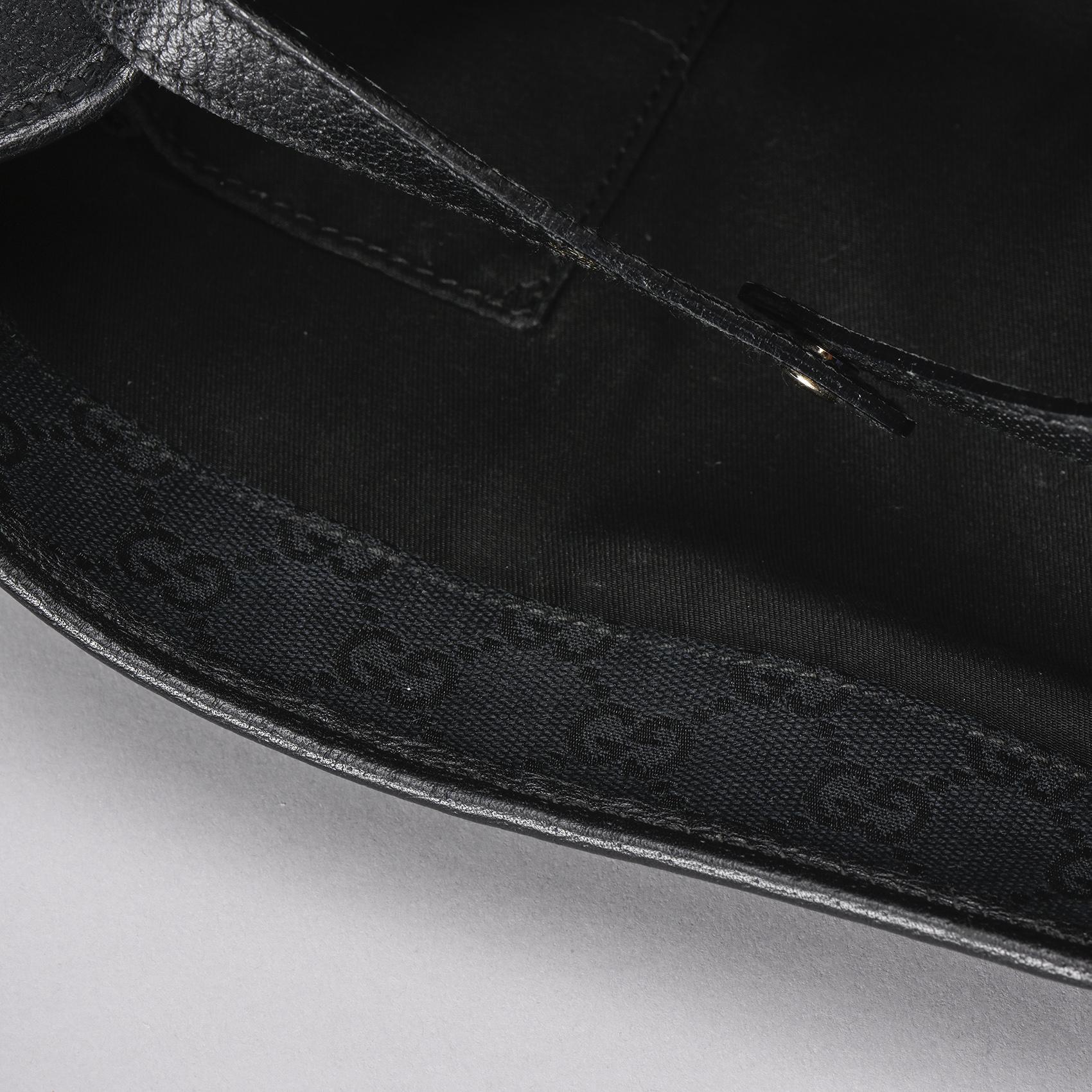 Modèle souple à double anse plate, rehaussé de finitions métalliques dorées. Il se ferme par une patte centrale en cuir à bouton-pression. L'intérieur comprend une poche zippée et une doublure en toile noire à motif GG ton sur ton.