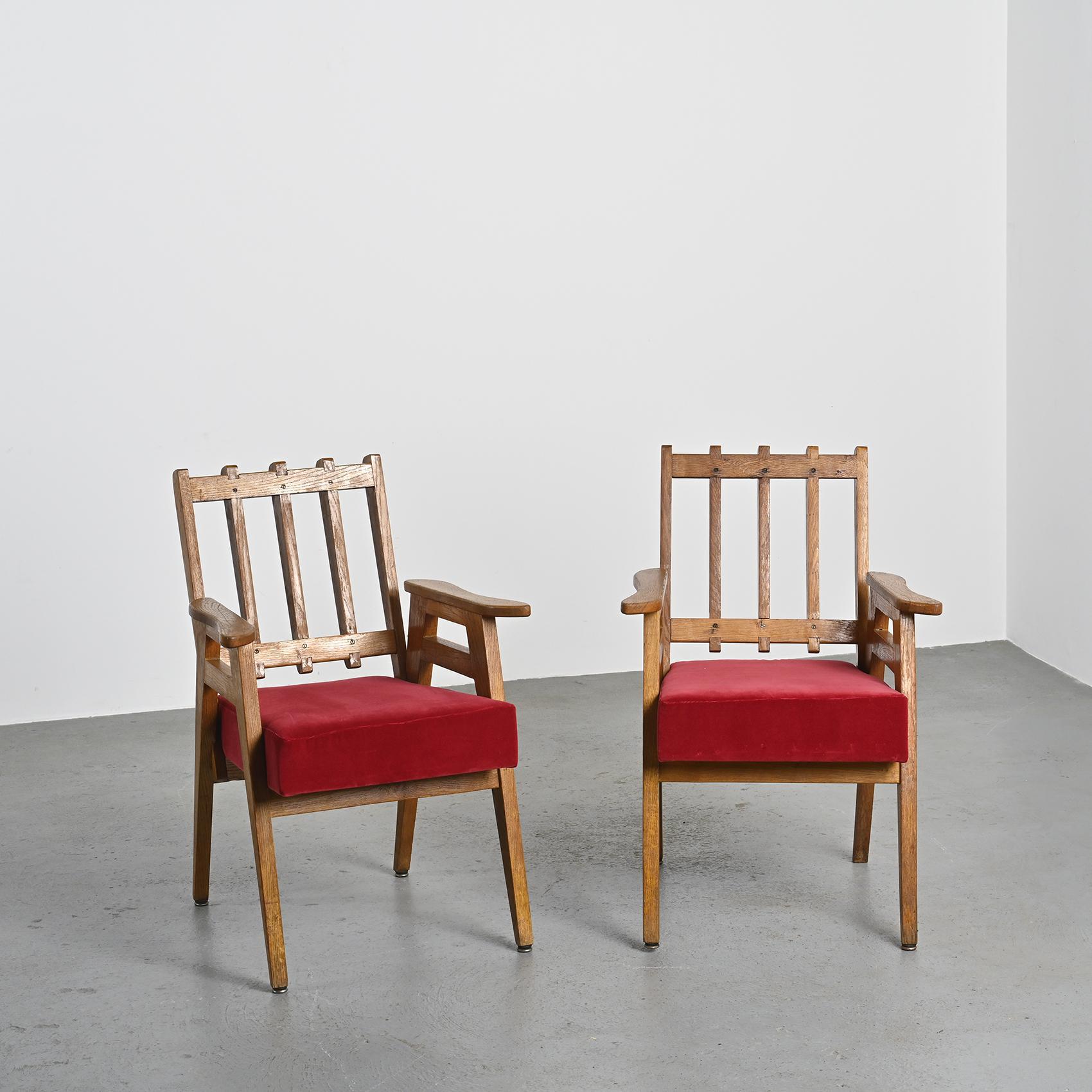 Paire de fauteuils en bois massif dessinés par Henry Jacques Le Même pour l'aménagement d'un chalet à Megève vers 1950. Leur structure à montants ajourés, accotoirs plats et piétement incliné illustre la recherche d'un mobilier à la fois fonctionnel, solide et harmonieux, caractéristique du modernisme alpin développé par l'architecte.