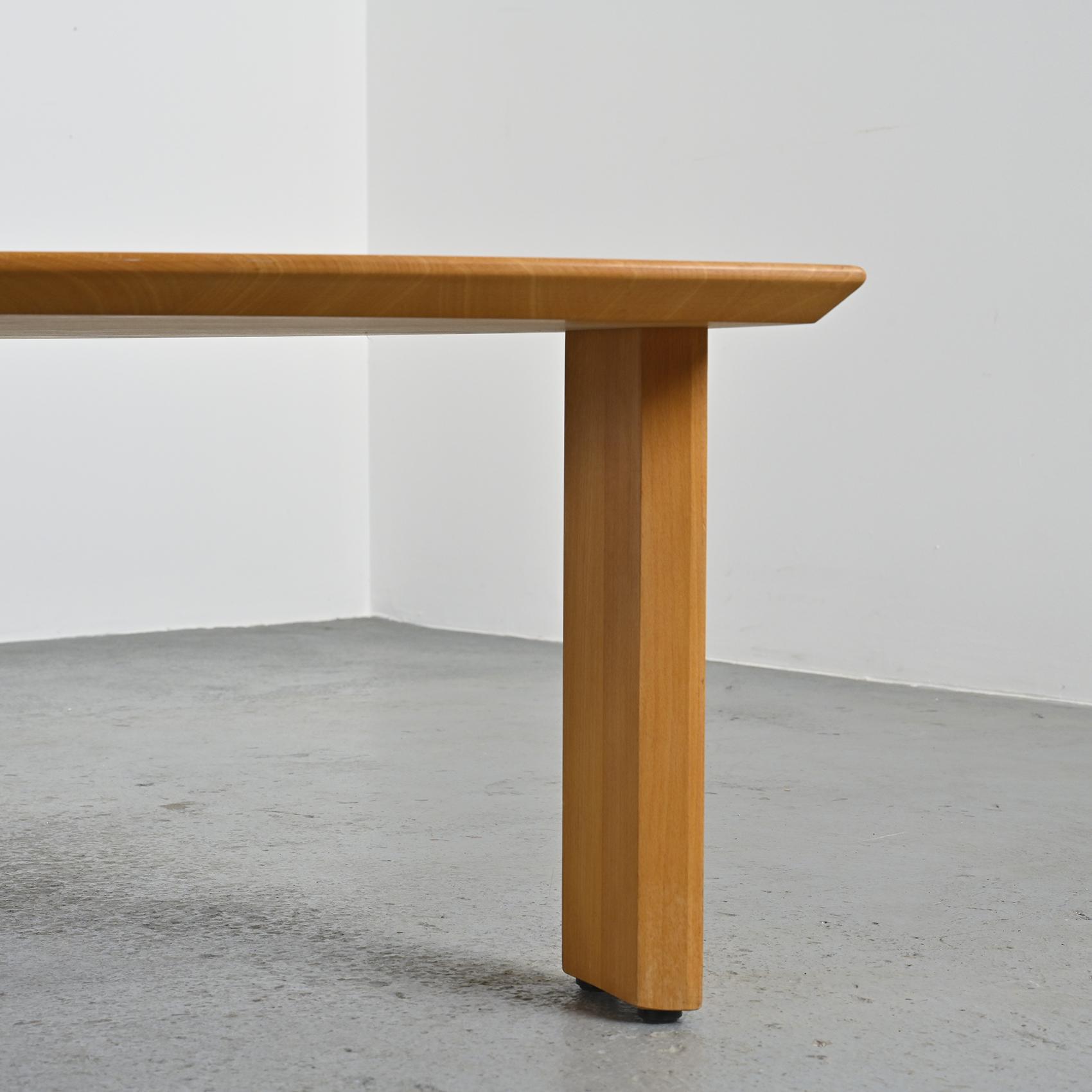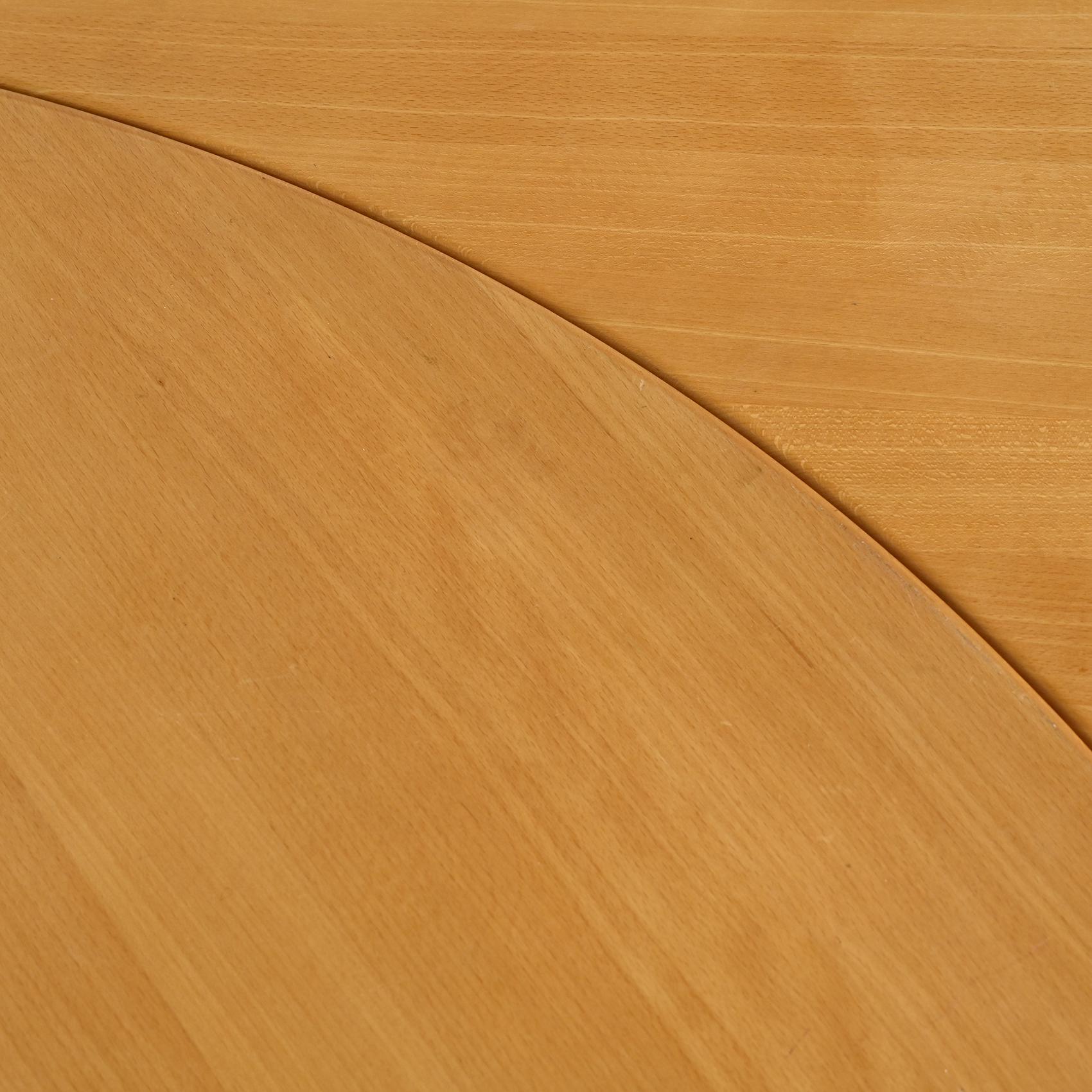 Chaque élément, tripode, adopte une forme de pétale en orme massif, aux courbes généreuses et douces. Les deux modules peuvent être utilisés séparément ou s'assembler pour former une table unique, offrant ainsi une grande flexibilité d'usage. Le veinage chaleureux de l'orme et la simplicité traduisent l'esprit du mobilier français des années 1970.