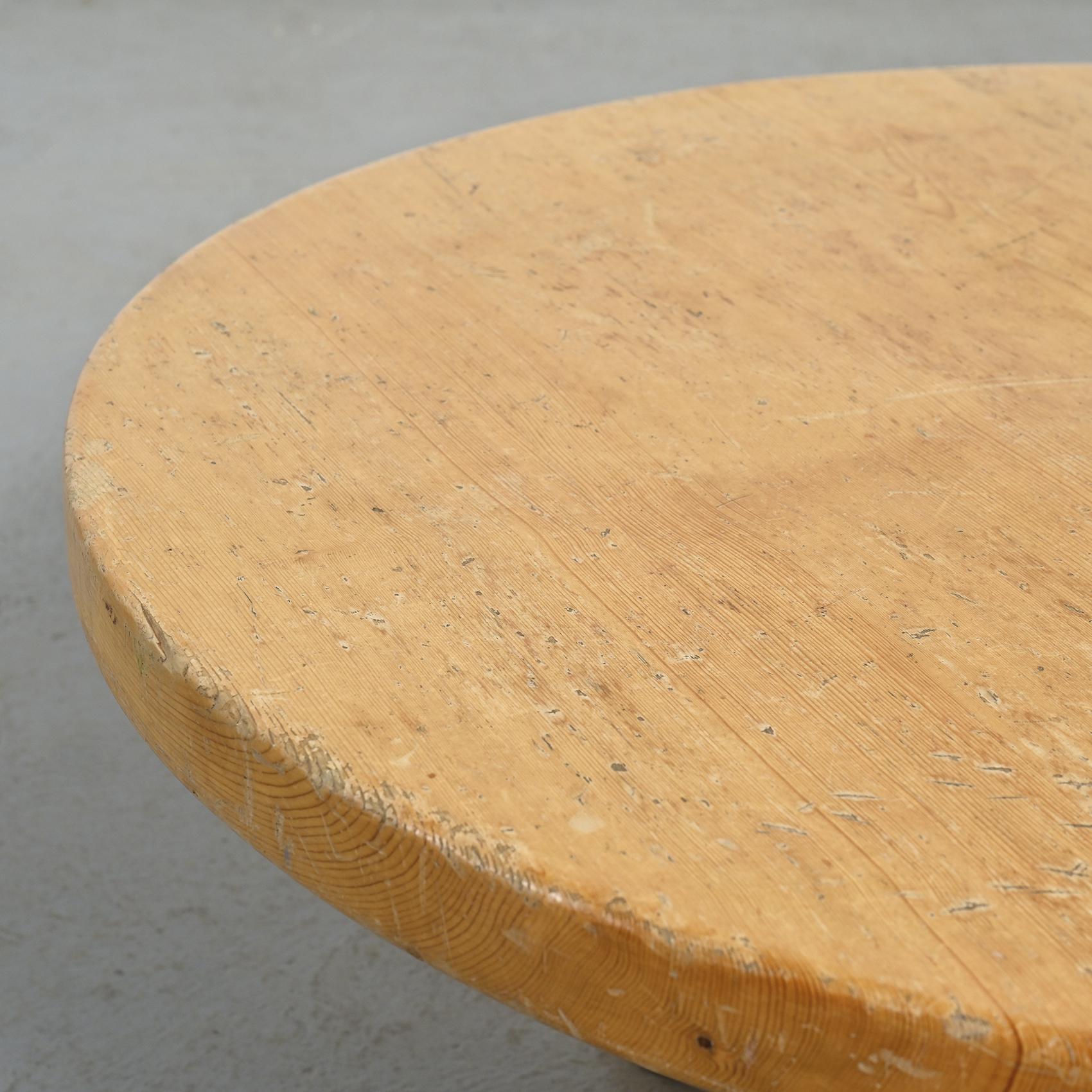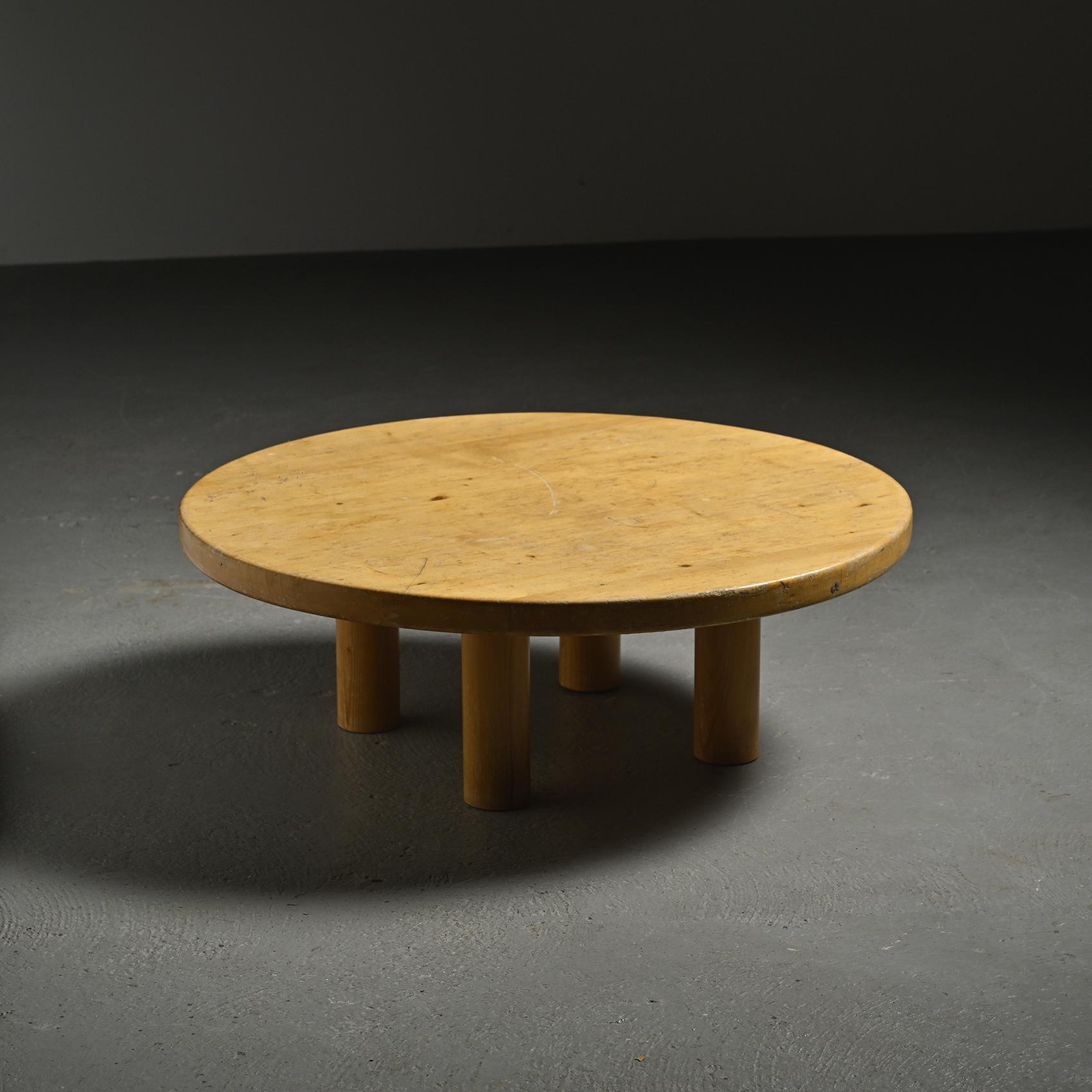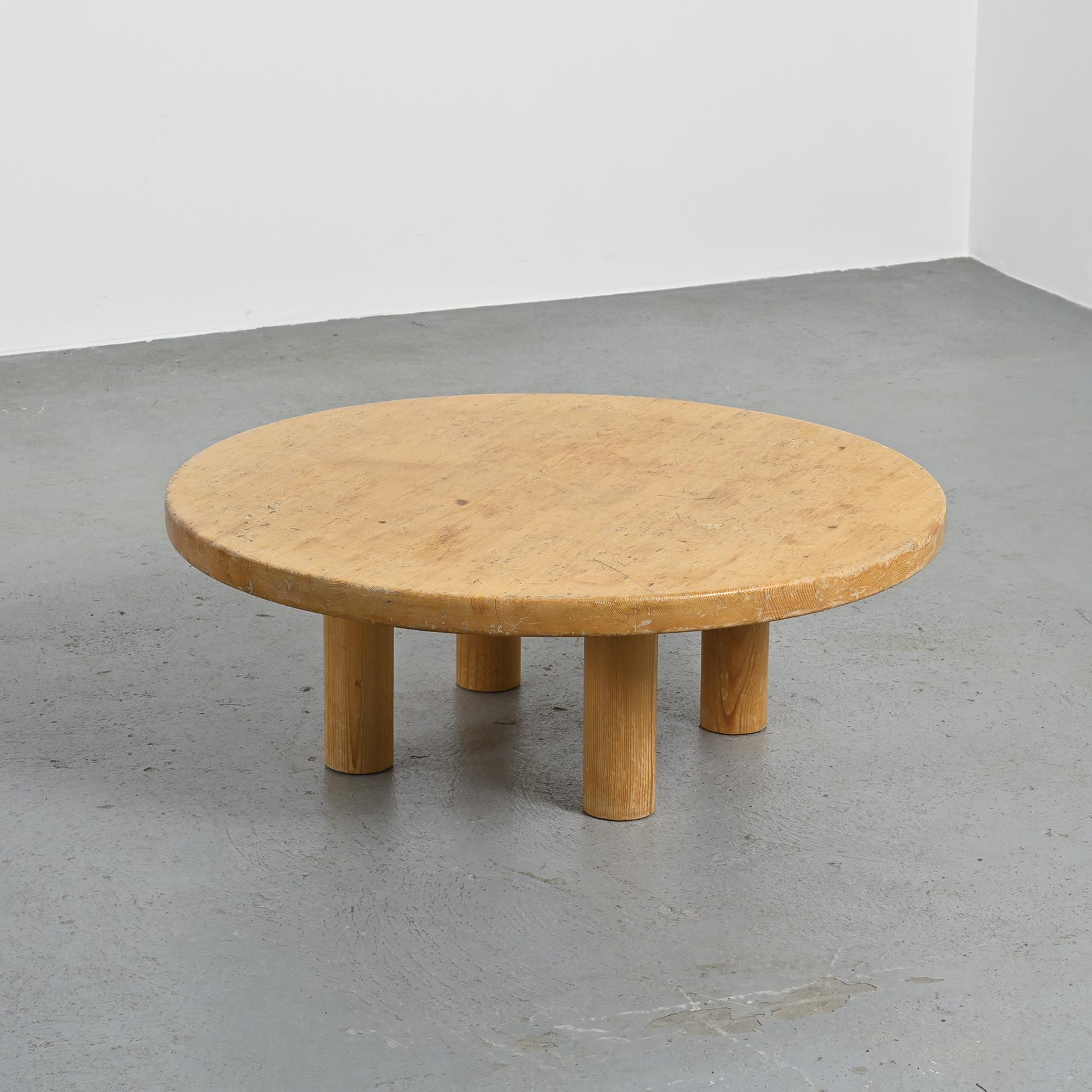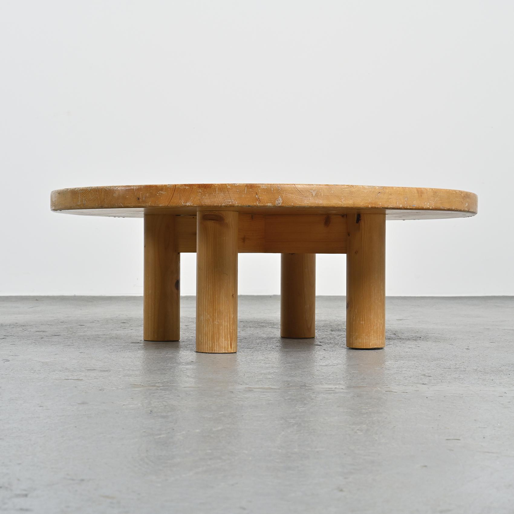 Réalisée en pin massif, elle se compose d'un large plateau circulaire reposant sur quatre pieds en rondin. Sa silhouette simple et robuste reflète l'esthétique montagnarde chère à René Martin, où le mobilier s'inscrit dans une logique à la fois fonctionnelle et chaleureuse. L'usage du pin et la géométrie épurée confèrent à cette pièce une présence sculpturale, en accord avec l'esprit moderniste des stations de montagne.