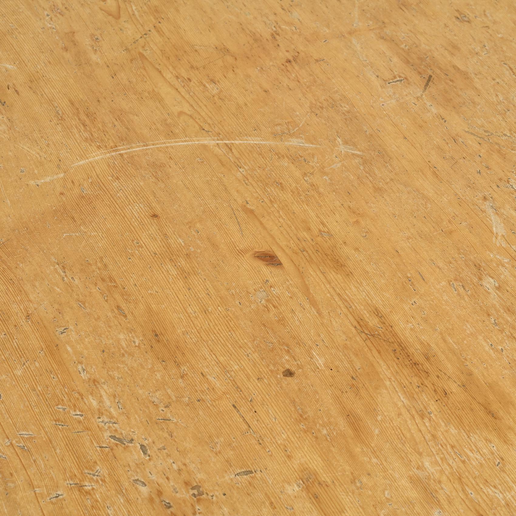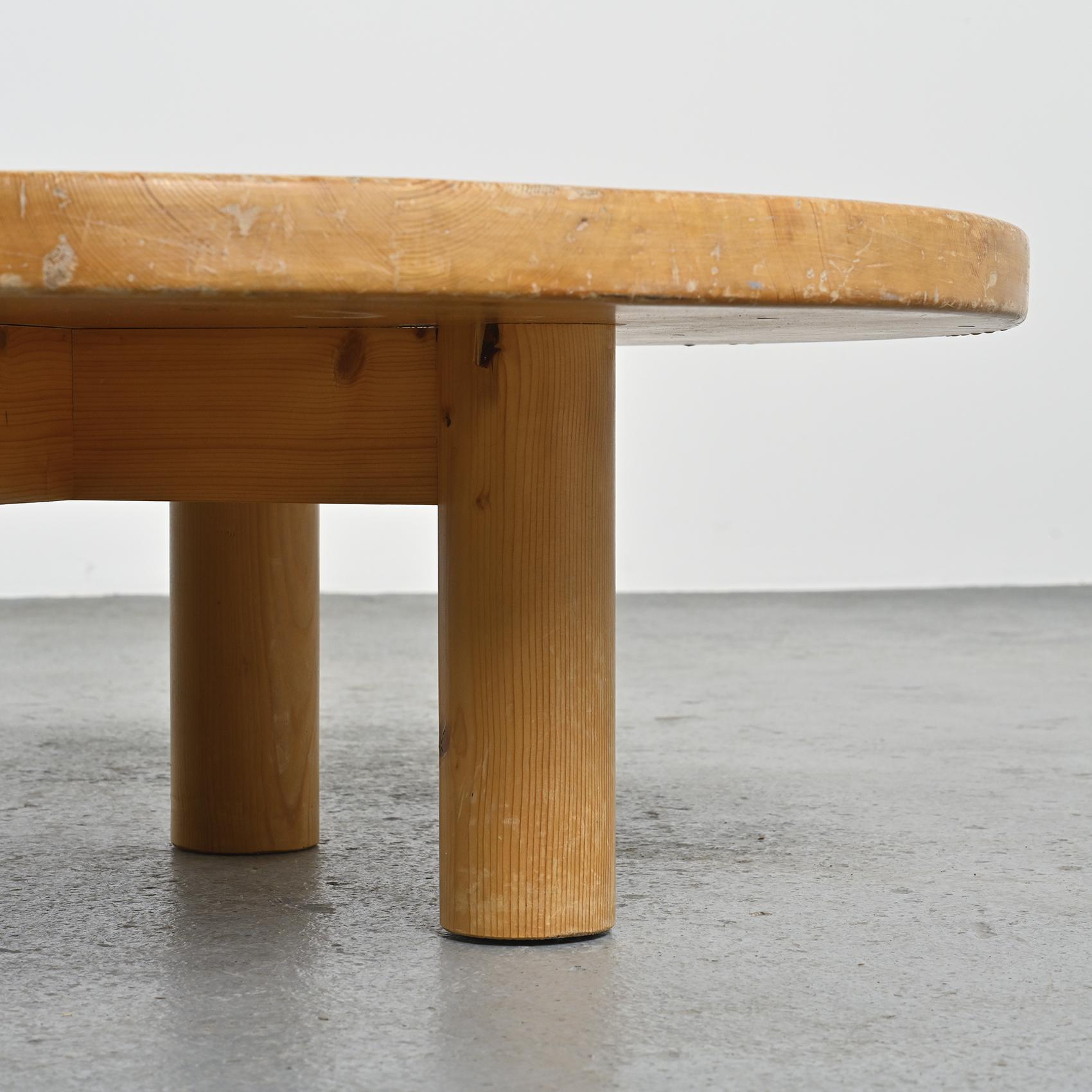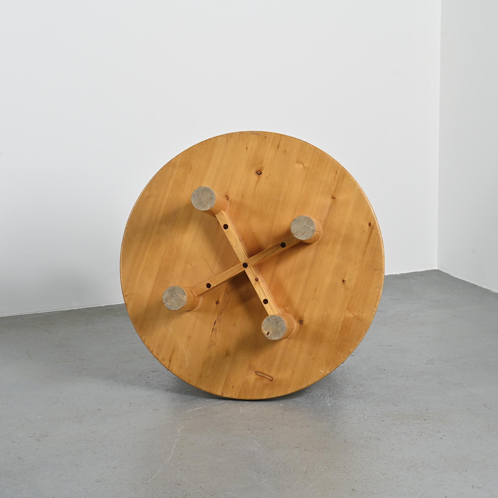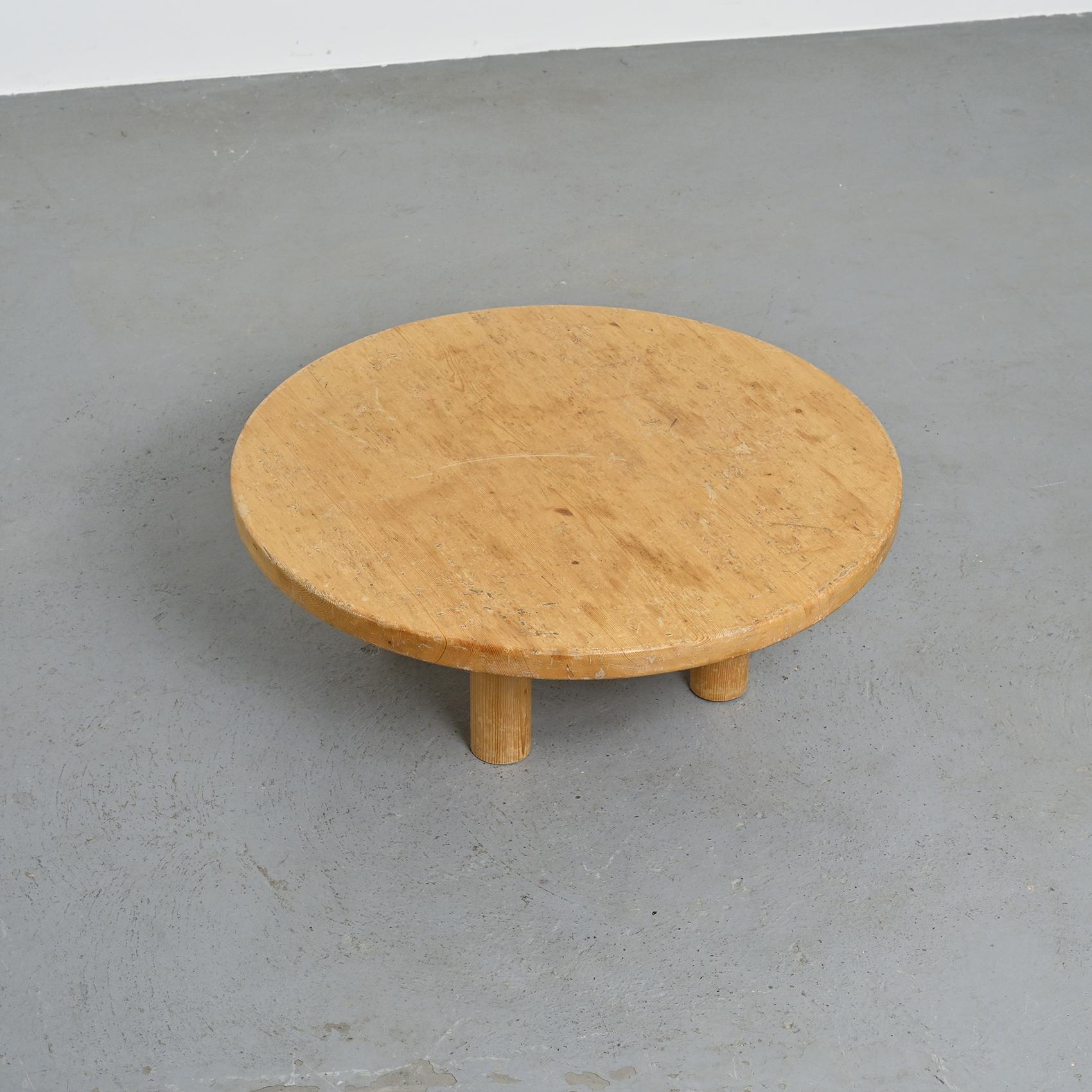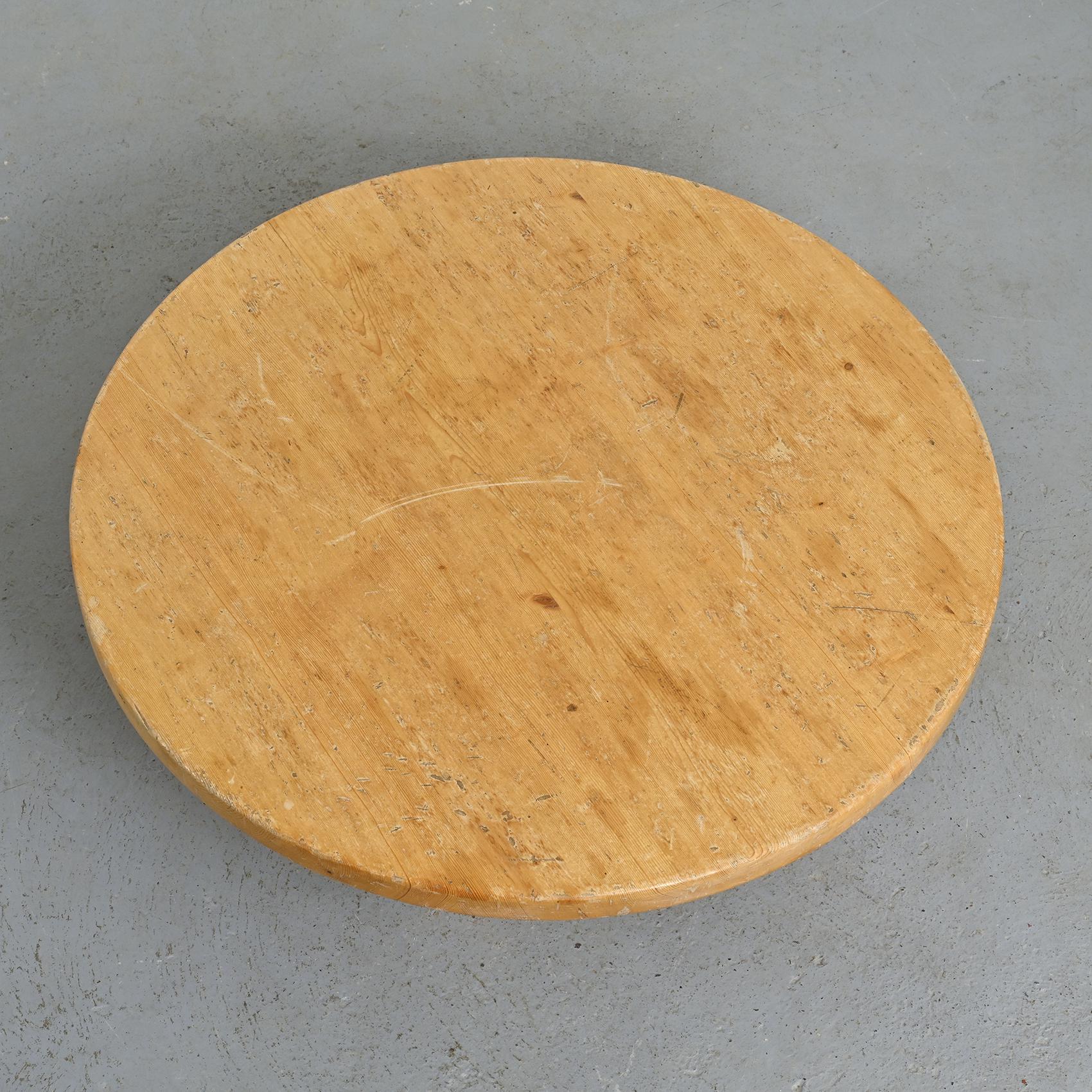 Réalisée en pin massif, elle se compose d'un large plateau circulaire reposant sur quatre pieds en rondin. Sa silhouette simple et robuste reflète l'esthétique montagnarde chère à René Martin, où le mobilier s'inscrit dans une logique à la fois fonctionnelle et chaleureuse. L'usage du pin et la géométrie épurée confèrent à cette pièce une présence sculpturale, en accord avec l'esprit moderniste des stations de montagne.