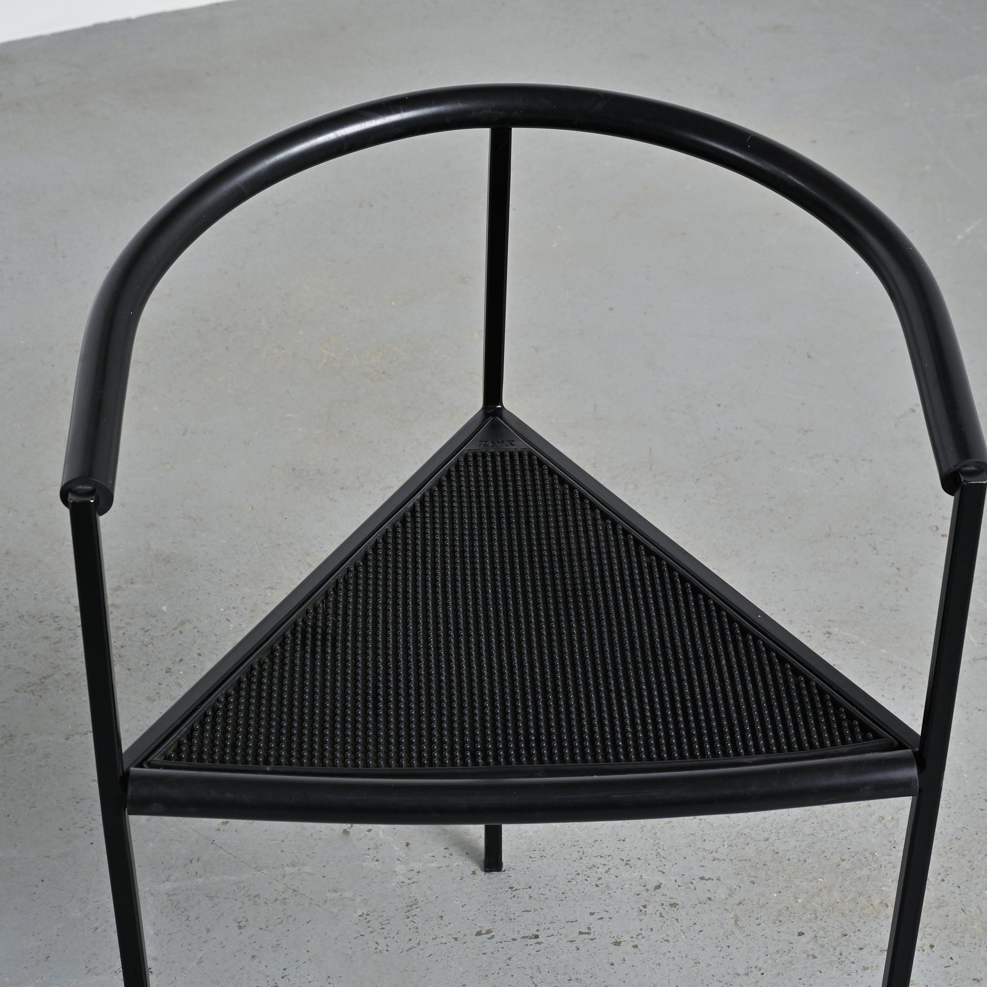 Chaque chaise présente un piètement tripode en métal laqué noir et un accotoir relié par une bande en gomme, élément caractéristique du langage industriel et expérimental développé par Zeus. La silhouette angulaire, la légèreté structurelle et le contraste des matériaux donnent à ces chaises une identité graphique forte et immédiatement reconnaissable dans la production italienne de cette période.