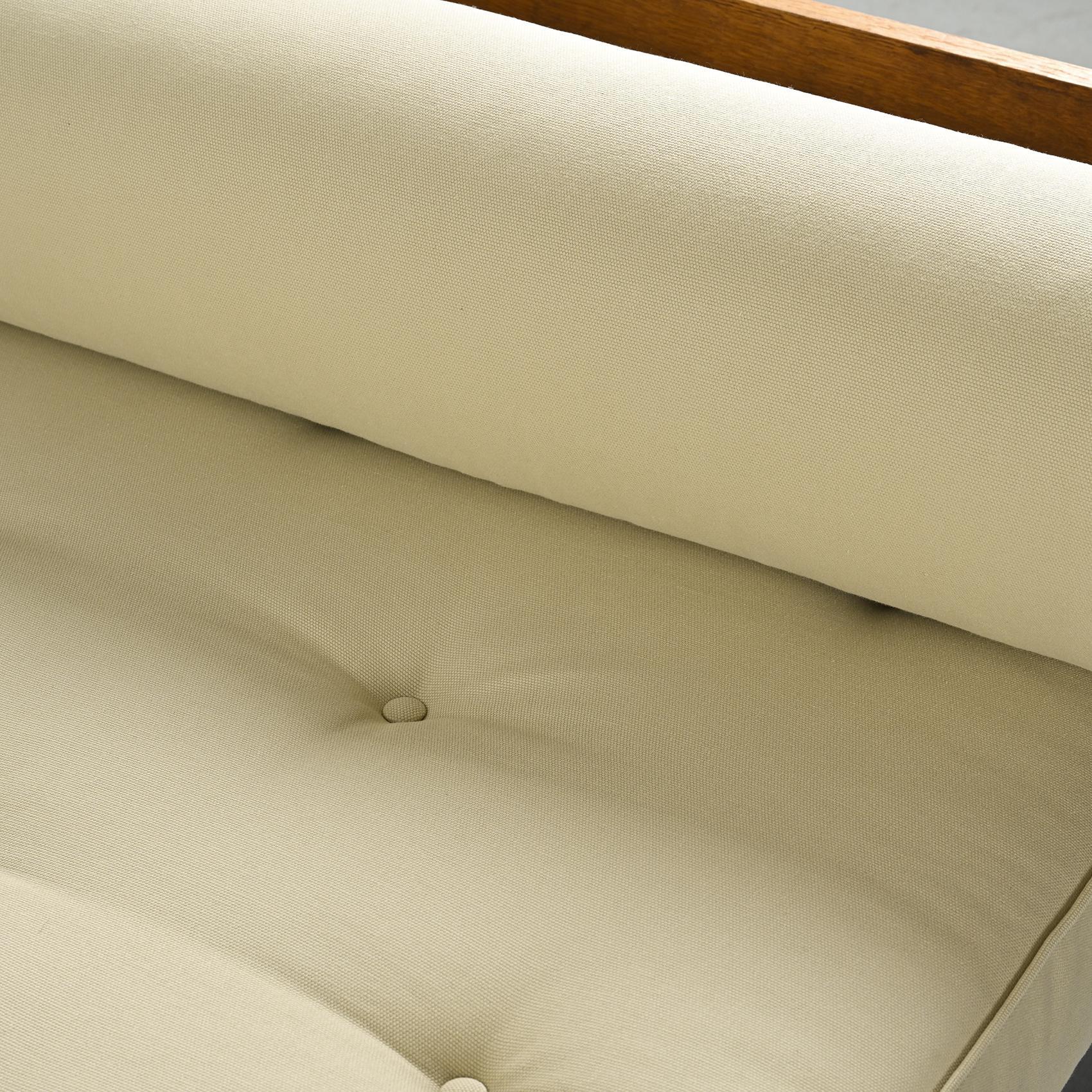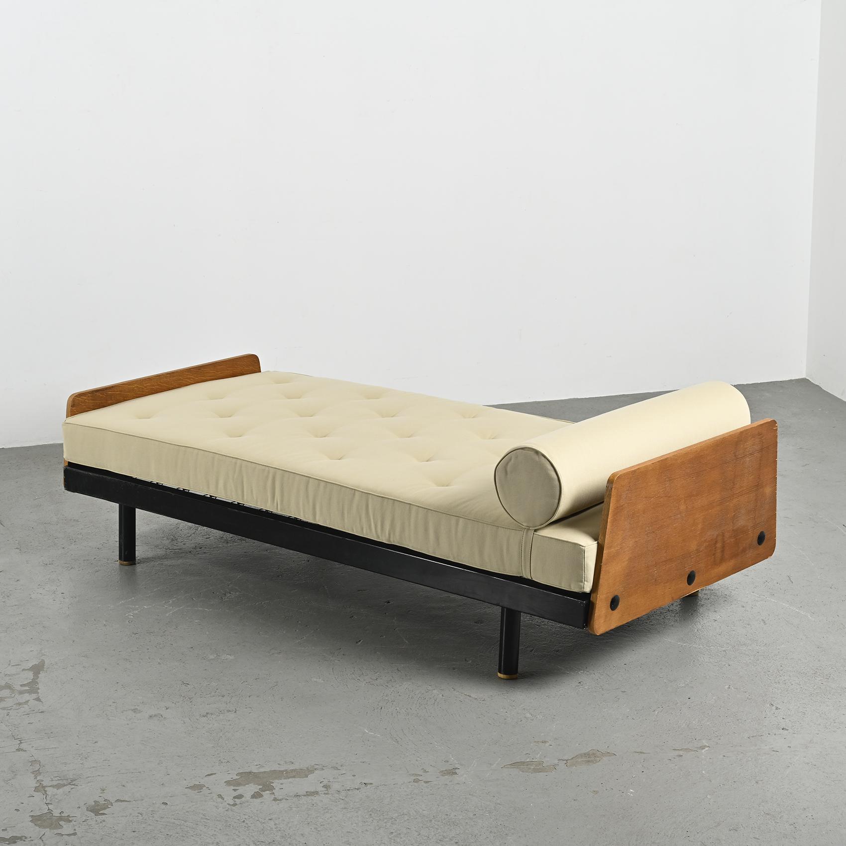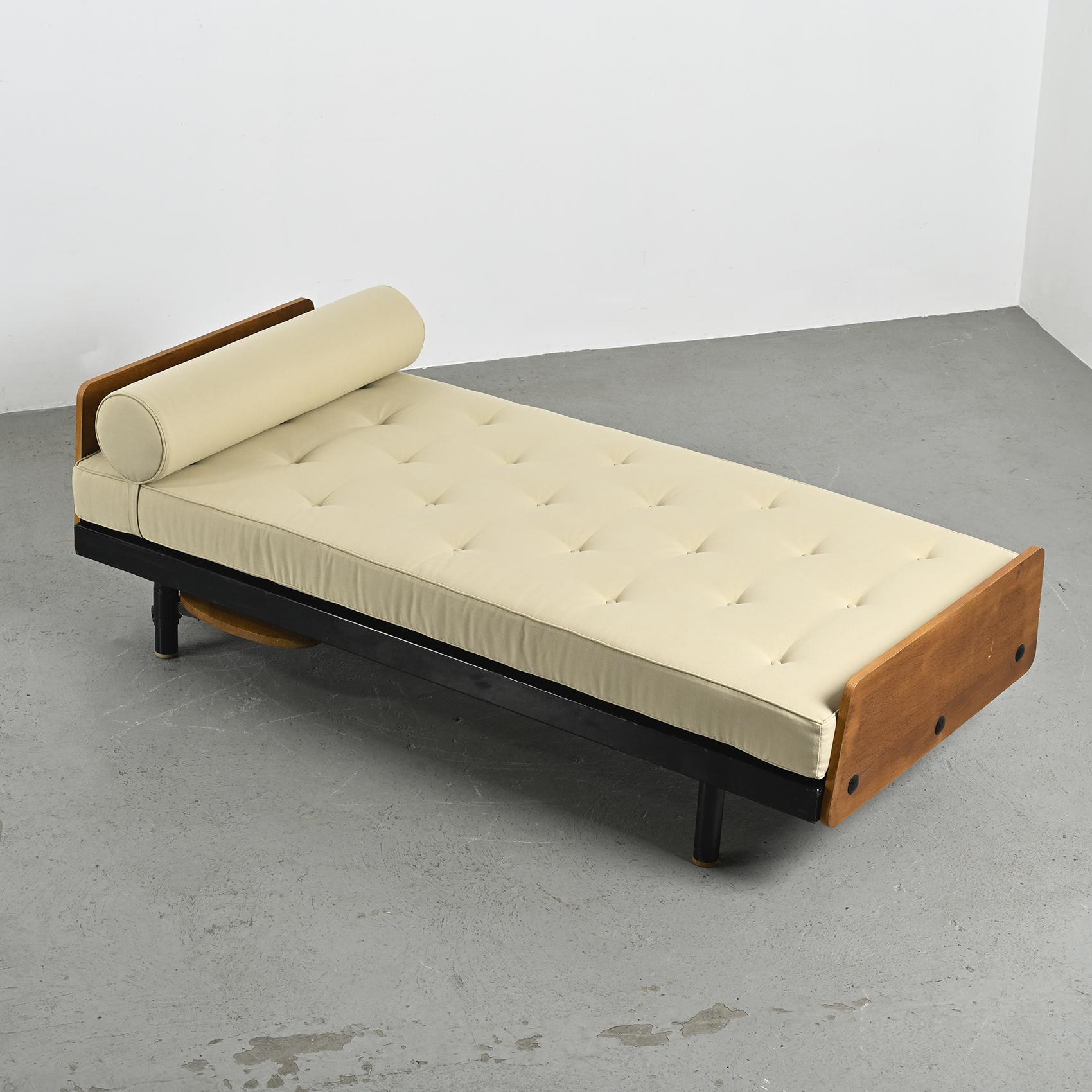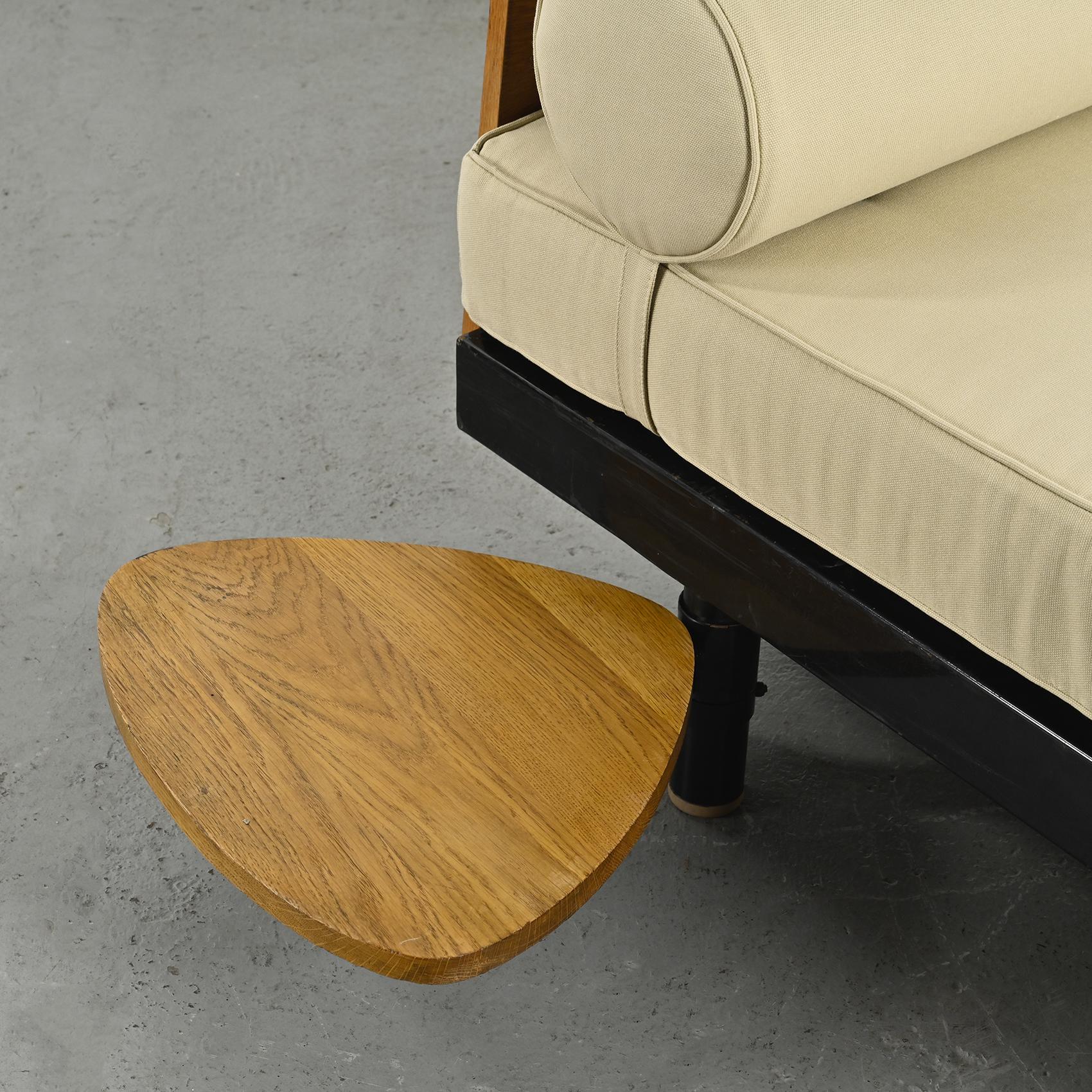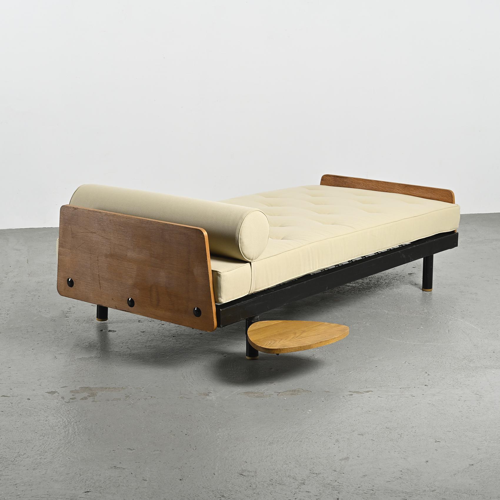 Lit de jour dit SCAL par Jean Prouvé, il s'agit de la variante à tablette pivotante conçue en collaboration avec Charlotte Perriand.