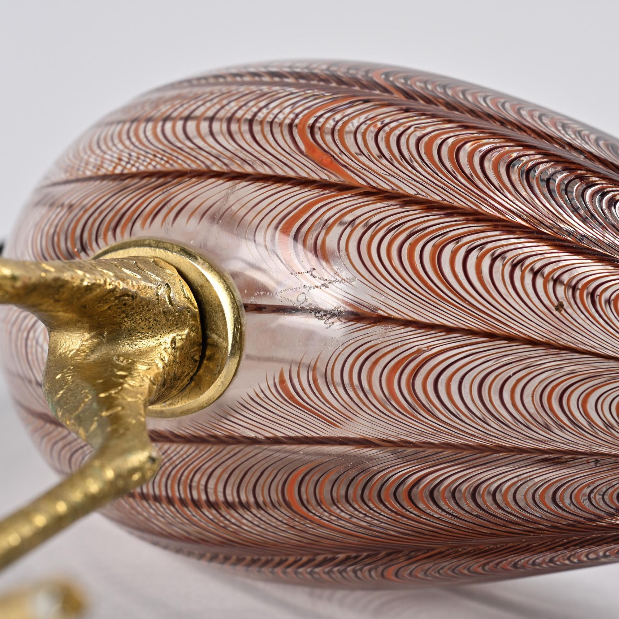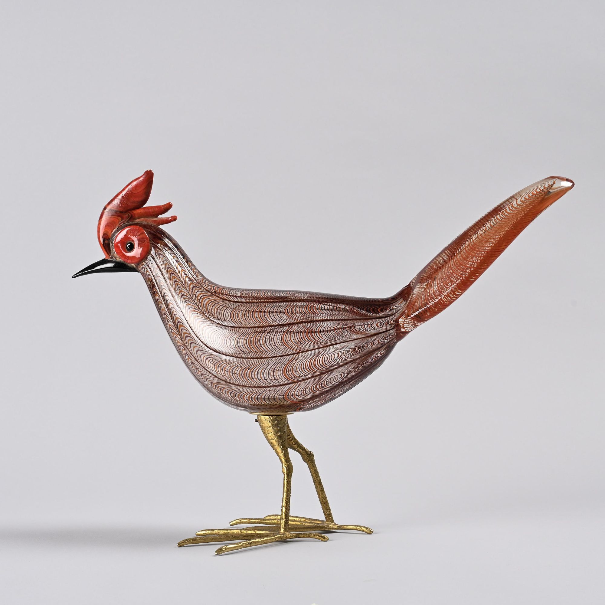 The piece features blended amber and red tones with delicate twisted canework creating subtle inner patterns. The elongated body rests on cast gilt brass legs, while the red glass head and comb catch the light beautifully. This work perfectly embodies Venetian expertise in animal glass art, balancing stylization and technical mastery.
