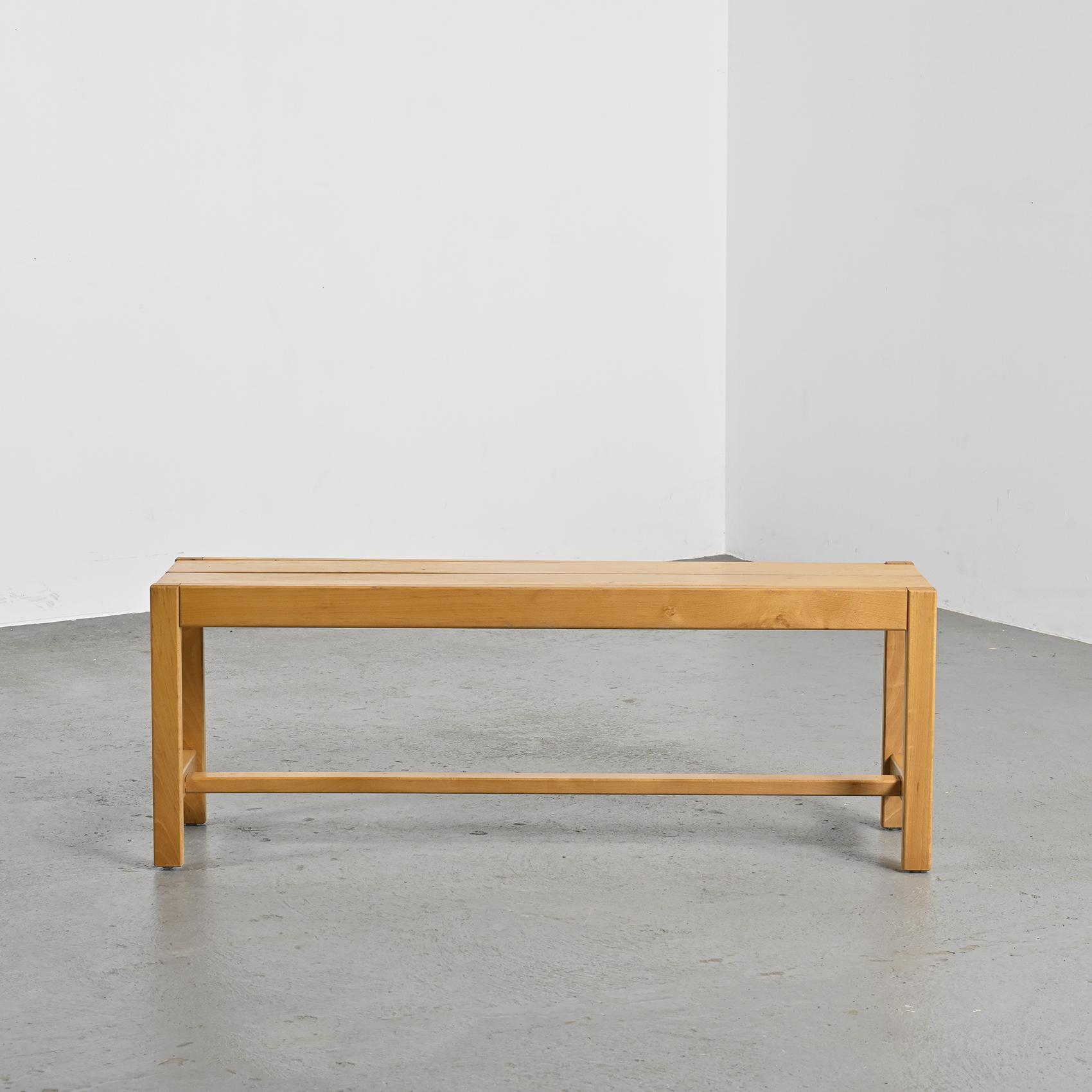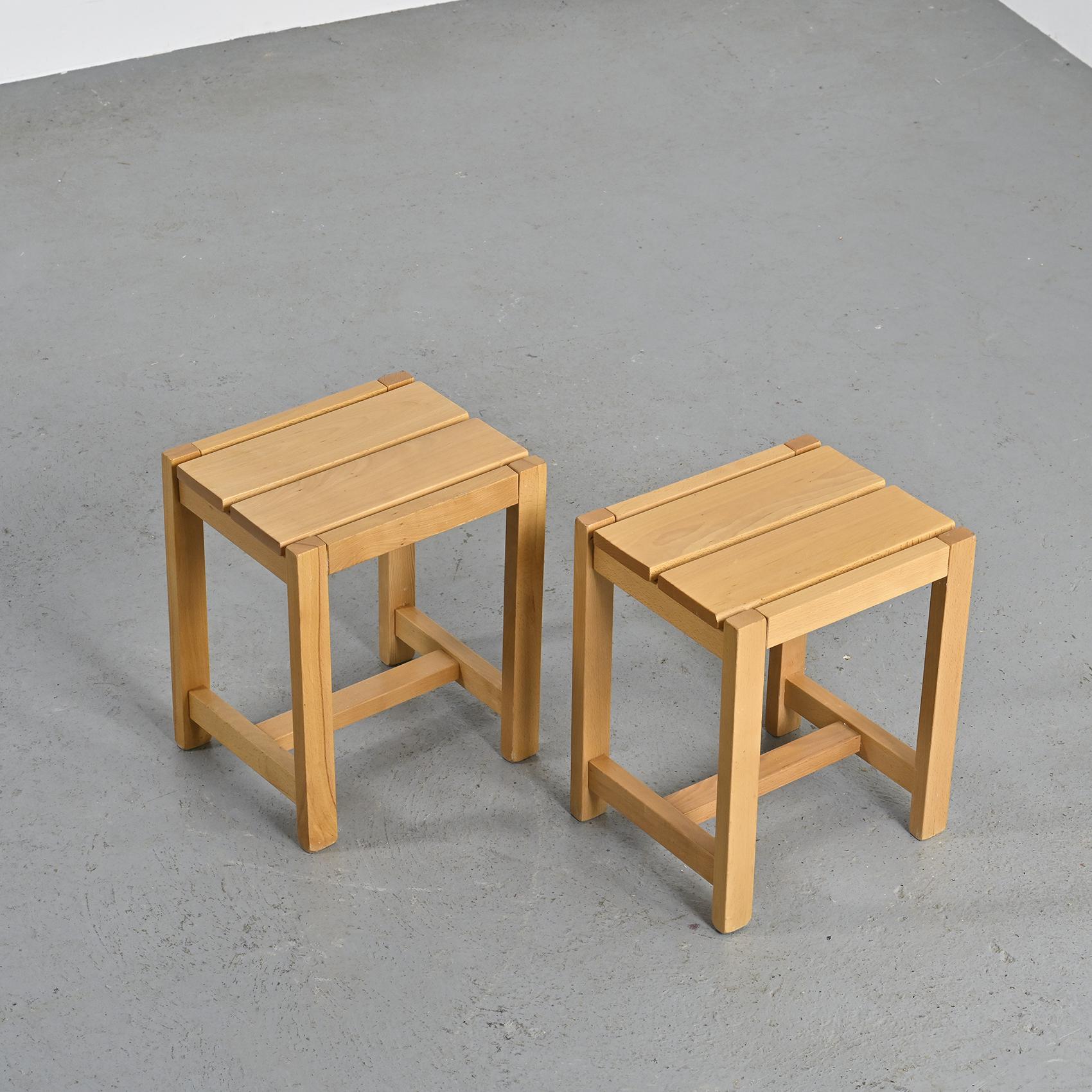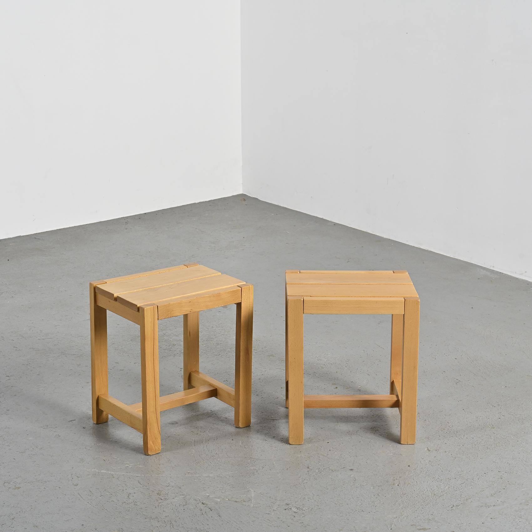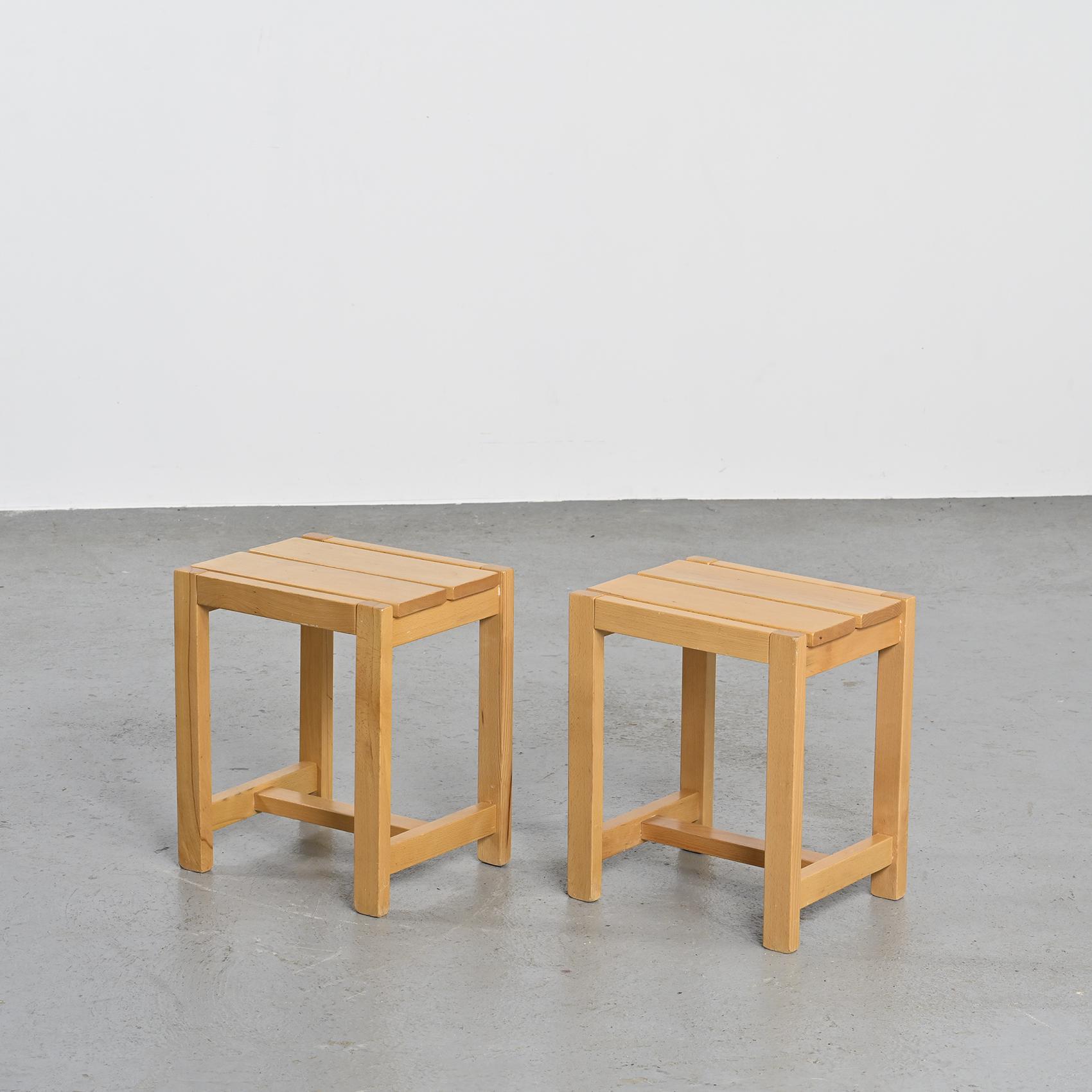 Each piece features a rectangular seat resting on straight legs with cross braces, recalling the architectural vocabulary of Regain's creations. The elm wood, with its warm and luminous grain, is finished with a satin varnish that enhances its honey tone. With their refined simplicity and solid construction, these pieces reflect the pursuit of furniture that is both functional and timeless.