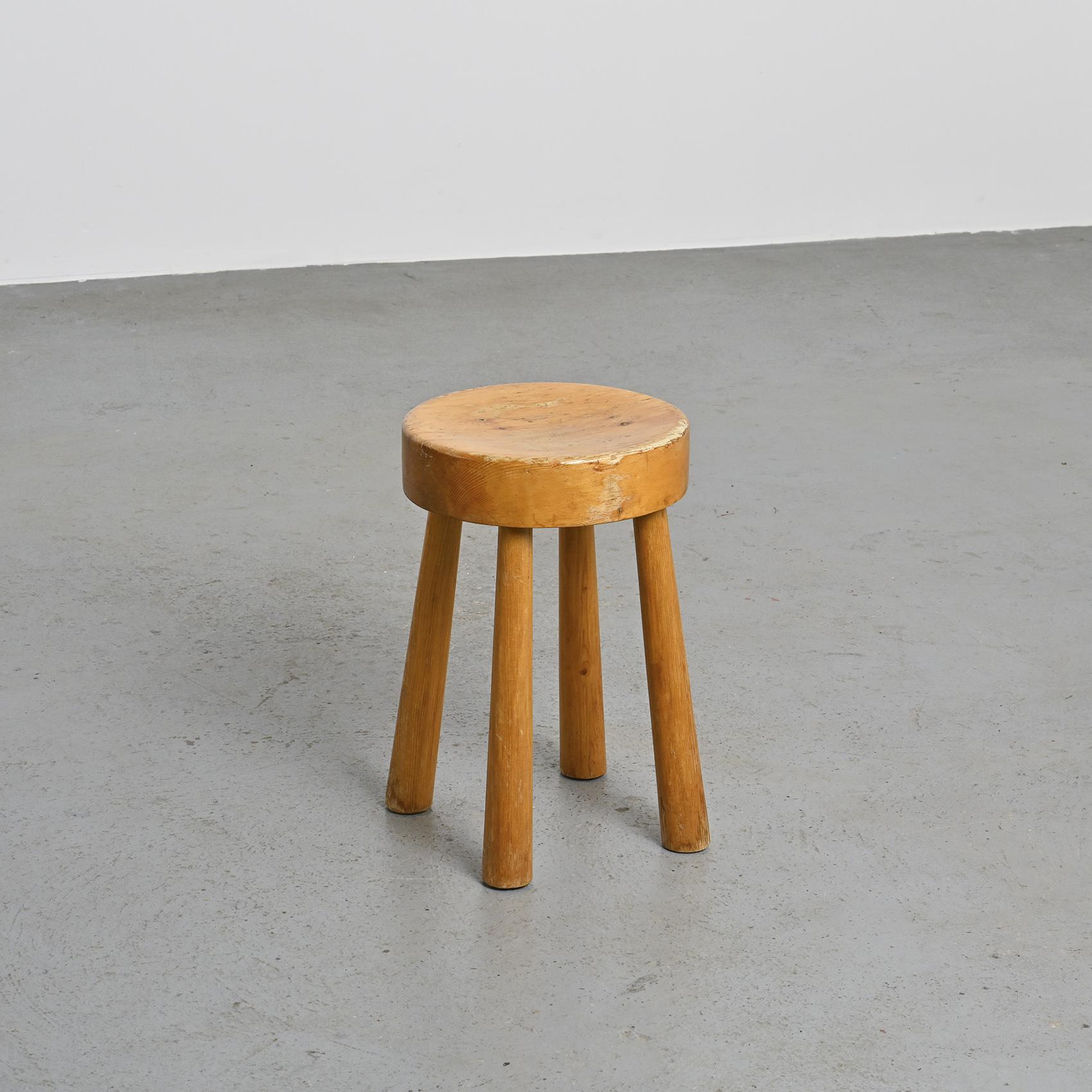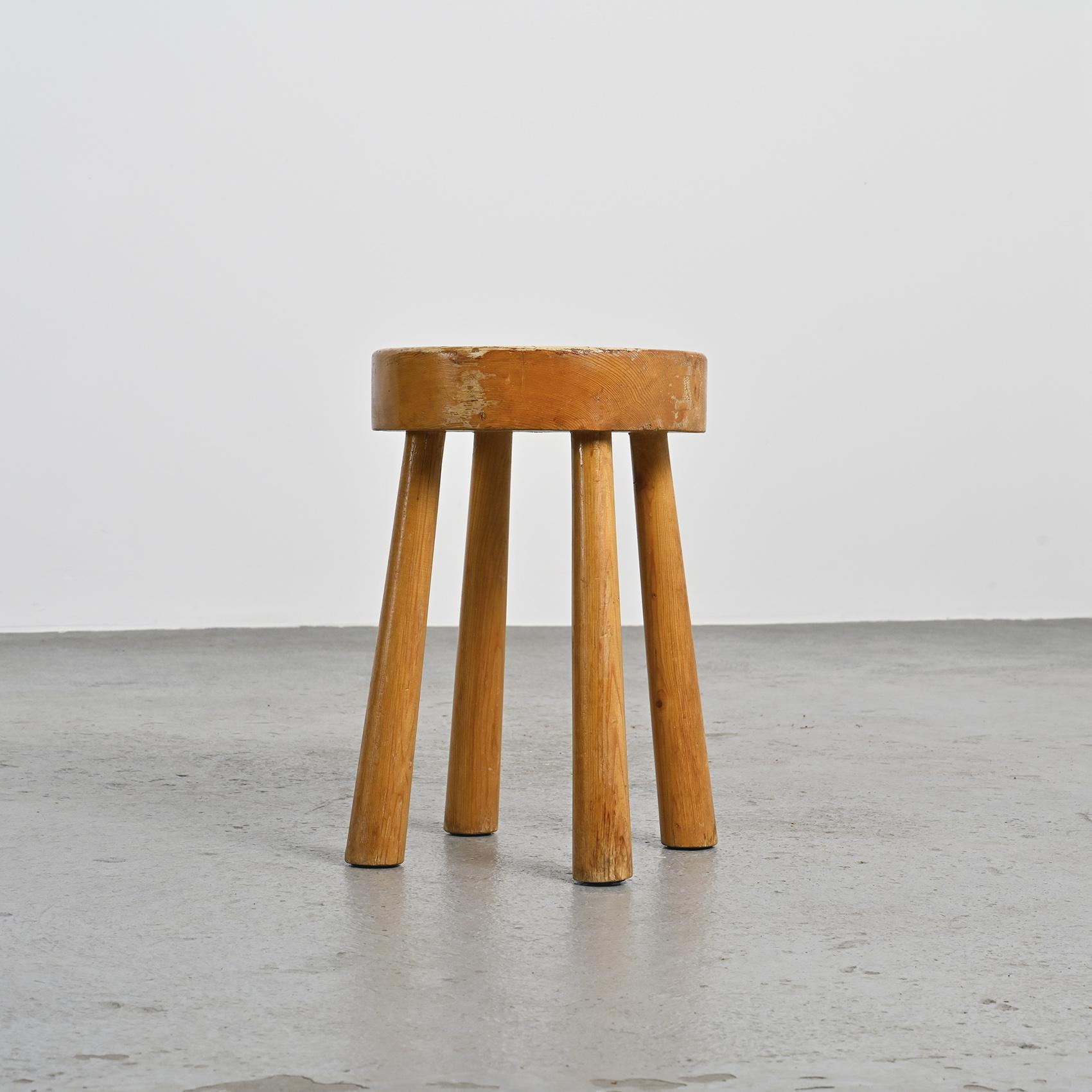 The thick circular seat rests on slightly splayed cylindrical legs, giving the piece great stability. The warm honey-toned patina highlights the natural grain of the wood, reflecting the honest, functional aesthetic characteristic of Alpine and modernist interiors from the 1970s.