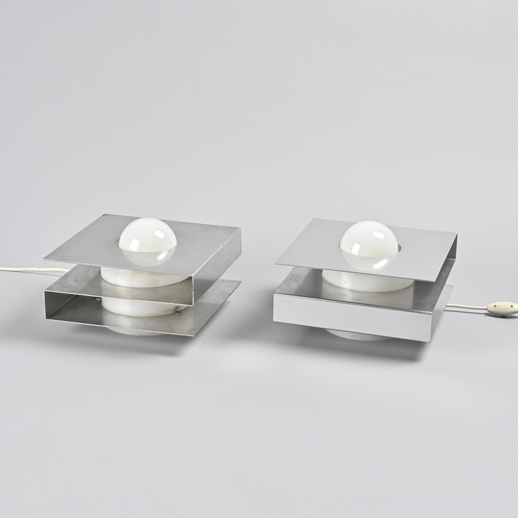 Each lamp features a folded aluminium sheet forming a cubic, architectural volume that encloses a plexiglass reflector, producing a soft and even light. The dialogue between the metallic surface and the translucent plastic embodies the refined aesthetic of late-1960s French design.